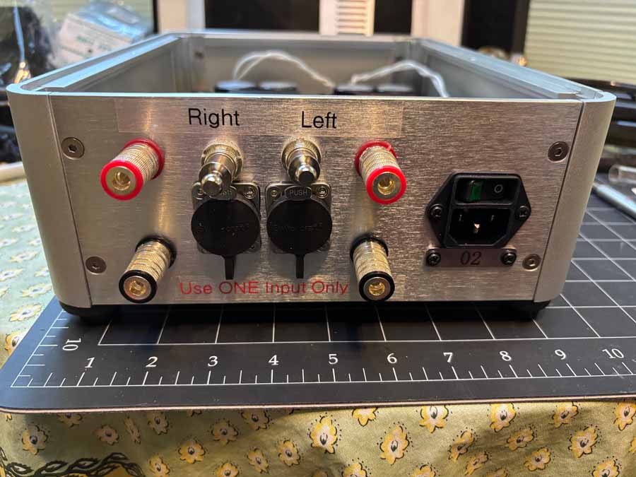 The off/on switch is part of the IEC terminal. Interestingly, only one box had a green LED on this toggle switch/IEC socket to tell me that I had indeed turned the toggle switch to “on”. Luckily, I persevere,d and the non-LED-supplied amp worked just fine, though it did give me a few seconds of worry it wouldn’t work.