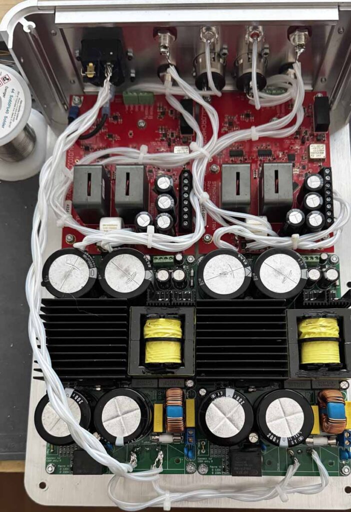 The inside of the amps uses Leo Ayzenshtat’s optimised ULTRA balanced GaN-FET modules from Orchard Audio, powered by a custom 800W switch-mode power-supply with soft-start and ultra-high frequency switching (see earlier) for very low EMI and very high efficiency. All in/out and power-supply cables are twisted-pair ArgentPur solid silver in Teflon air-tubes. Capacitors in the critical signal path are Mundorf SGO (silver/gold/oil) varieties, intending to give good resolution and soundstage realism as compared with other GaN-FET, or indeed Class-D designs. Connectors are all silvered, plus Ernest has used Mundorf Supreme Silver/Gold solder. Ultimately, there is silver from start to finish! As Ernest told me, as no valves or other buffers are getting in the way to colour the sound, “thus (we have)the preverbial ‘straight wire with gain’”. Indeed, his connection with Peter Walker from Quad, who created that famous phrase, is that “Michael Rudd, a former Peter Walker student, provided Ernest with “a wealth of knowledge”. Underneath the aluminium box is a rubber sheet (and there is also another one inside the lid), which is for vibration damping, plus there are some vents underneath in case it gets hot (which it certainly didn’t!)