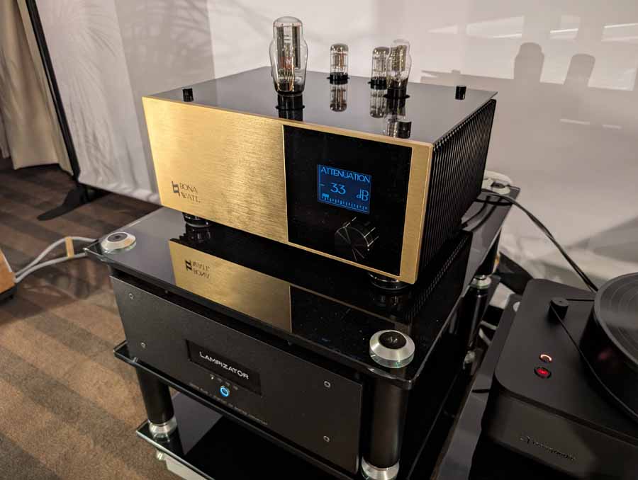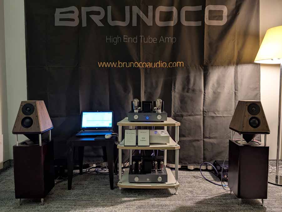 Brunoco audio products are made in Korea, in limited runs, and they were showing off their Terra 6L6PP and Terra 300b integrated amps, alongside the OmniONE omni-directional 3-way speakers. These are not conventional looking speakers, their unique design is quite cool, and the sound coming from them was incredibly lifelike. They have an up-firing woofer, with front firing dedicated midrange, and tweeter. The amps are lovely too, and it all forms a natural, organic sounding setup.
