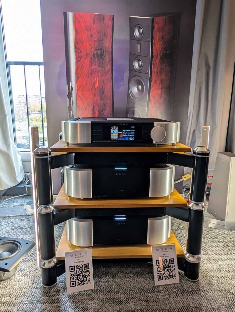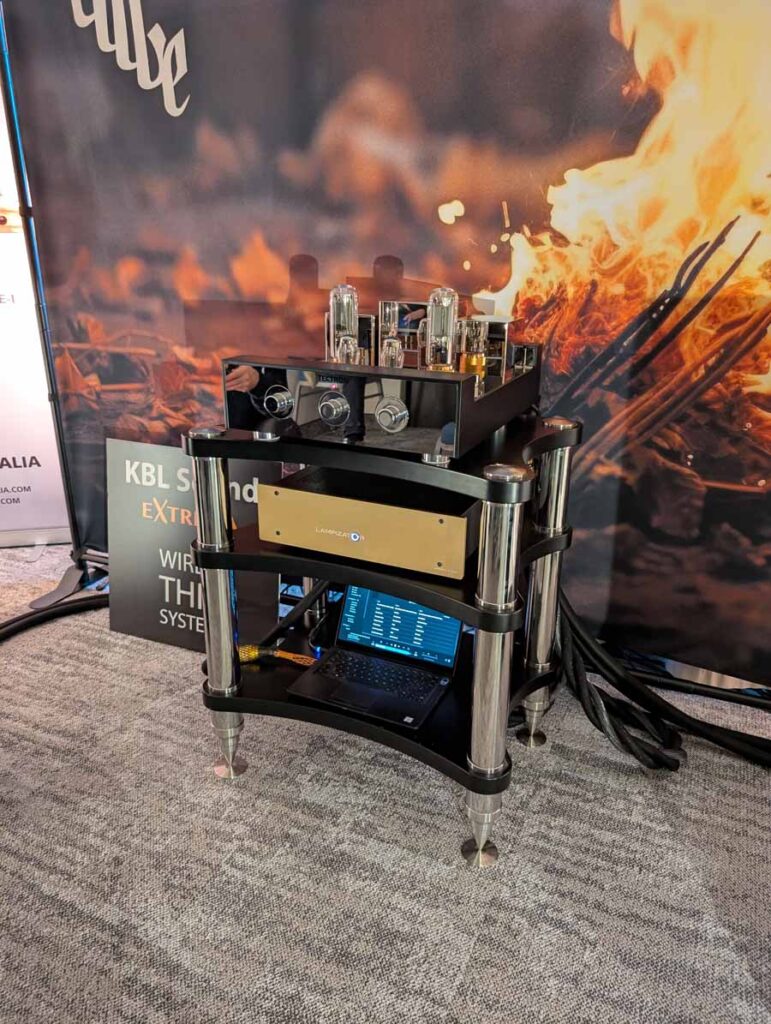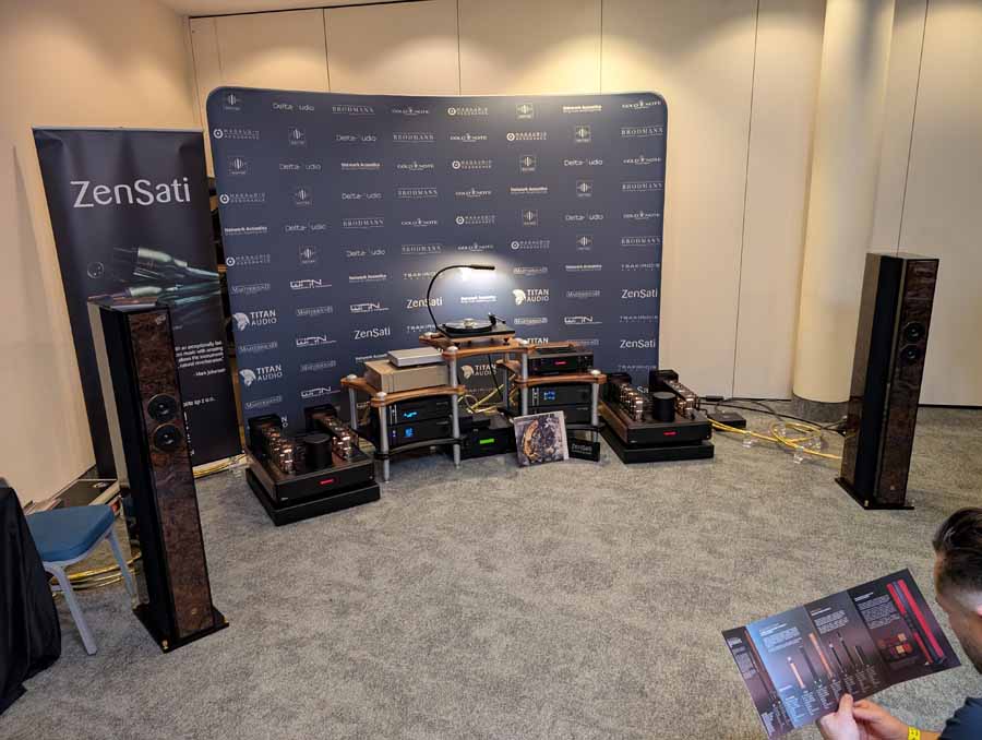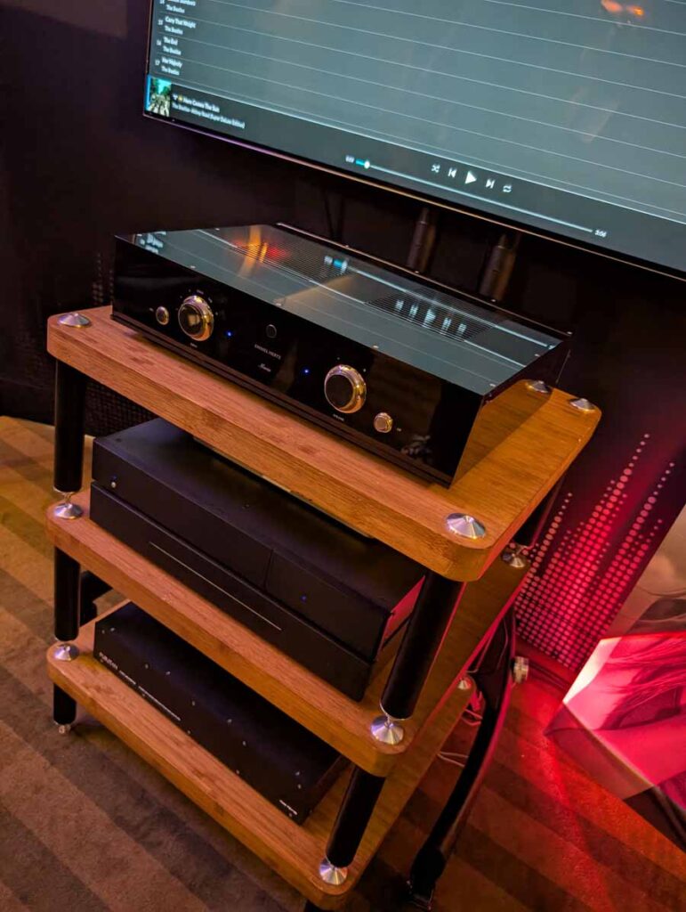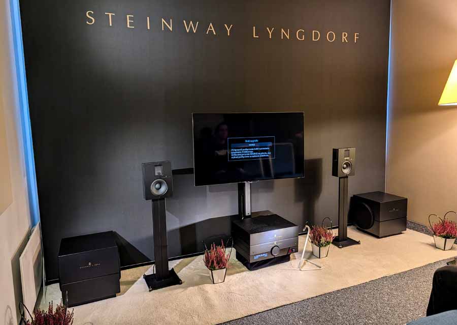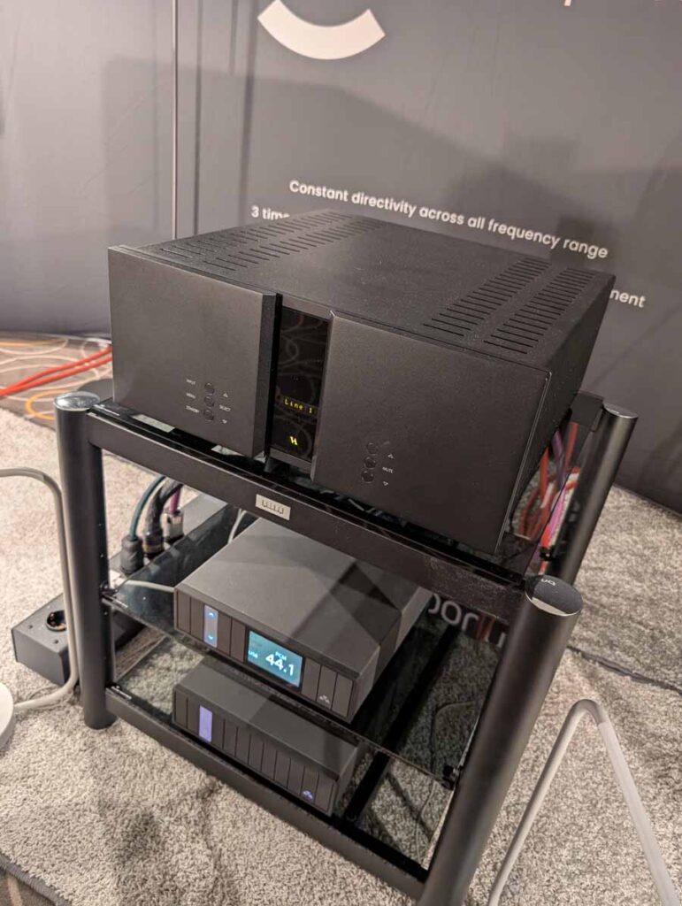 Well known for their RoomPerfect room correction DSP, Lyngdorf showed off a system consisting of a small pair of stand mounts and a pair of their subs – all dialled in with their RoomPerfect correction, allowing this system to have body, depth, and clarity from a small-ish system.