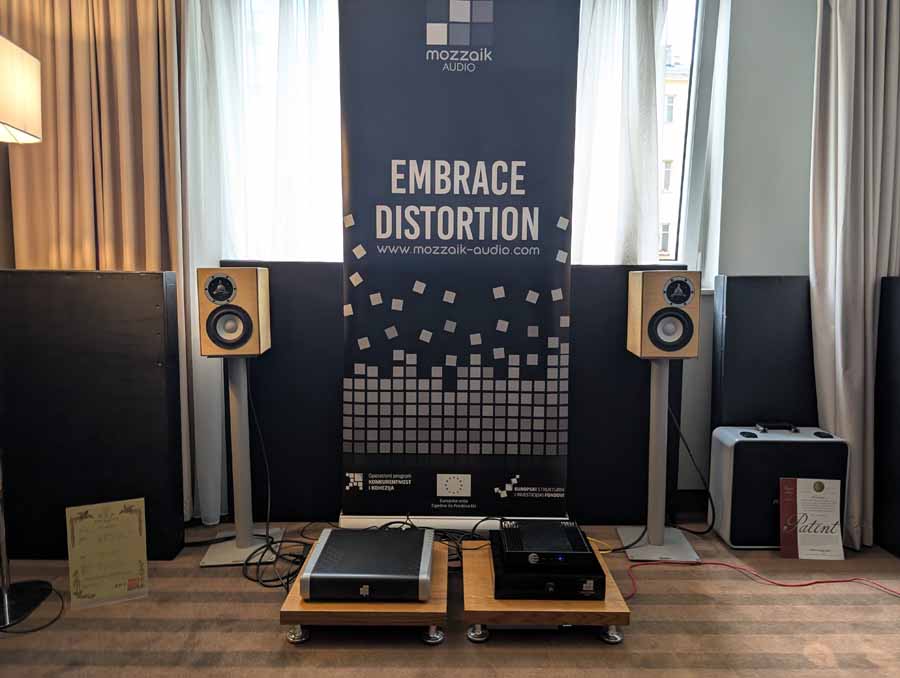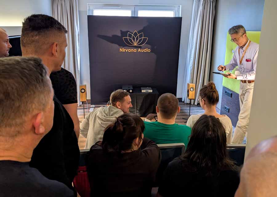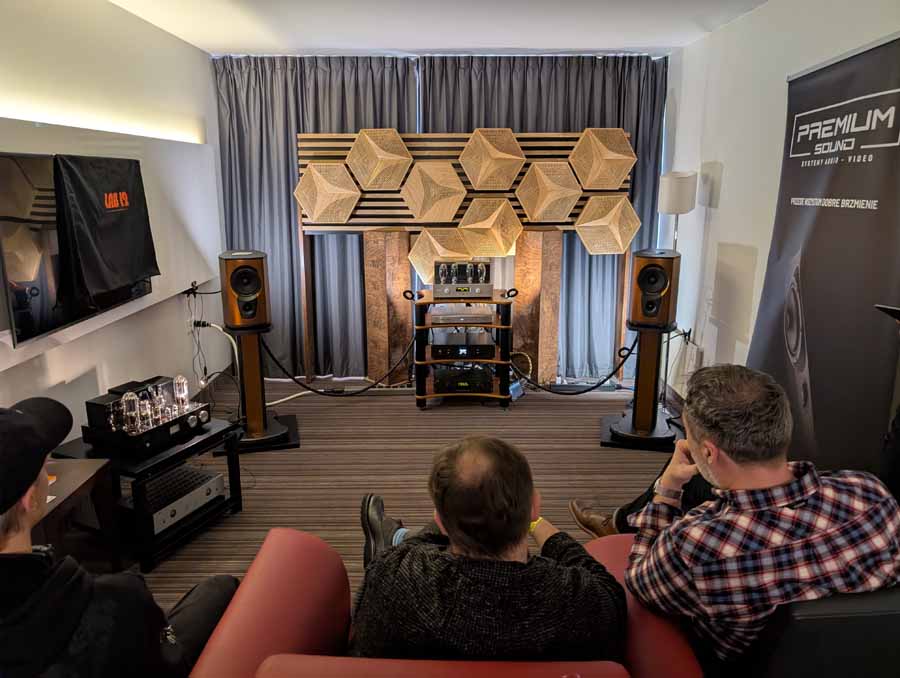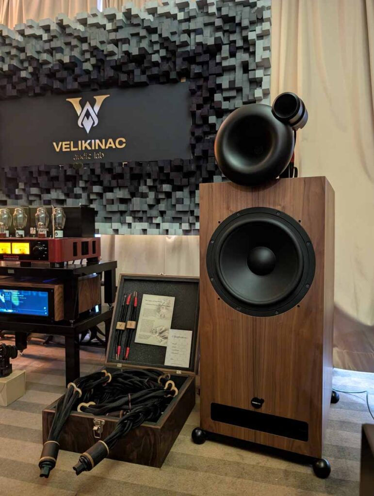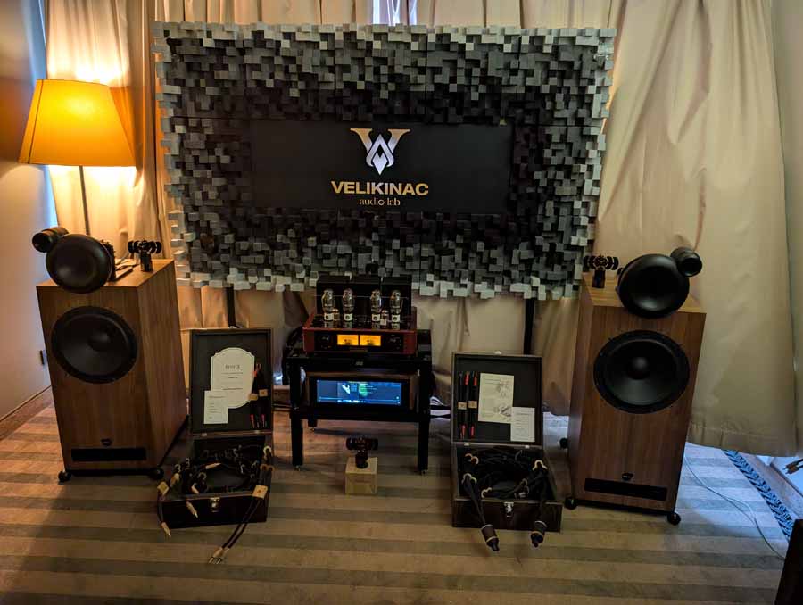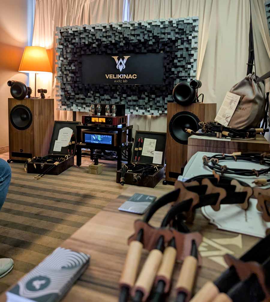 Showing off their range of cables in this room, Velikinac also introduced their FakirOne and Differo II SE speakers – these were paired with a Trafomatic amplifier, and some interesting looking resonators around the room. Nice, easy listening through this system, with a full, smooth sound.