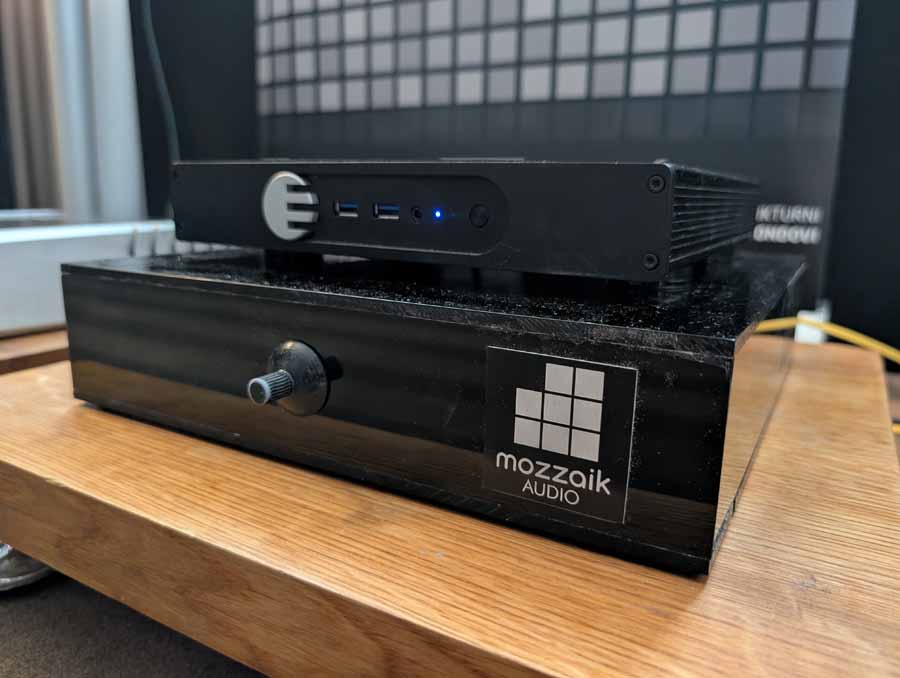 Euphony makes software, which will organise and play all your local music files (PCM and DSD), you can control the software via a web interface or smartphone/tablet. There are a few companies offering this kind of solution, and it seems slick for local media file playback. Mozzaik on the other hand, make speakers and electronics, they were showing their latest speakers and improved DSD up sampler that is made to be used with Euphony. This was a simple setup, yet the sound that was coming out was impressive for its size, the smaller speakers held their own in here.