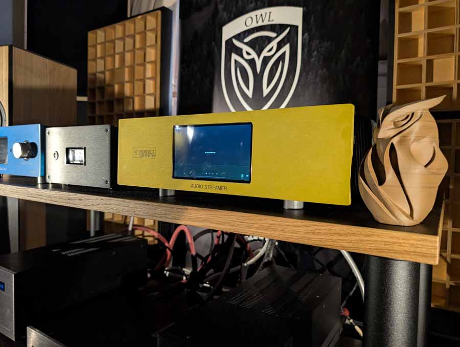 This is Owl Audio’s debut at the show; they make speakers built on entirely in-house engineering and design. They were using a MuzgAudio reference DAC-01LE, Perfect Connection streamer, Audionet Pre 1 G3 and a pair of audionet monoblocks. They had a pair of stand mount speakers, and a pair of floor standers in this room, the floor standers were playing and sounded great – they use an AMT tweeter, dedicated mid driver and dual bass drivers. Great clarity and detail combined with punchy and deep bass and a natural midrange.
