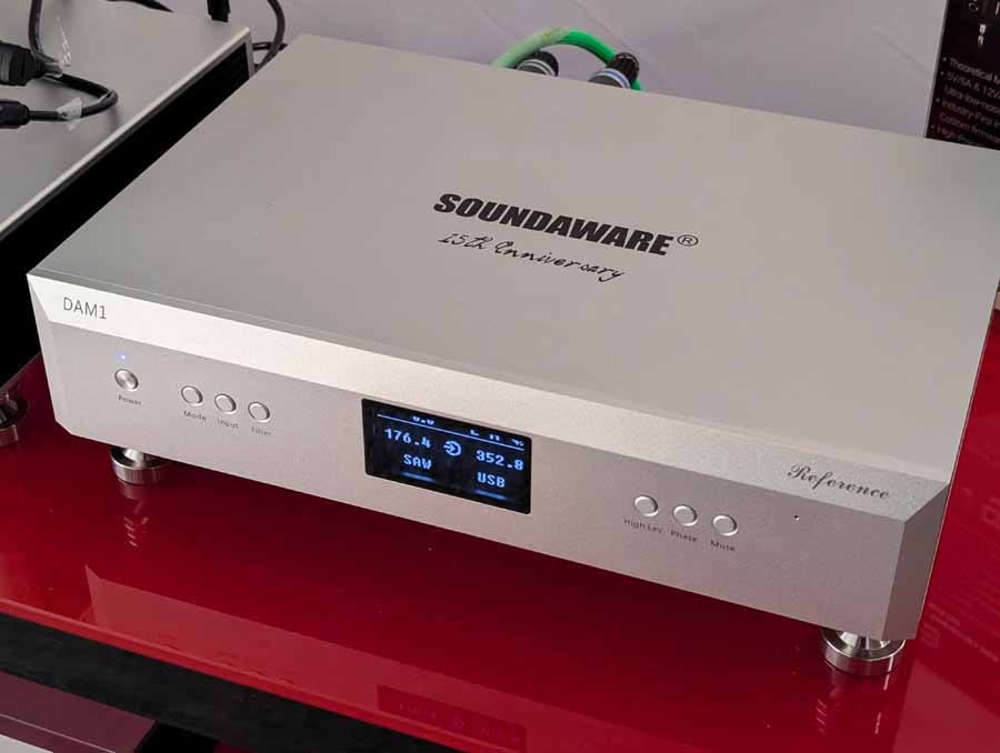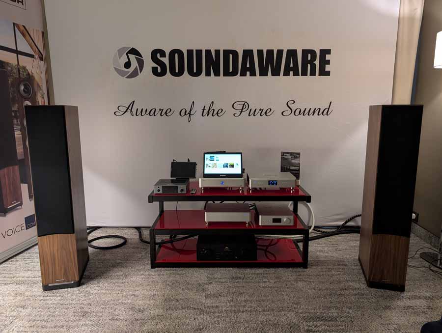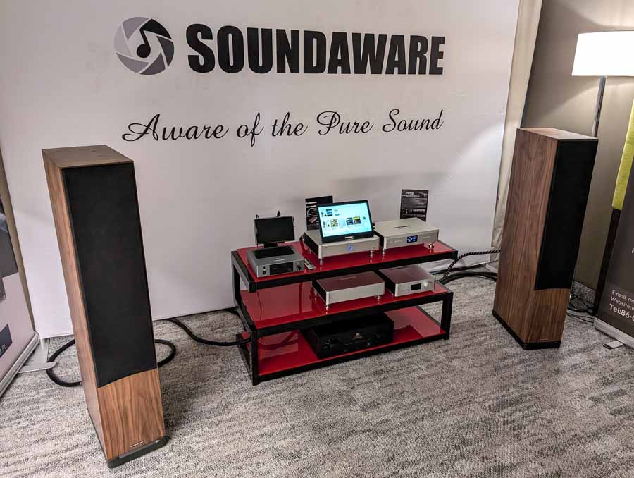 Soundaware make quite a few components, this year they launched new network streamers, audiophile grade storage devices, audiophile grade network cards, and other bits of kit including DACs, and portable DAC/Amps. They have a wide range of products that cater to quite a few different needs and fit into varied systems. They had a system using their own server, DAC + DSP, linear PSU, and Spendor speakers being driven by a M2TECH Classic integrated amplifier. The Soundaware kit is well crafted and the new D1X server uses an audio grade motherboard – very neat indeed. Overall, this was a very well-balanced system.