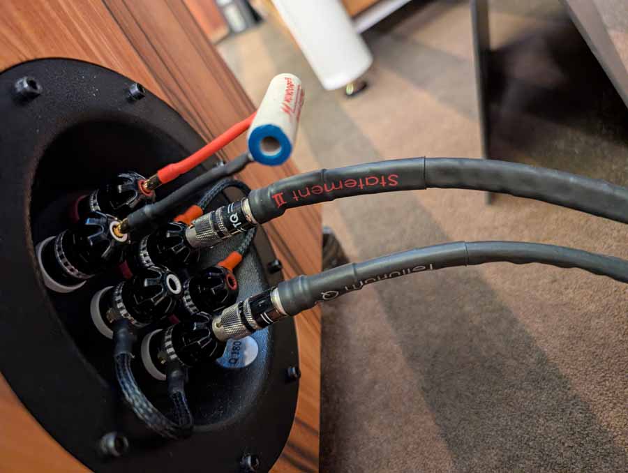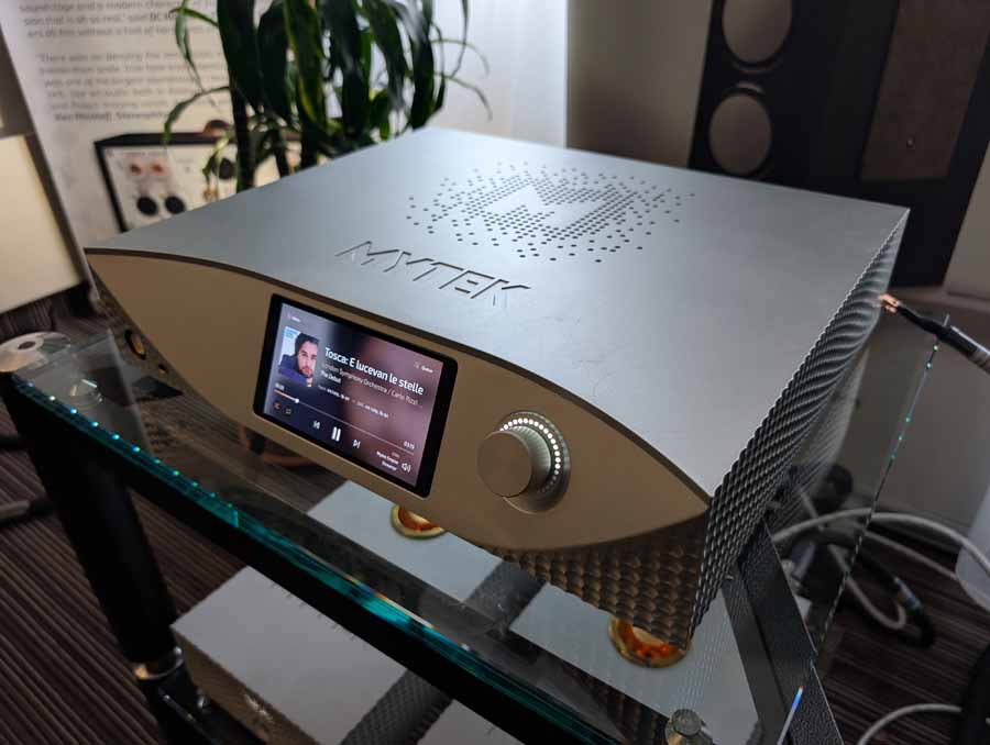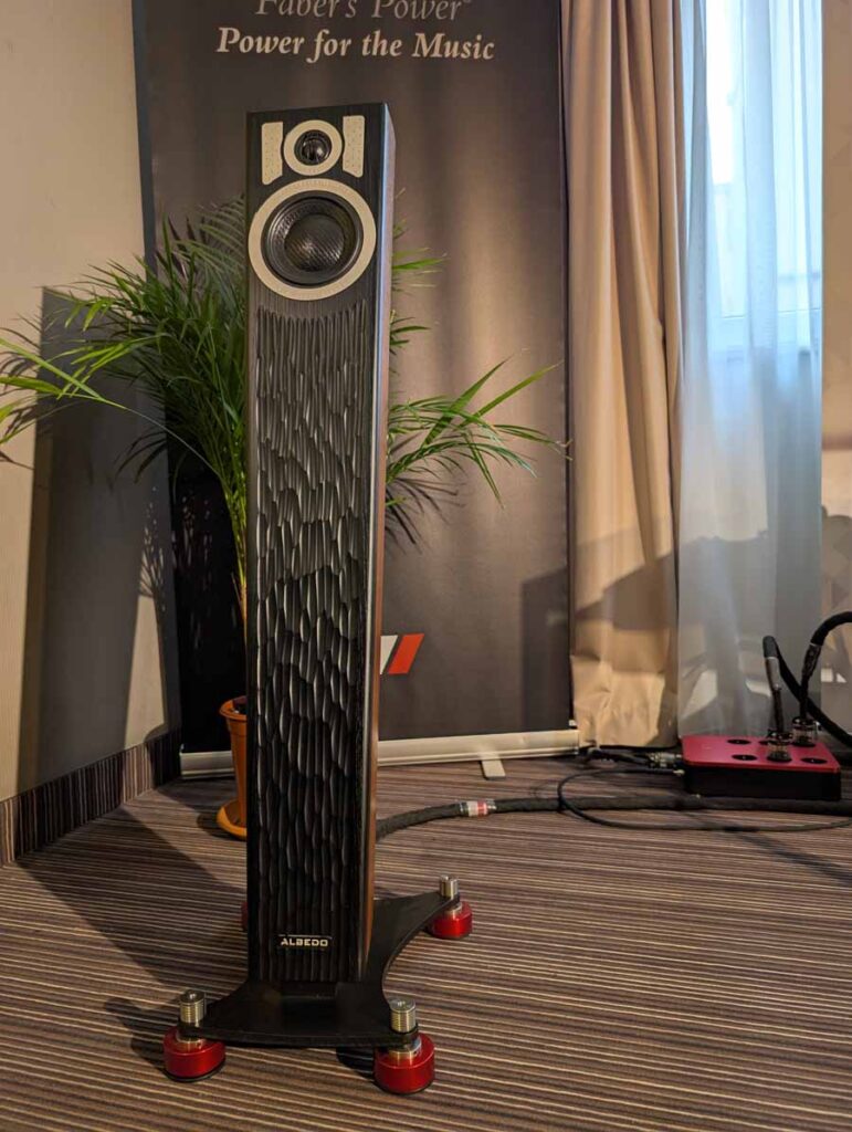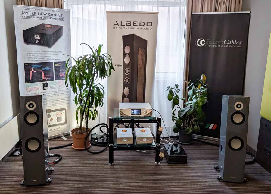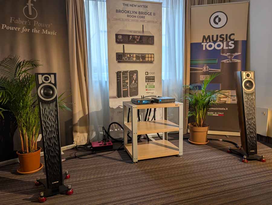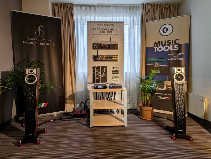 In the first Mytek room they had some thin Albedo speakers and the Mytek Brooklyn Bridge II and Amp powering them – these speakers sounded impressive for their size, they were using Faber’s cables and mains distribution in this room.
