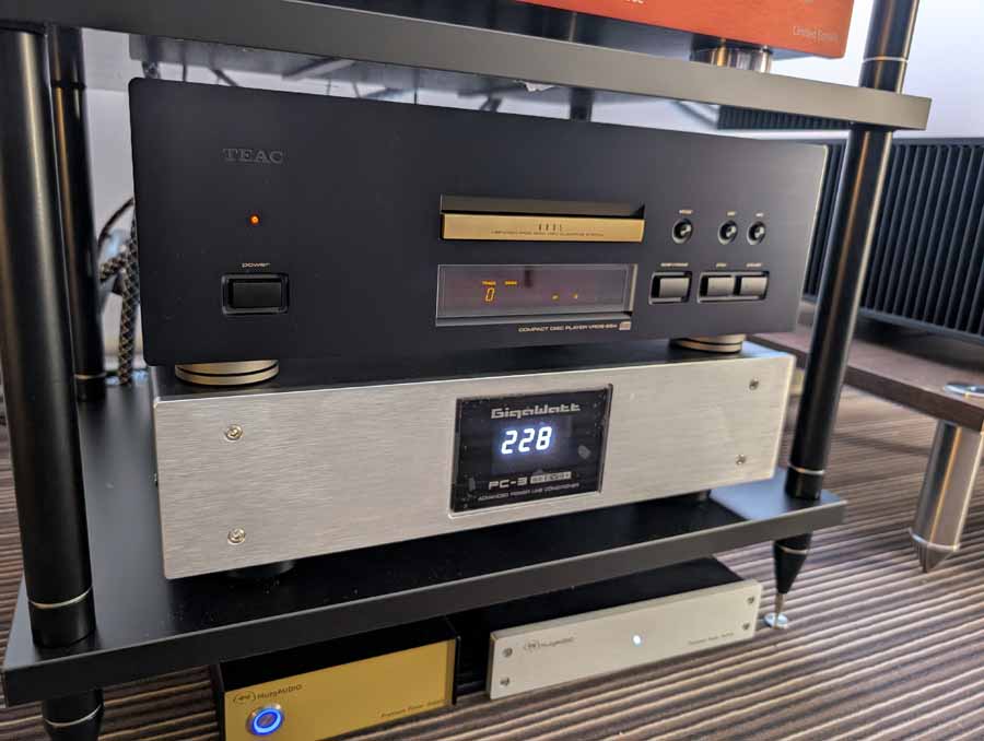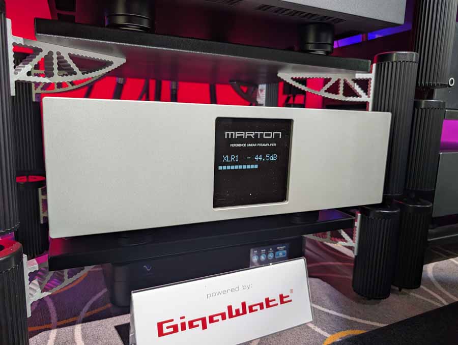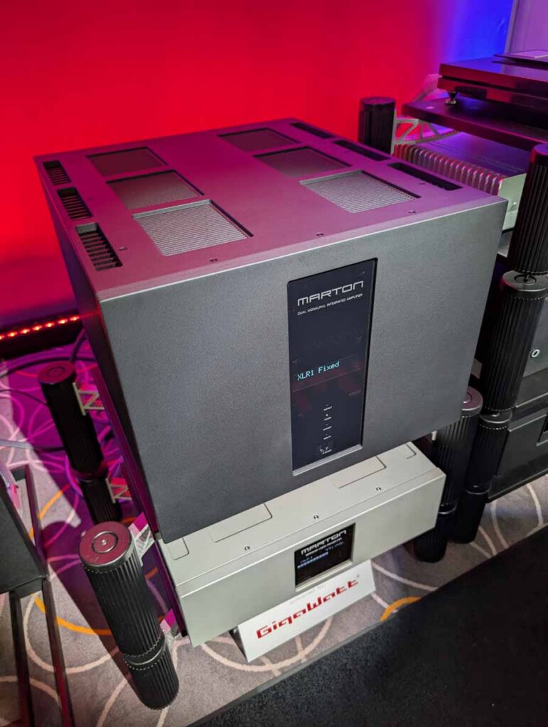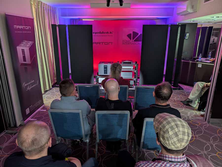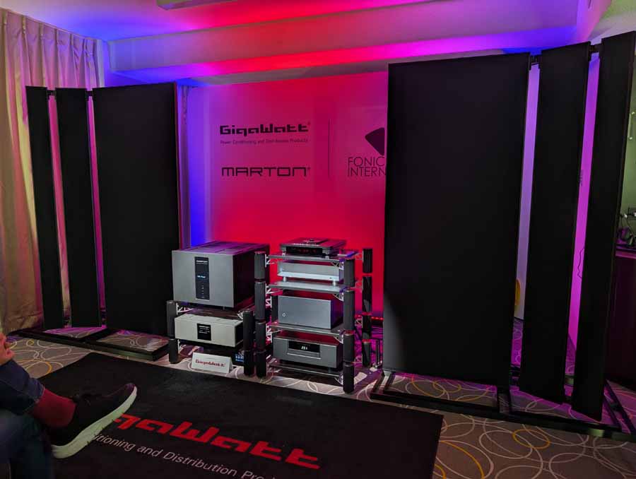 In this room we had the new Fonica isodynamic speakers (FLAG series), with the LaGrande on demo paired with the Marton Prelude pre-amp, Marton Opusculum Reference power amp, and GigaWatt PowerMaster 25th anniversary mains conditioner. There was also the new GigaWatt PF-2 SE EVO+ mains distribution block on show in this room. As you’d expect, these speakers deliver sound effortlessly and fill the room with ease, although they did lack a tiny bit of dynamic punch at times.