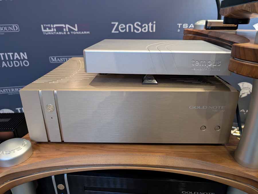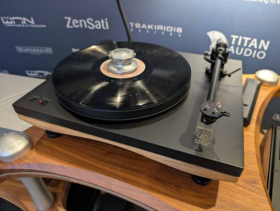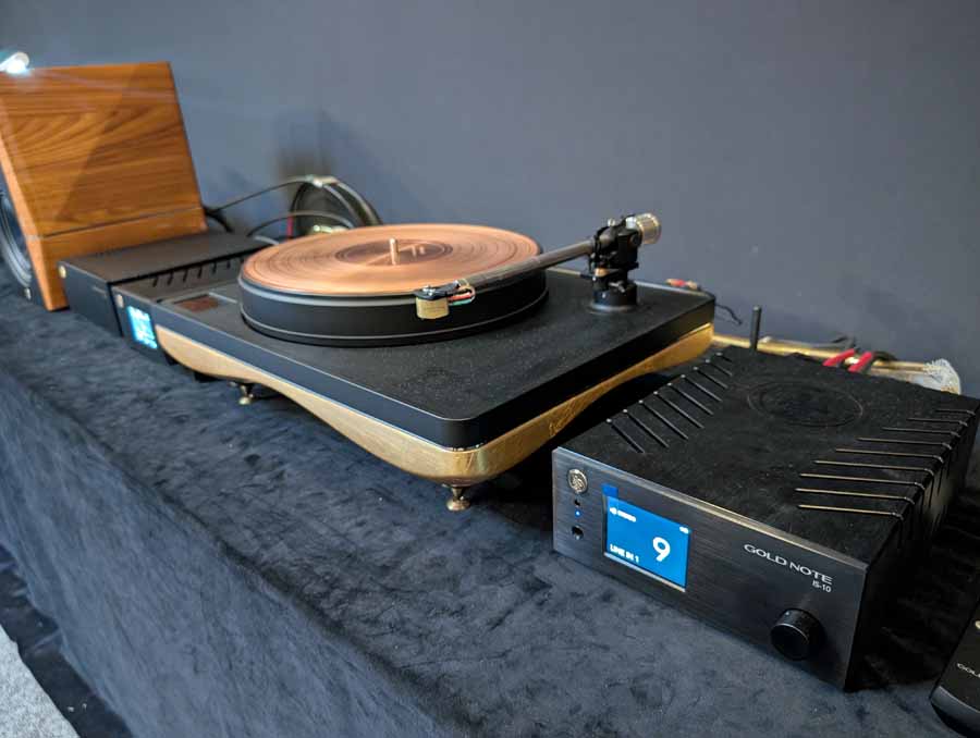 Delta Audio had a Gold Note setup consisting of the Mediterraneo X turntable, PH-1000 phono stage, CD-1000 deluxe player, and DS-1000 EVO DAC/streamer. This was accompanied by MastersounD PF200 Litz power amps, Spazio tube pre-amp, Brodmann Acoustics VC 7 speakers, Tsakiridis Super Athena mains conditioner, and ZenSati cabling.