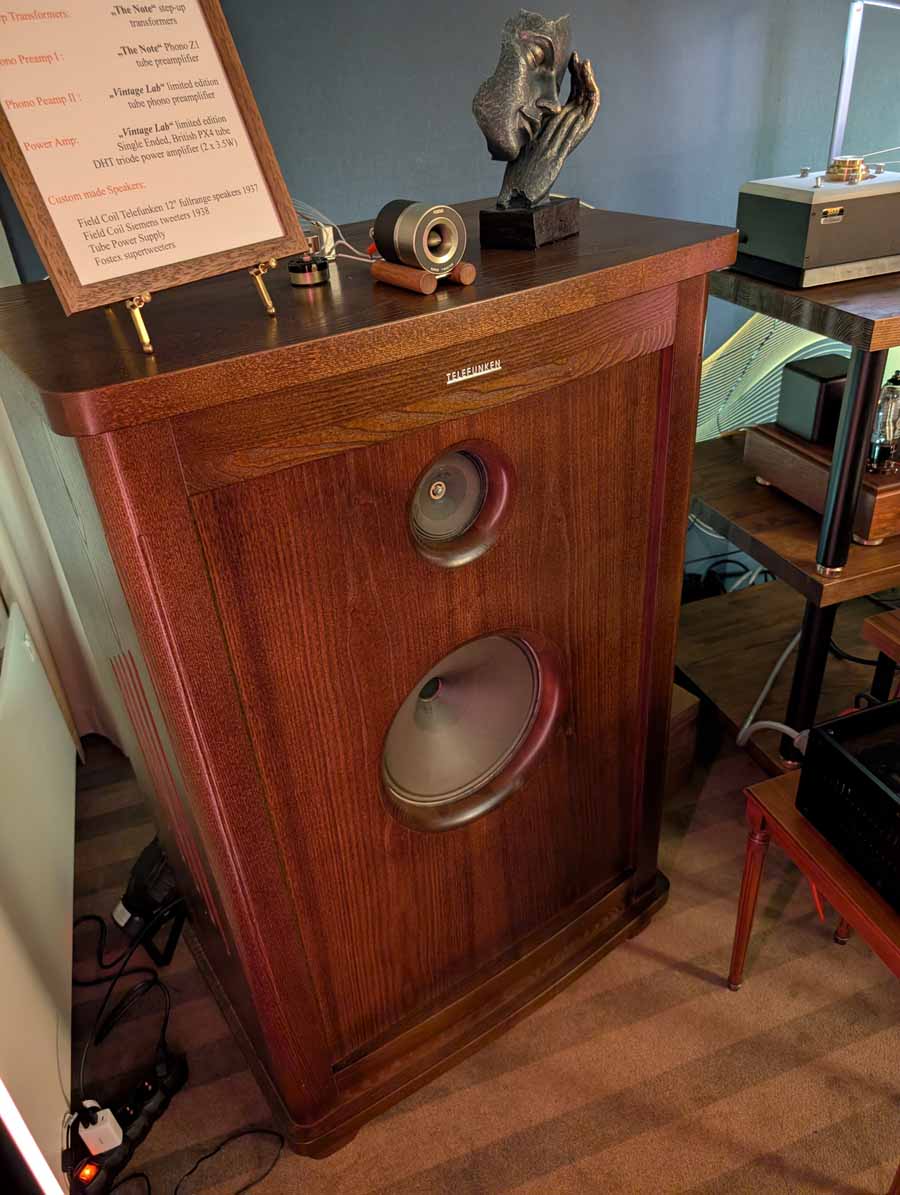 This was an interesting room, with a full analogue setup using field-coil speakers, full tube amplification, a “Vintage Lab” phono stage, and unique field-coil cartridge. This was an impressive system to look at, the Telefunken field-coil speakers, Fostex super-tweeters, all the valve amps and Melco turntable, and yet it was the sound that was most captivating. This is one of those setups where the kit simply melts away and all you are left with is the sound of the instruments, perfectly placed within the soundstage.