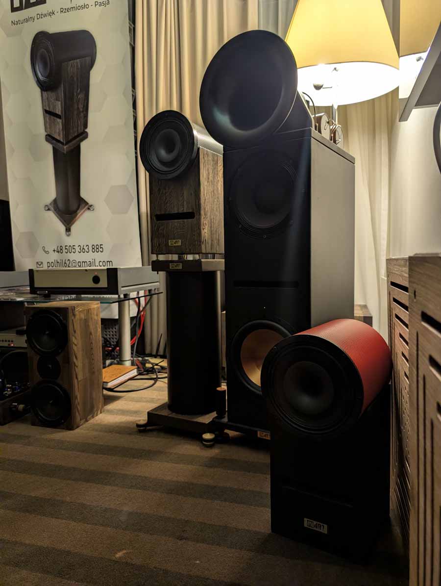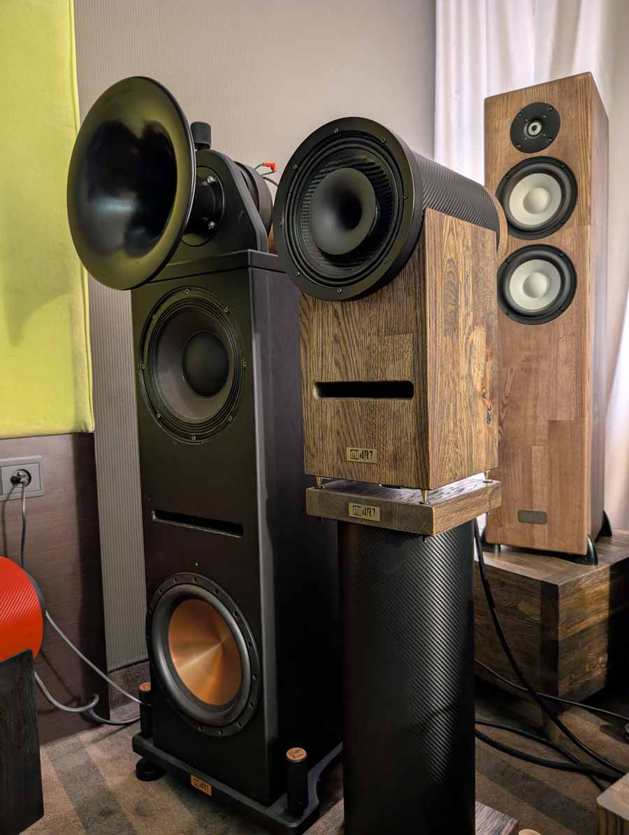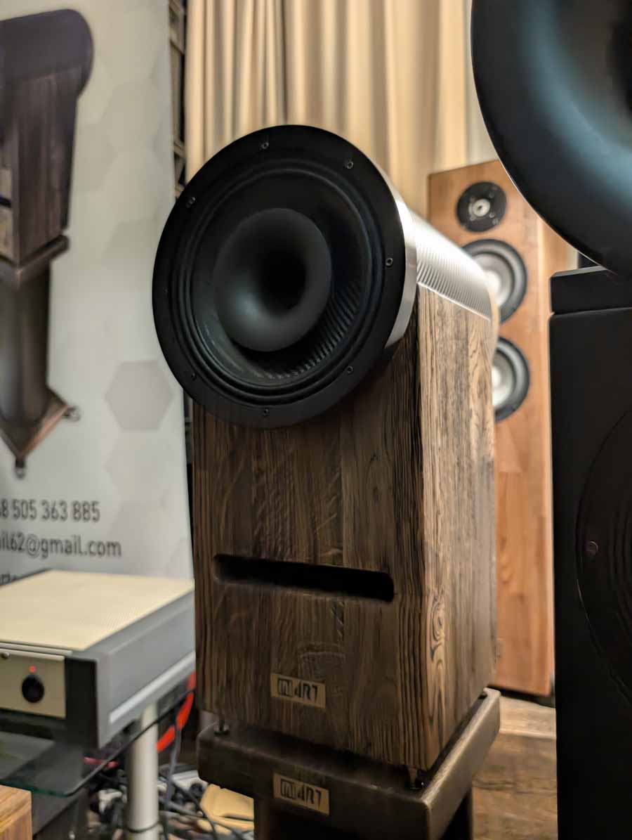 MiArt are a new company, they were showcasing a reference horn system, consisting of a monitor + sub setup, and a floor standing speaker with ceramic drivers. They had some horns playing in the room when we went in, and they were great, augmented with subs, they offered up a very smooth, and full sound.