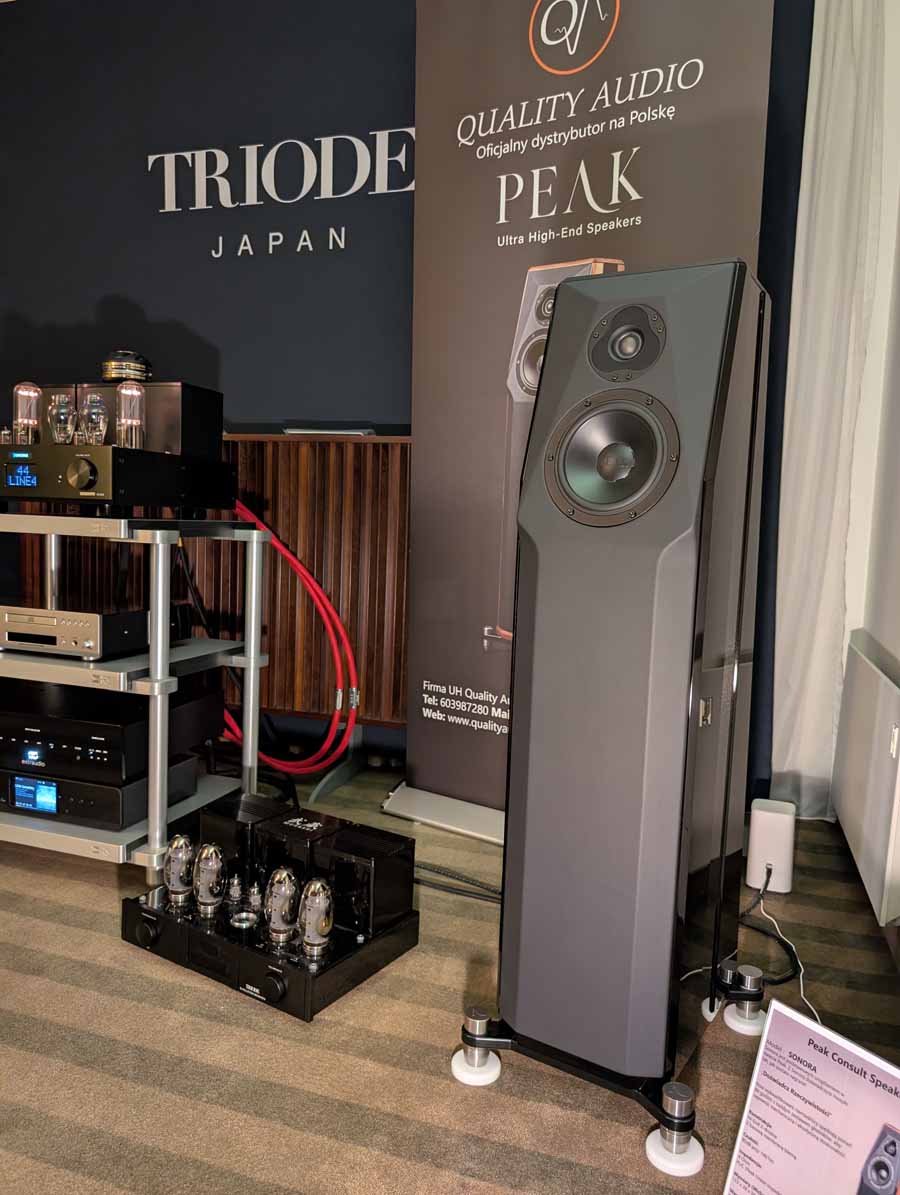 A well-known tube amplifier company, Triode unveiled their new generation of amps at the show including the Junone 845SE, Evolution 300 WE, Musashi Evolution, and other models from the TRV line. In this room they were using Peak Consult Sonora speakers. Lovely sound in here, big and bold, there are a lot of valve-based systems at this show and if any of you have read my reviews you’ll know I do like the sound of a good valve system. There is something very special about their sound, and this is another great system to showcase that, super punchy, bold, and fun, with a hint of magic that makes them easy on the ear.