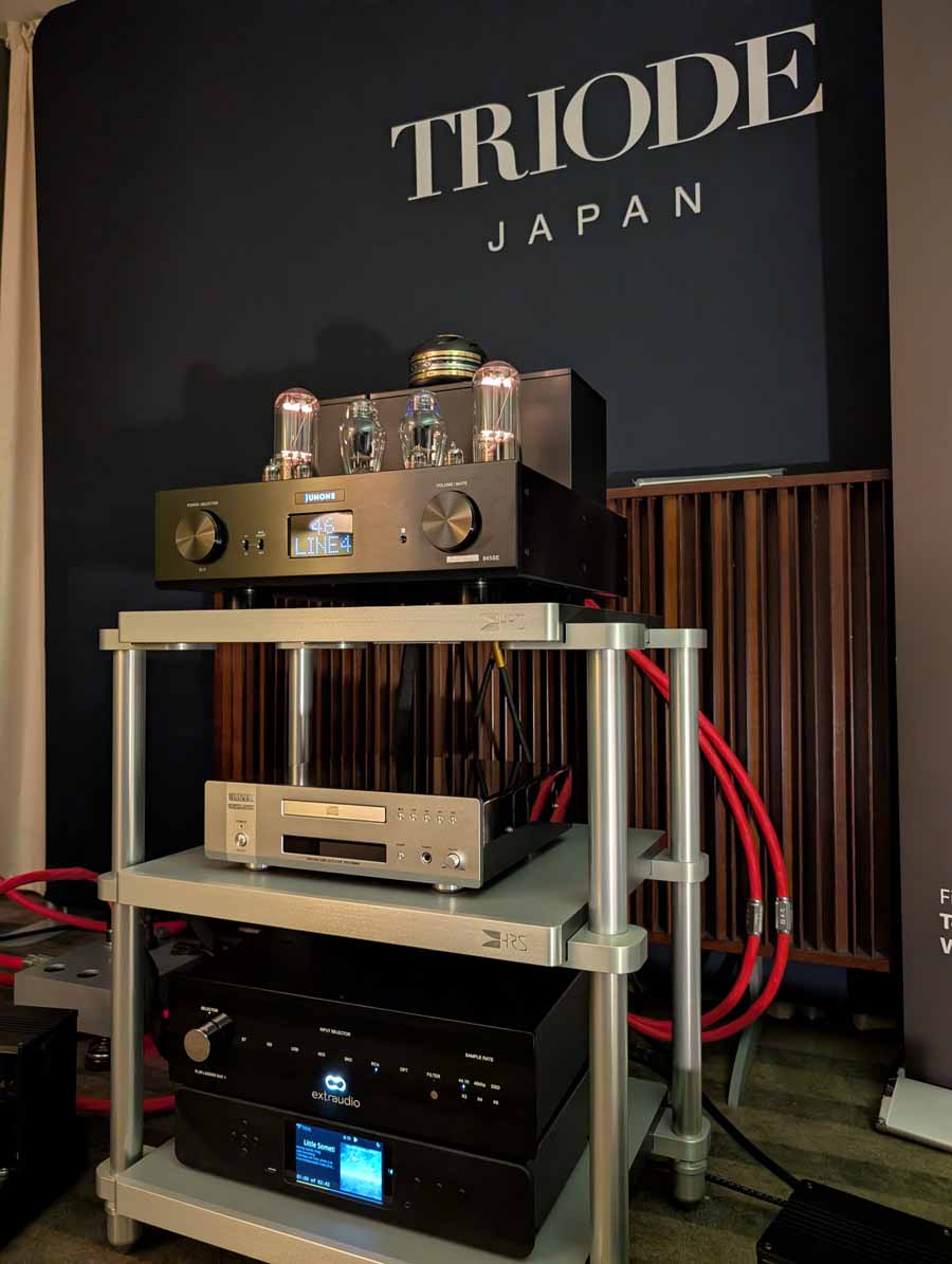 Brunoco audio products are made in Korea, in limited runs, and they were showing off their Terra 6L6PP and Terra 300b integrated amps, alongside the OmniONE omni-directional 3-way speakers. These are not conventional looking speakers, their unique design is quite cool, and the sound coming from them was incredibly lifelike. They have an up-firing woofer, with front firing dedicated midrange, and tweeter. The amps are lovely too, and it all forms a natural, organic sounding setup.