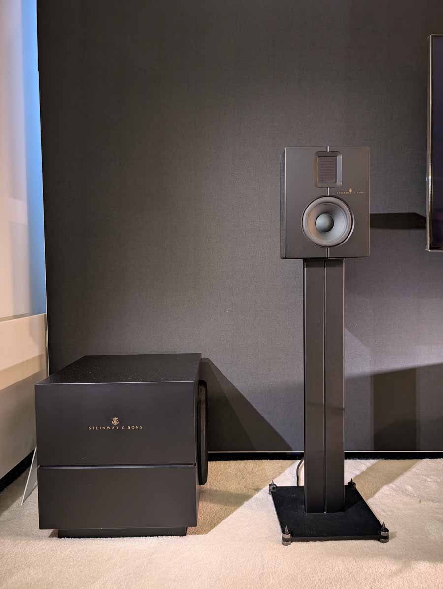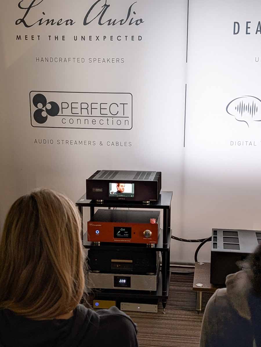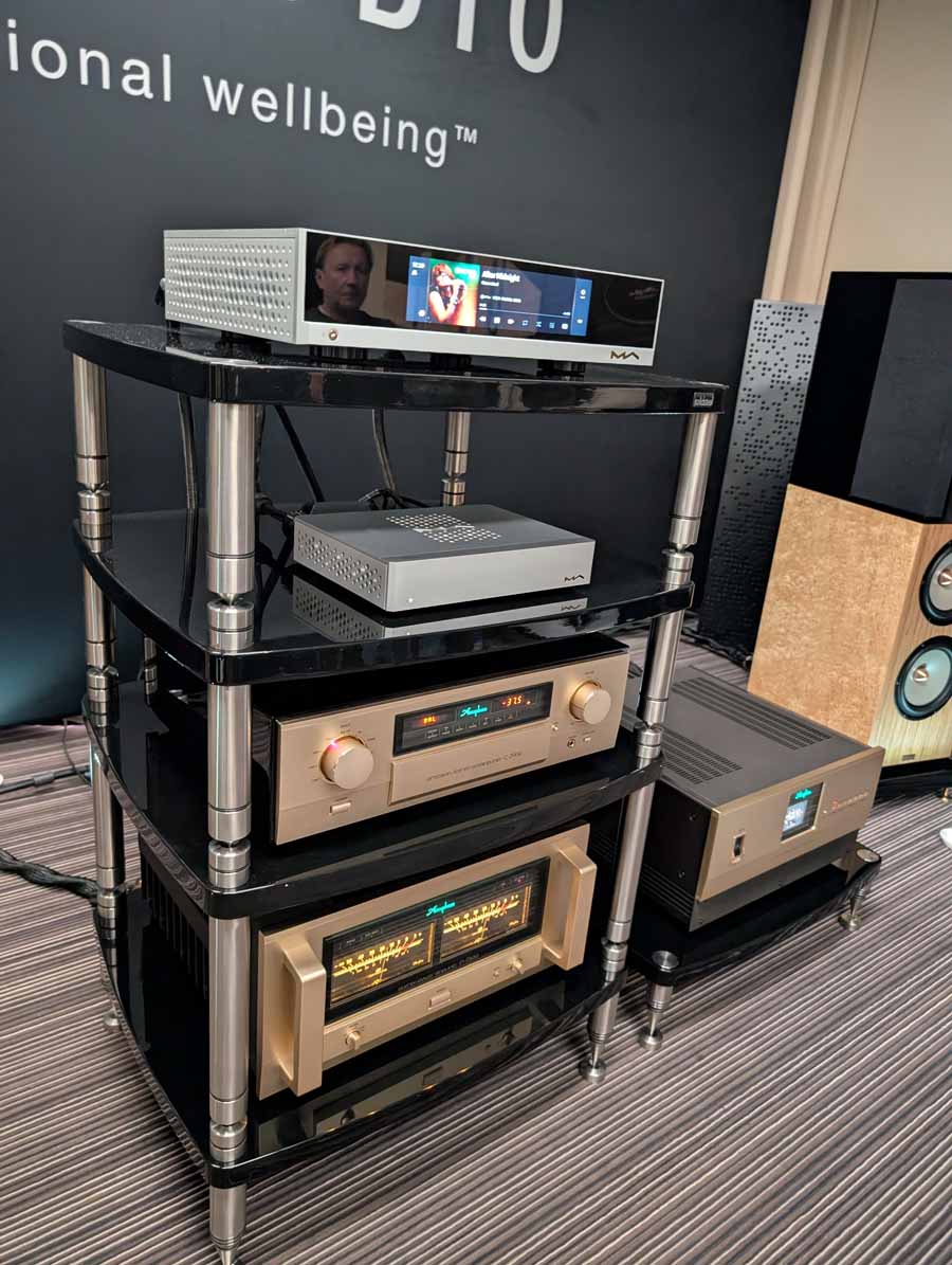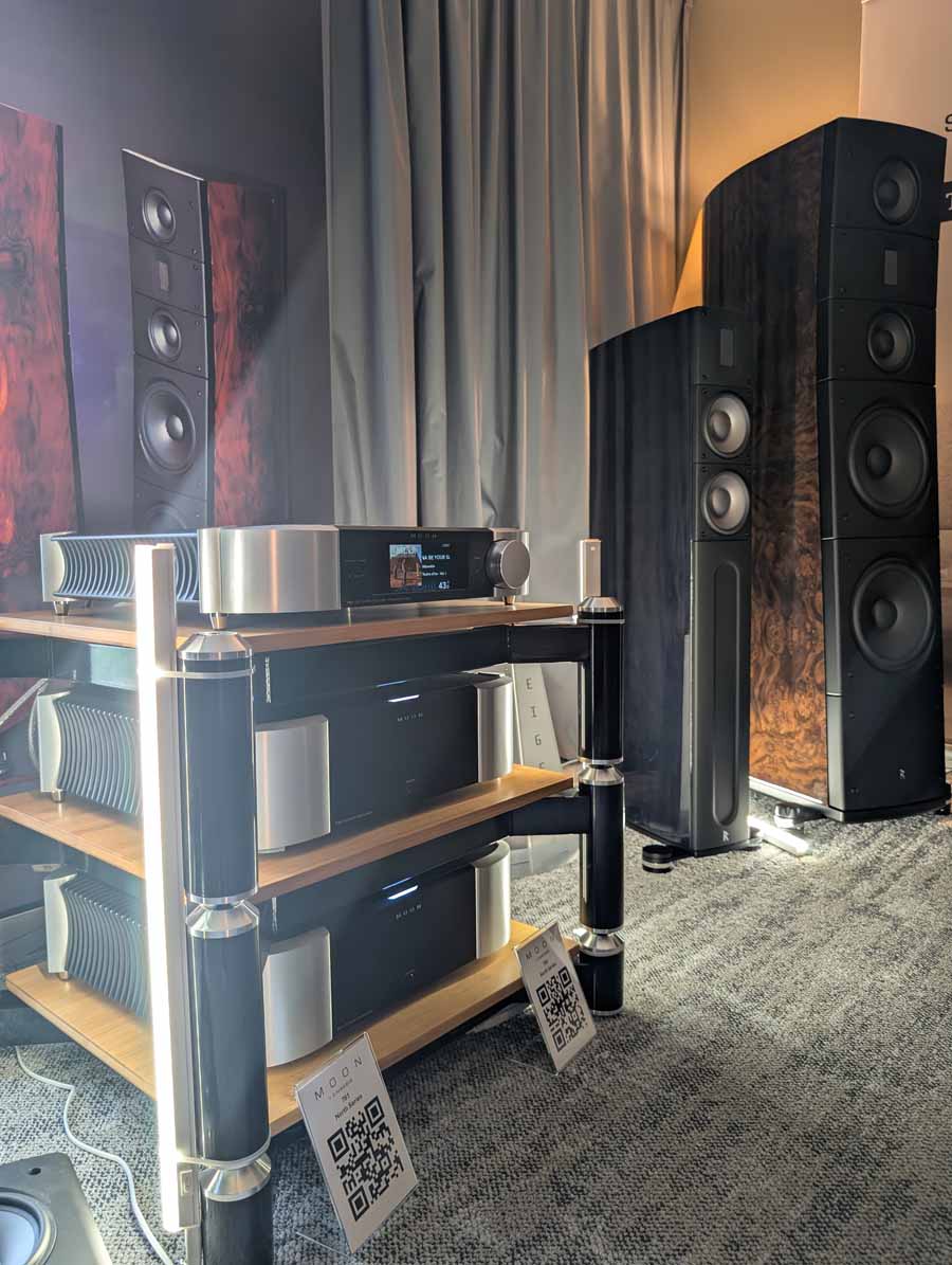 Well known for their RoomPerfect room correction DSP, Lyngdorf showed off a system consisting of a small pair of stand mounts and a pair of their subs – all dialled in with their RoomPerfect correction, allowing this system to have body, depth, and clarity from a small-ish system.