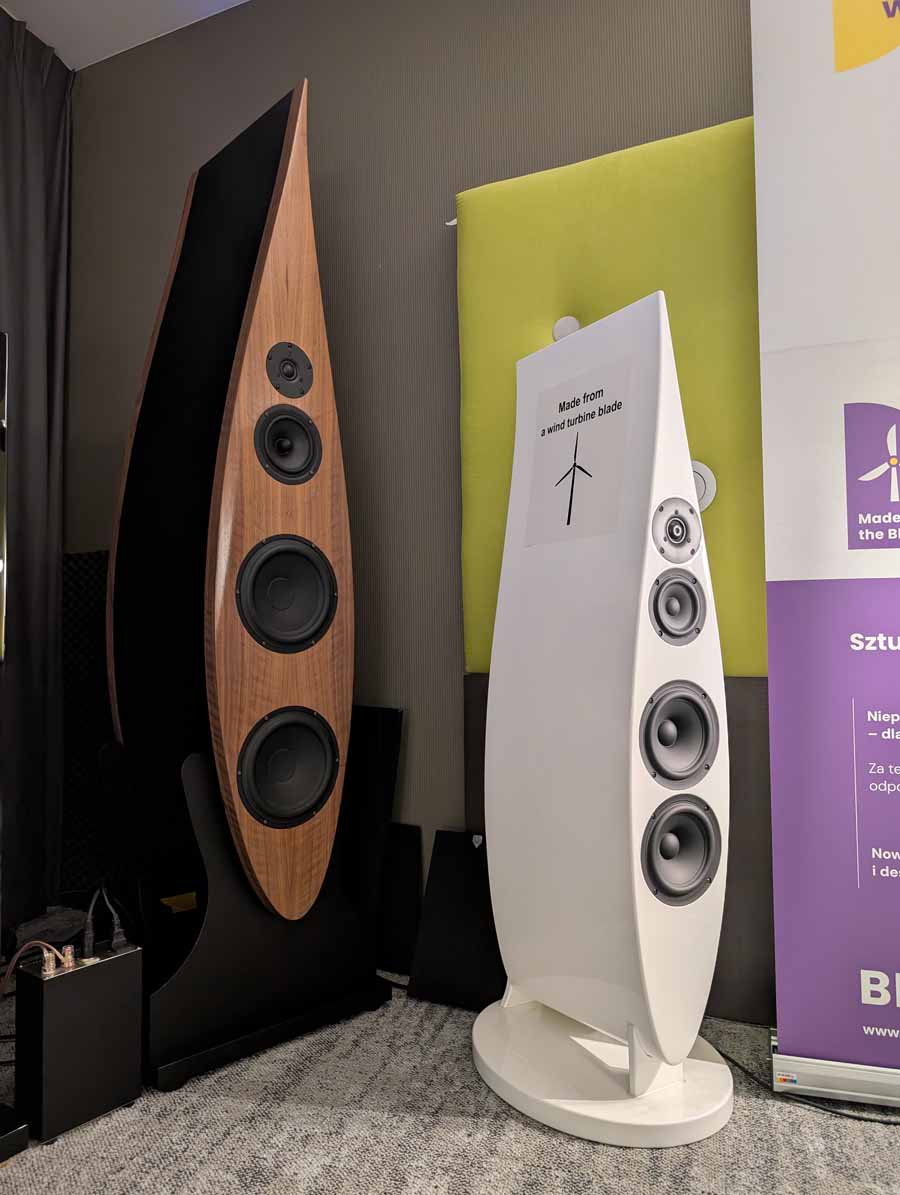 Blade Brothers make speakers from old wind turbine blades, it’s ecofriendly and provides a very rigid cabinet for the speakers. The acoustics are handled by Wilk Audio Projekt, whilst the design is done by Blade Brothers, an interest blend of design, sound, and eco-credentials.
