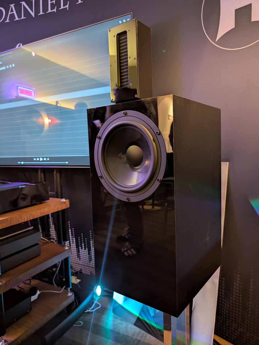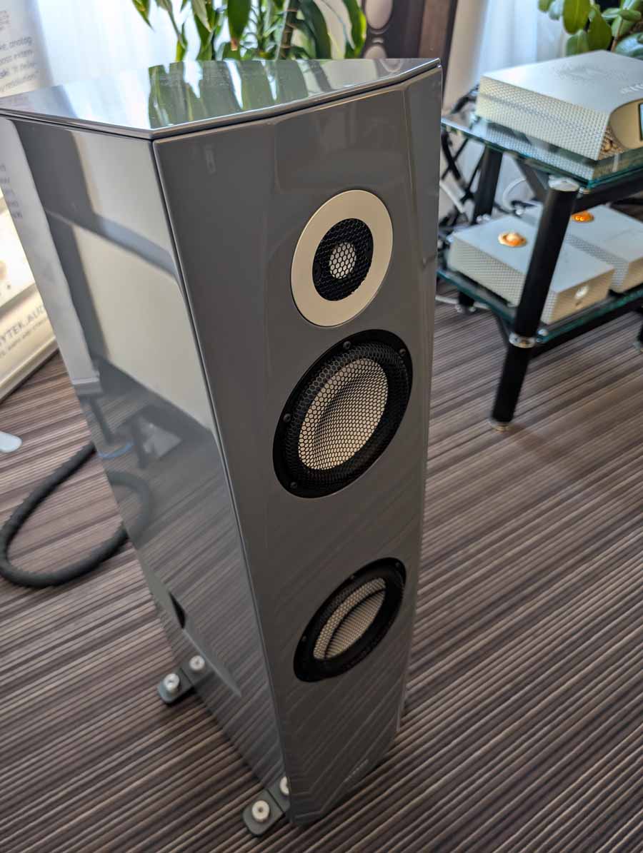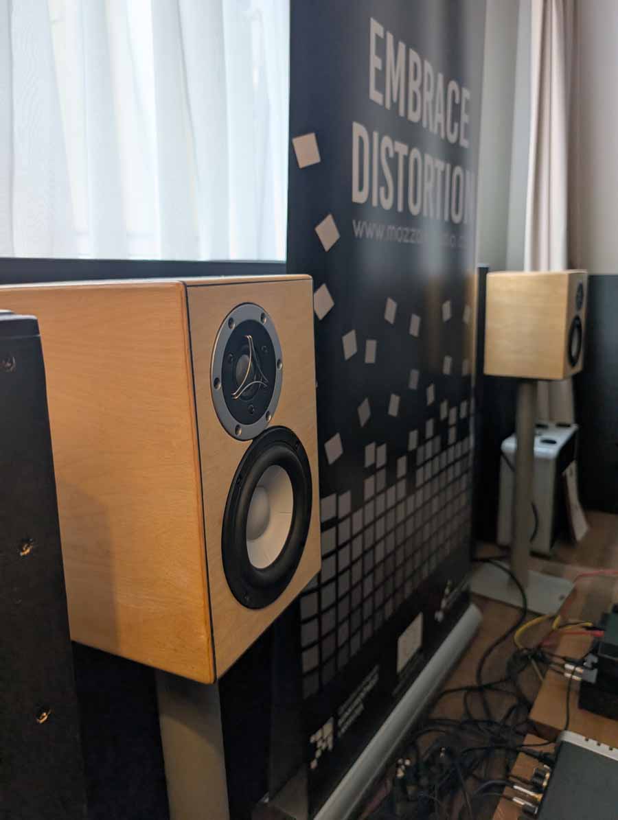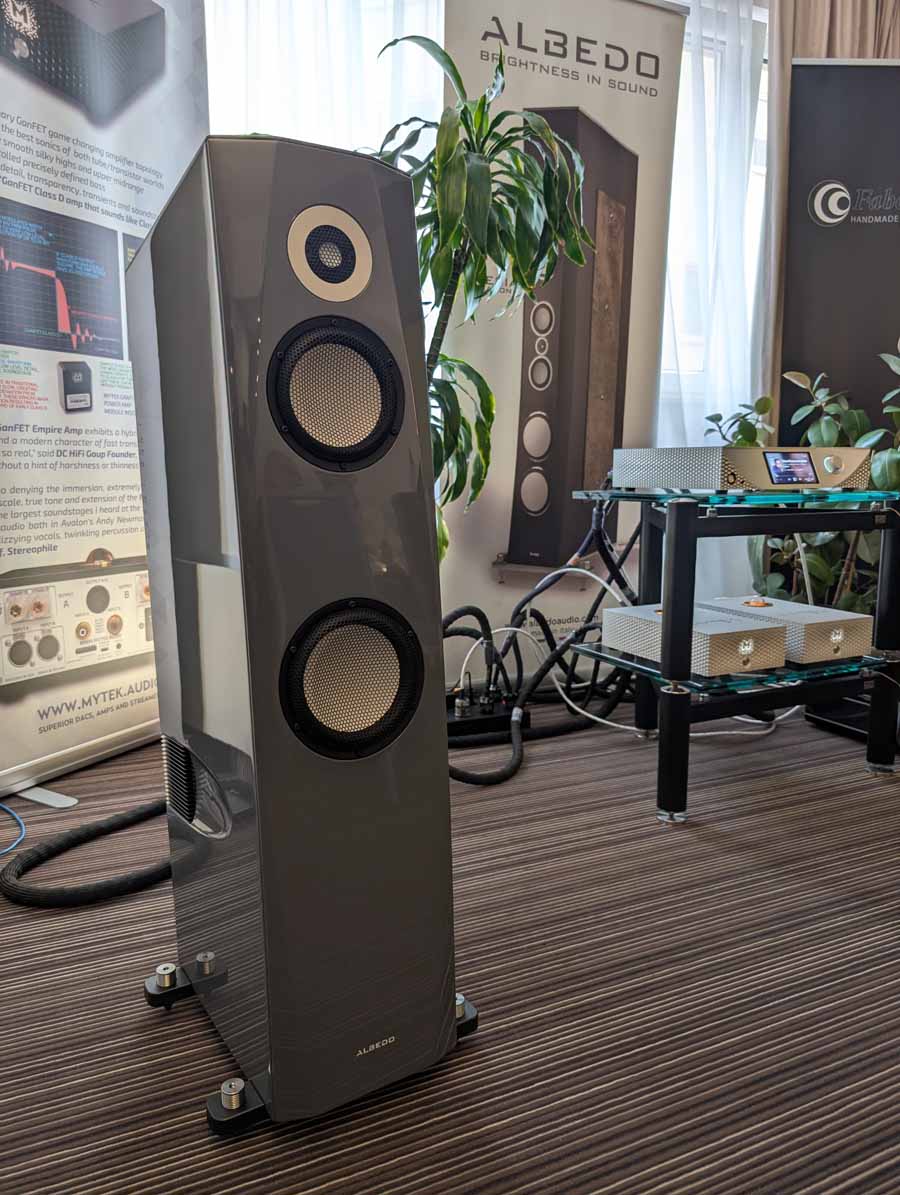 Mytek had a whole range of products on display and demo, the main system however consisted of their Empire streaming DAC and the new Empire amplifiers with GaN FET transistors. These were paired with Albedo Audio speakers, which are made in Italy and use a transmission line design. The Albedo speakers paired well with the Mytek kit, with quite a controlled and detailed sound.