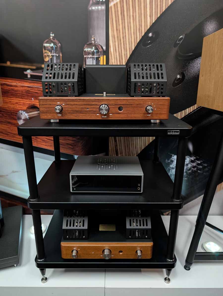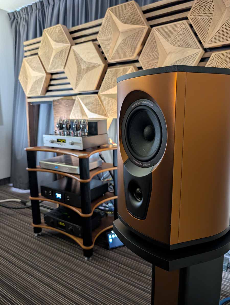In the next room we had the debut of Penaudio’s Rebel Three Luumaki speakers paired with a tube amp from Audio Reveal, Matrix Audio streaming transport, cables from Esprit, and stands from SolidSteel. Whilst not quite as impressive as the big room, these held their own as a highly enjoyable, fuller sounding speaker.