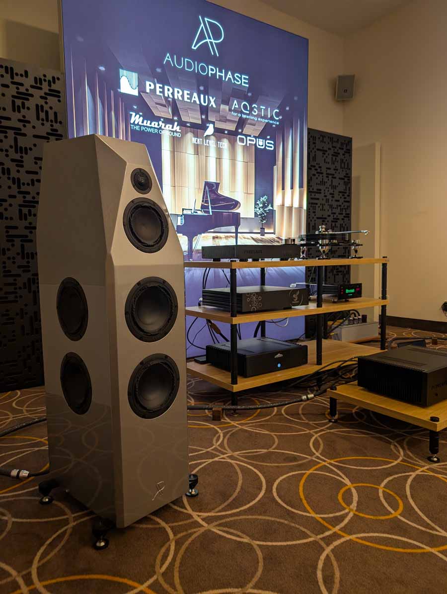 Audiophase had their whole speaker lineup on display, in different finishes, as well as their range of cables, and previews of things coming in 2026. These were paired with Perreaux electronics, including their latest 300iX integrated amplifier, and flagship VP4 phono stage. Big, bold, punch, and spacious is how I’d describe this room – handling dynamic shifts with ease and composure.