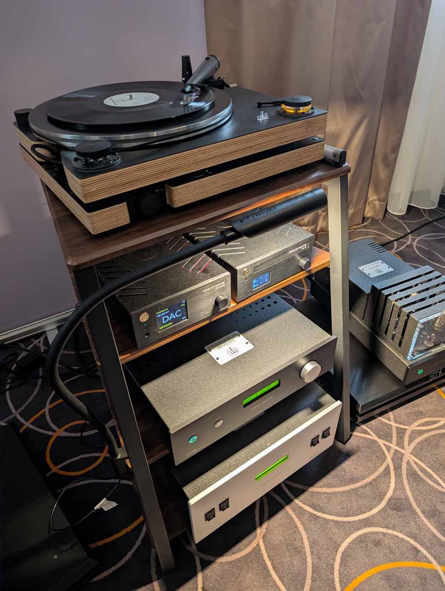 Delta Audio had a Gold Note setup consisting of the Mediterraneo X turntable, PH-1000 phono stage, CD-1000 deluxe player, and DS-1000 EVO DAC/streamer. This was accompanied by MastersounD PF200 Litz power amps, Spazio tube pre-amp, Brodmann Acoustics VC 7 speakers, Tsakiridis Super Athena mains conditioner, and ZenSati cabling.