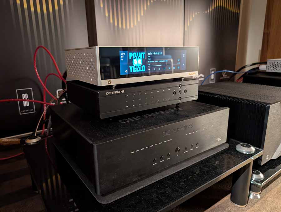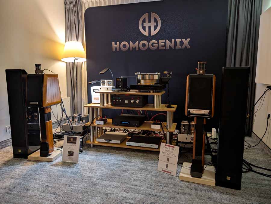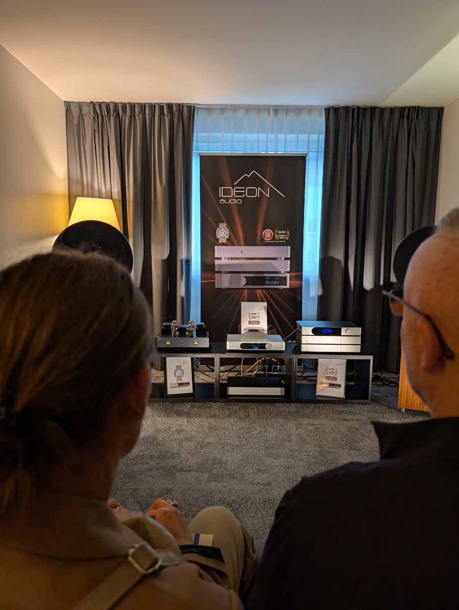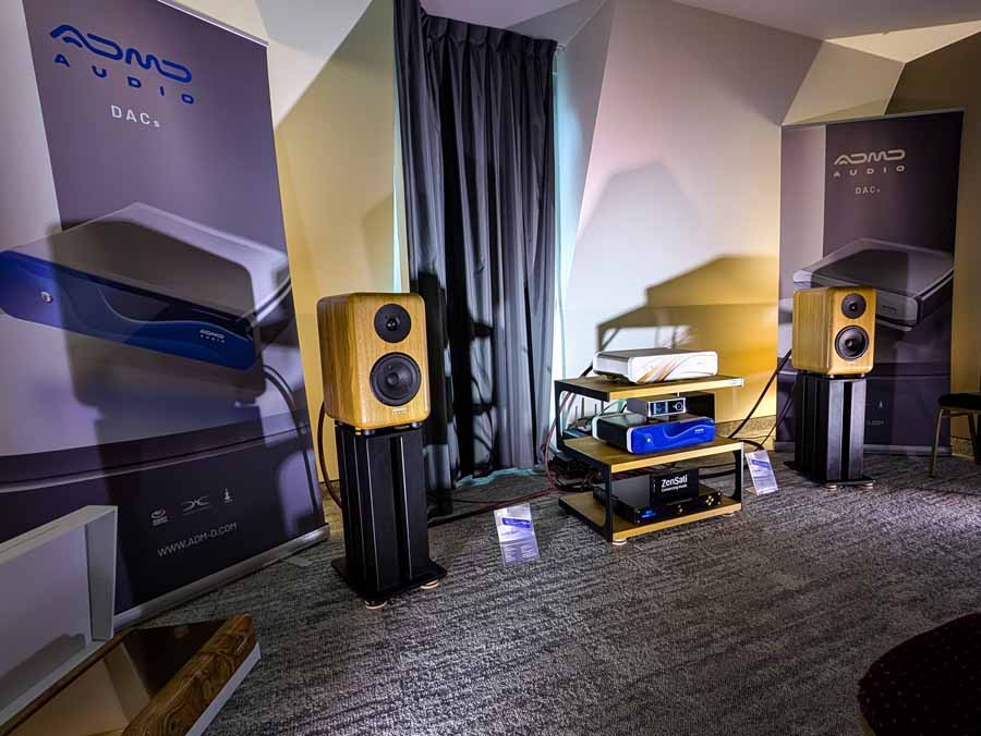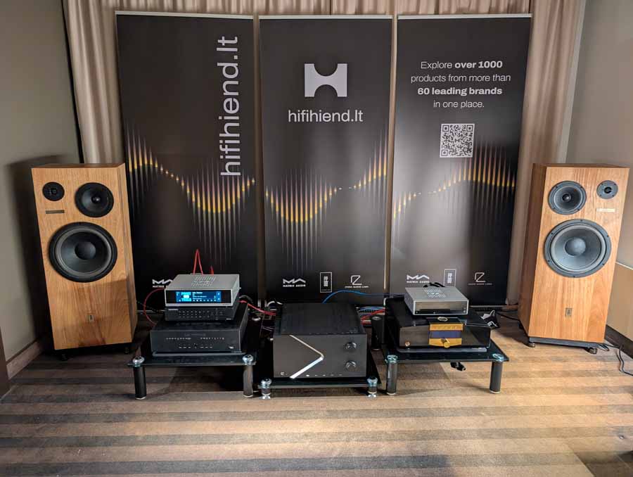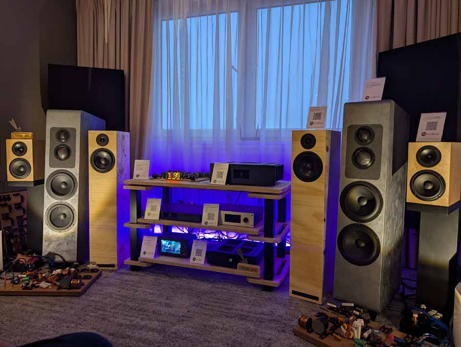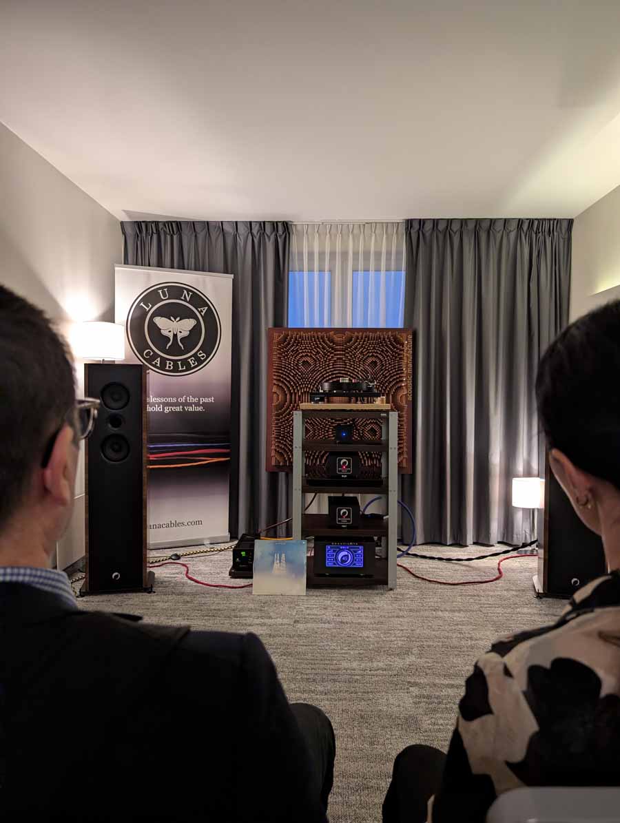A big Lithuanian distributor, they brought a few brands to demo at the show. The main system had the GG Acoustics speakers, Zoom Audio Labs Amplifier, Denafrips Terminator 15th DAC, Denafrips Gaia 12th DDC (digital – digital converter), Matrix Audio NT-1 streaming transport, TS-1 Streaming DAC, and SS-1 Pro network switch. This was quite a fun room too, playing some Yello, it was big, bold and punchy.