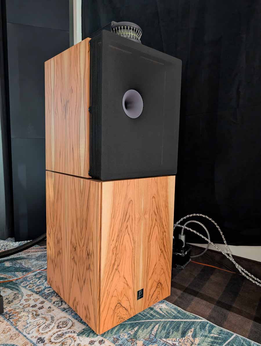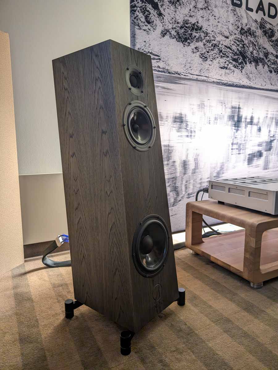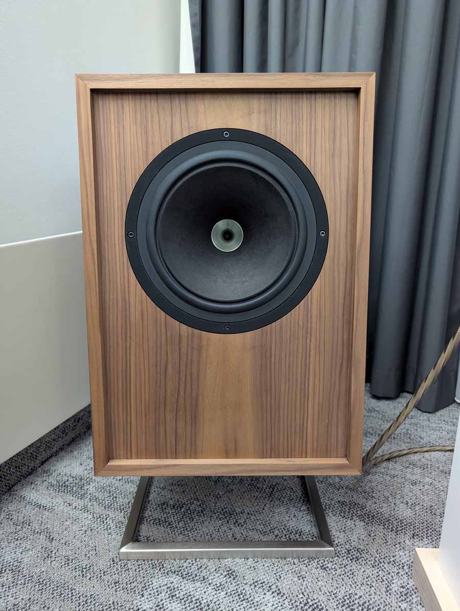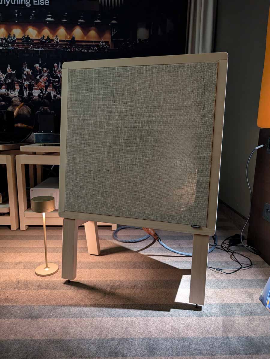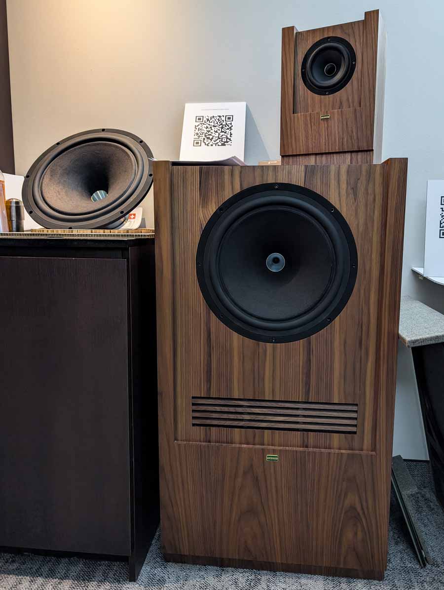 Some interesting speakers here with an 18” woofer, dedicated midrange, and tweeter in an open baffle design. They were being run off a 17w valve amplifier, as the speakers are quite high sensitivity. These excel with vocal-centric music yet can deliver impact and depth when called for. They had a Rockna DAC in the system and a Technics turntable with custom plinth.