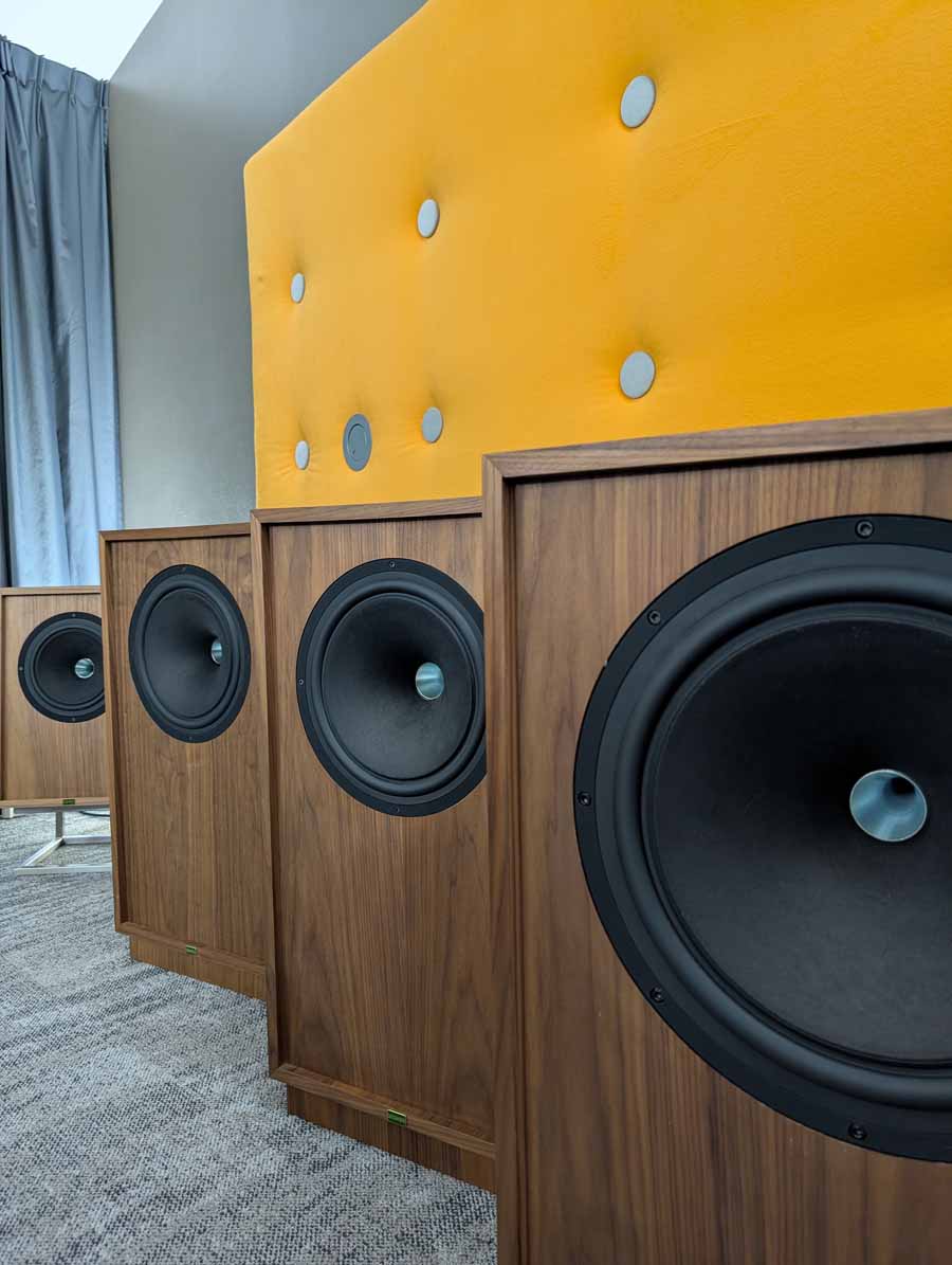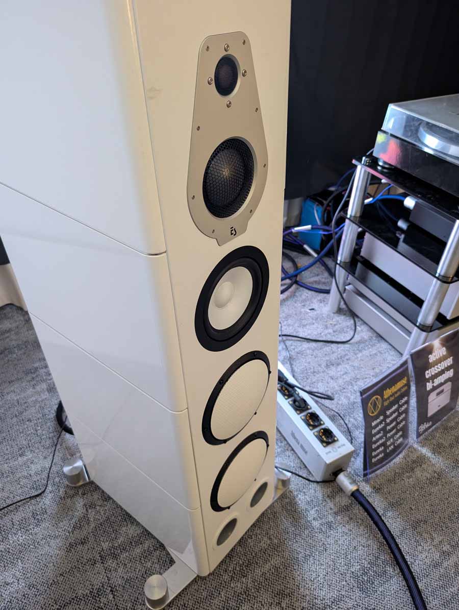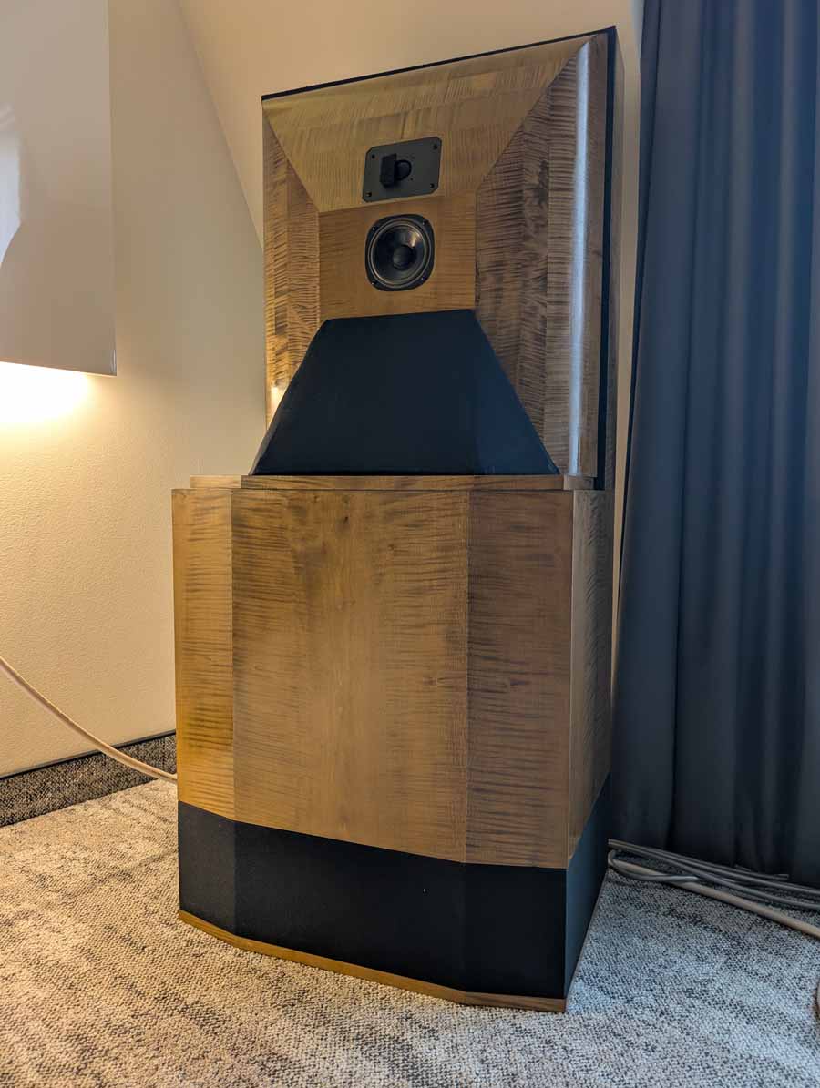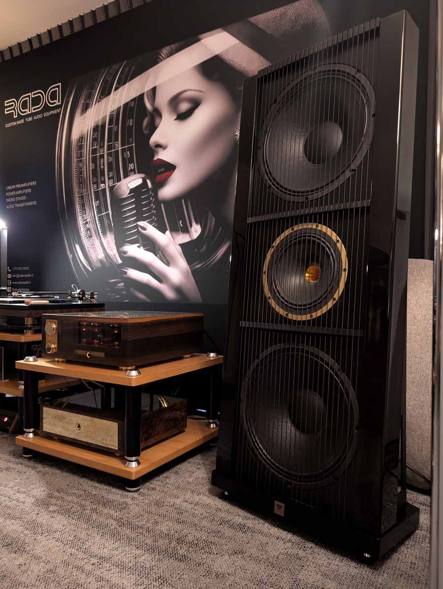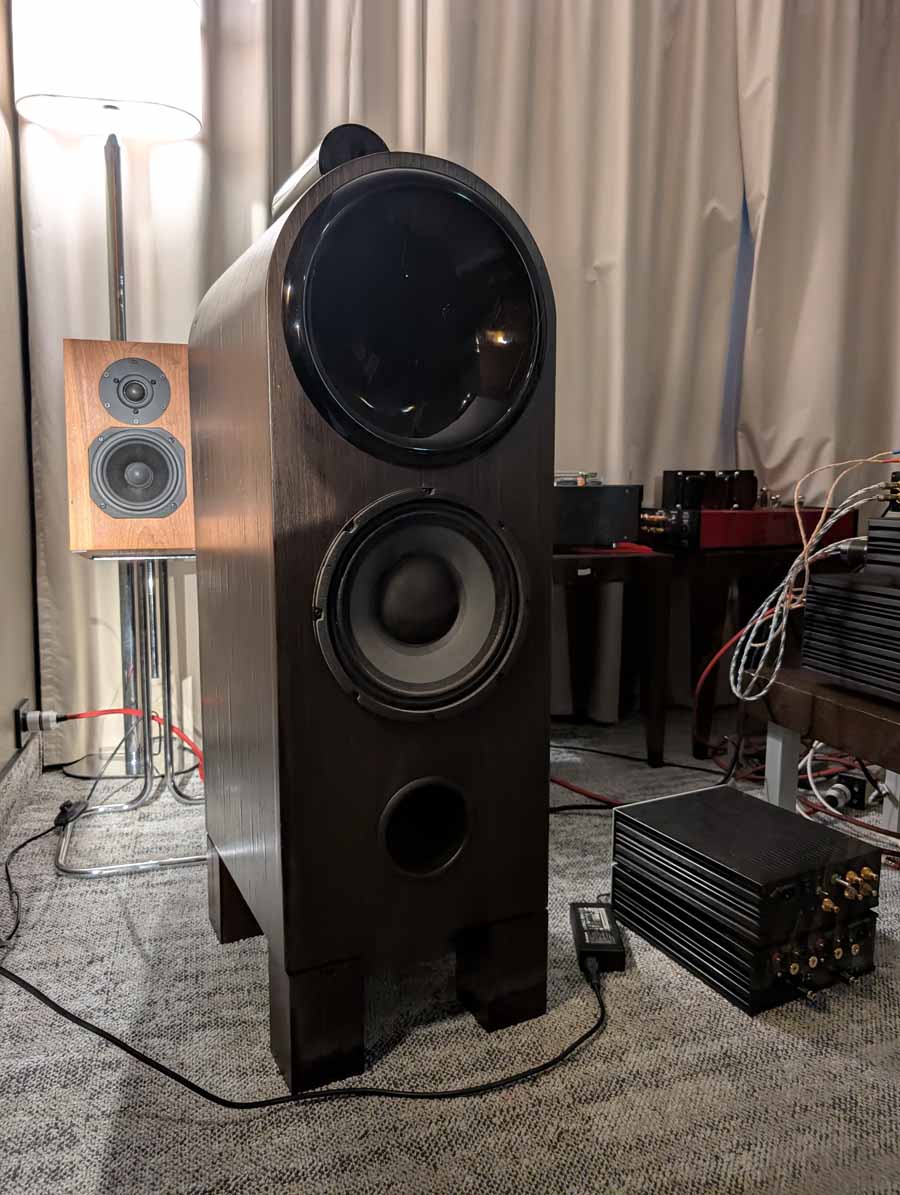 Some interesting speakers here with an 18” woofer, dedicated midrange, and tweeter in an open baffle design. They were being run off a 17w valve amplifier, as the speakers are quite high sensitivity. These excel with vocal-centric music yet can deliver impact and depth when called for. They had a Rockna DAC in the system and a Technics turntable with custom plinth.