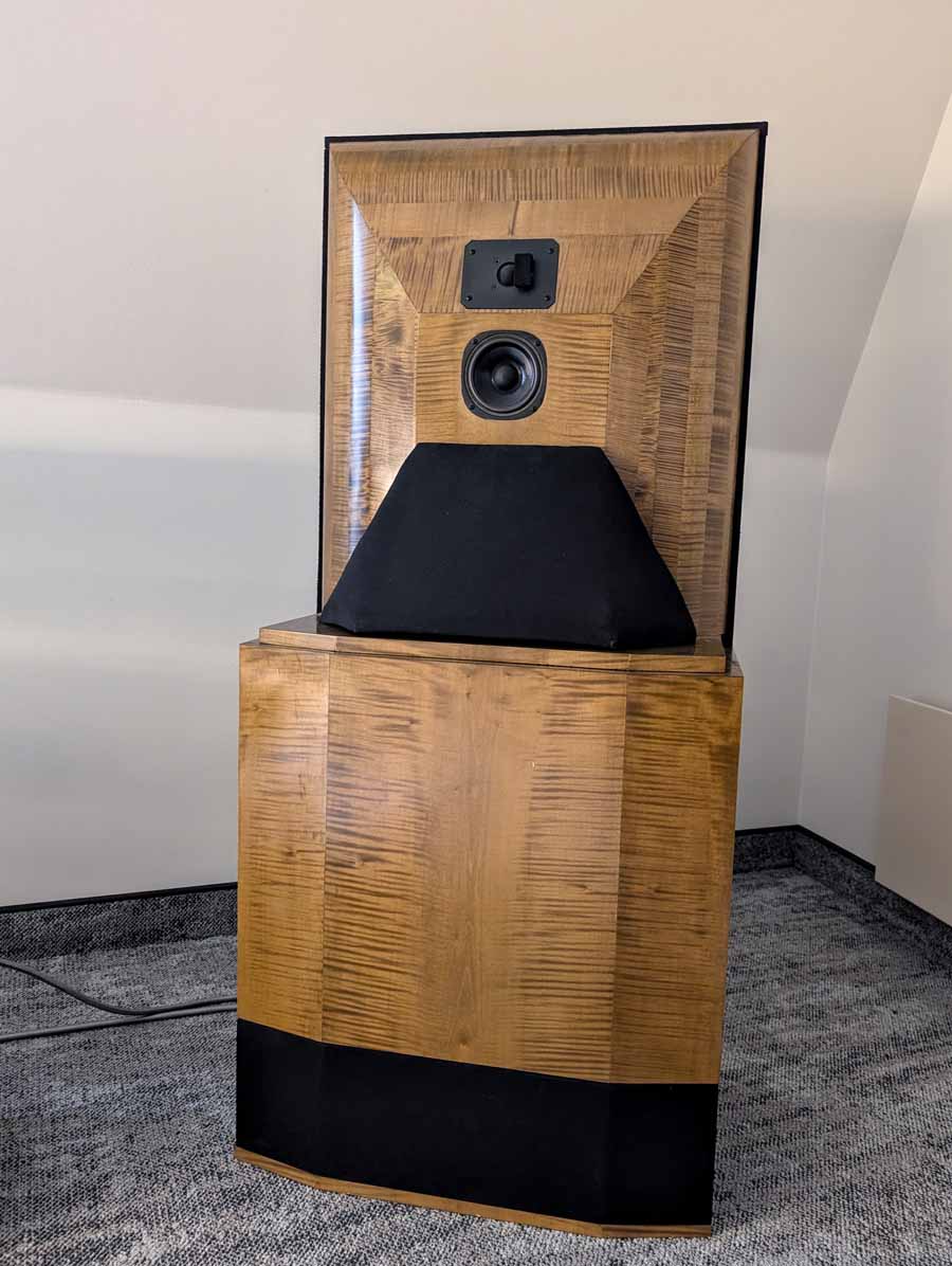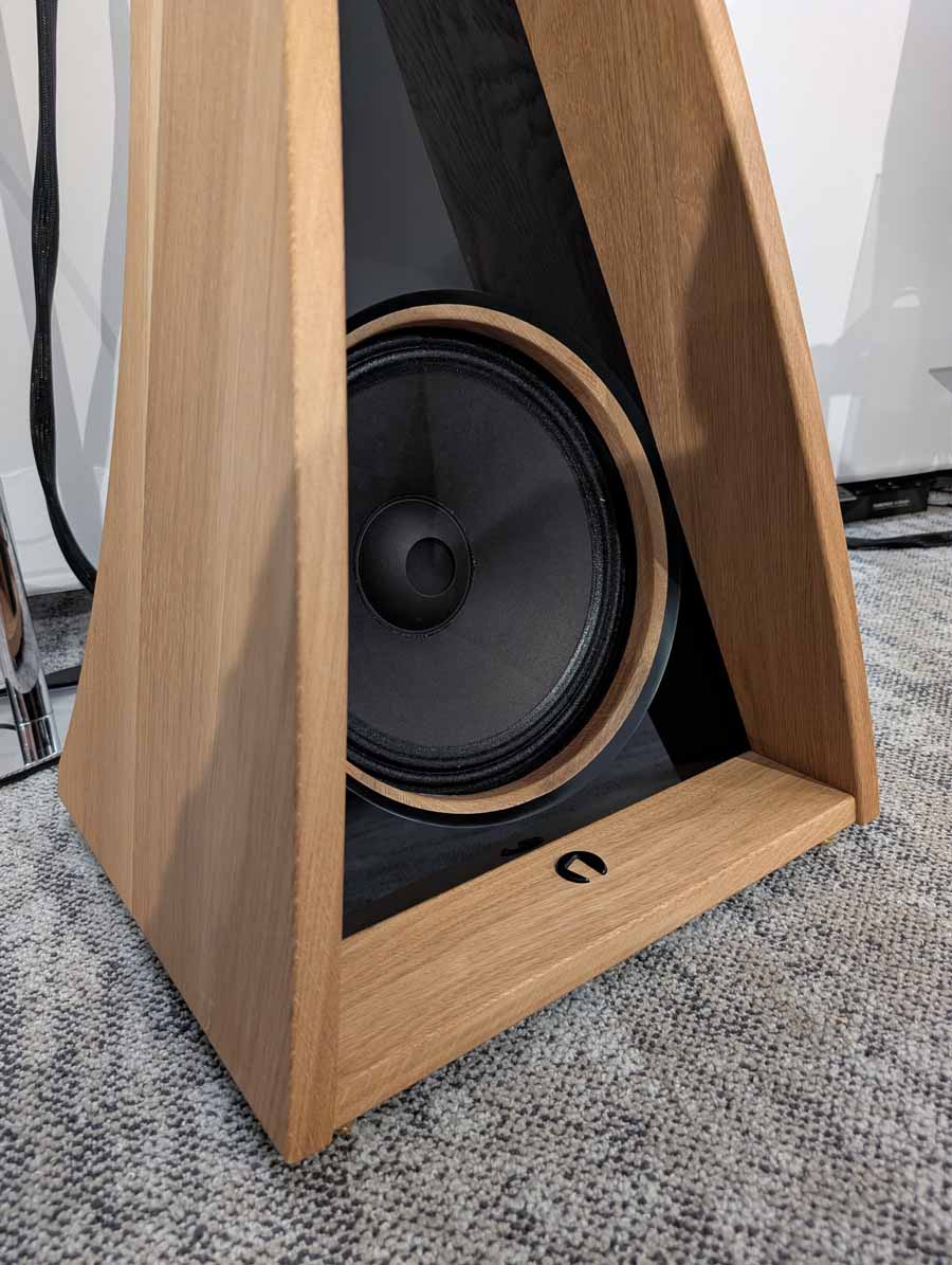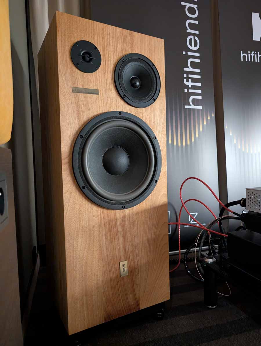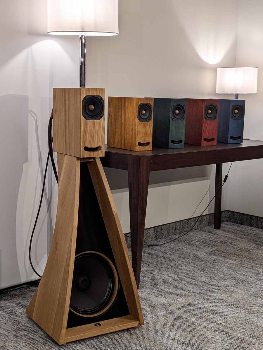 Some interesting speakers here with an 18” woofer, dedicated midrange, and tweeter in an open baffle design. They were being run off a 17w valve amplifier, as the speakers are quite high sensitivity. These excel with vocal-centric music yet can deliver impact and depth when called for. They had a Rockna DAC in the system and a Technics turntable with custom plinth.