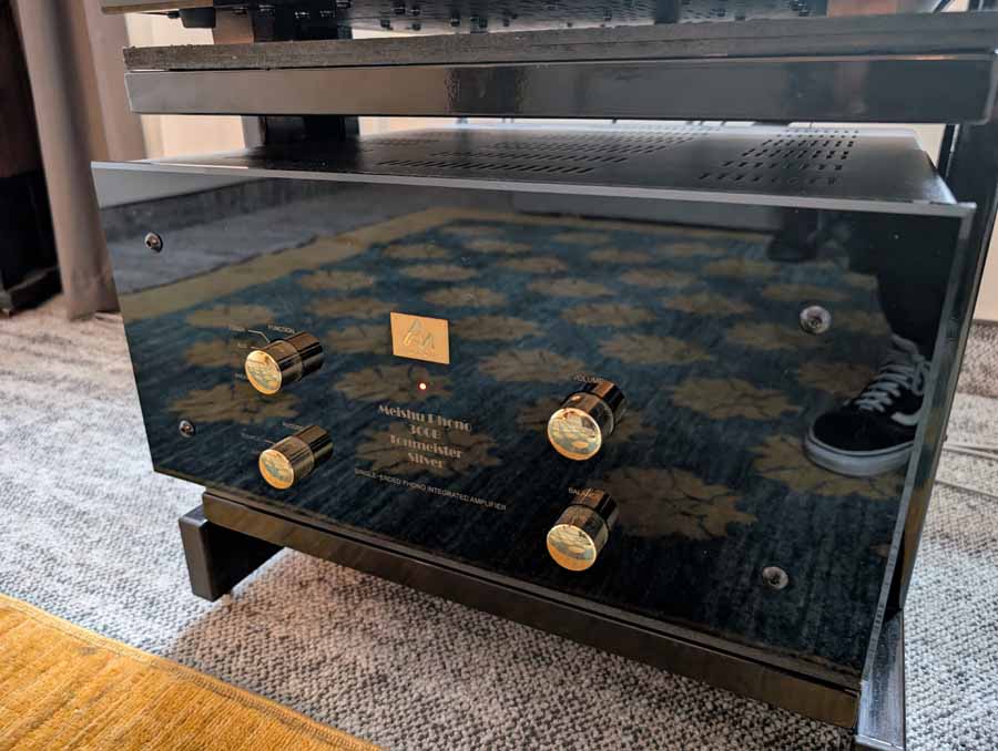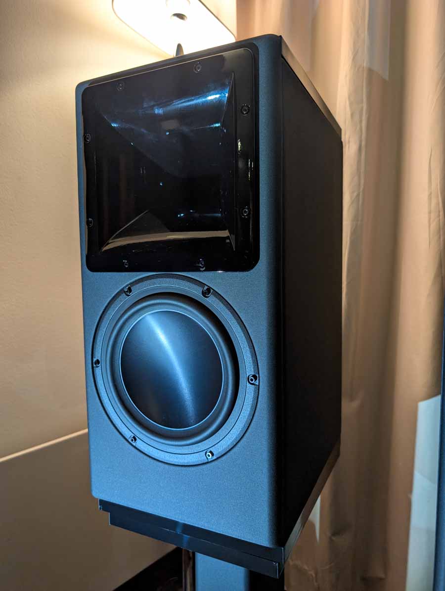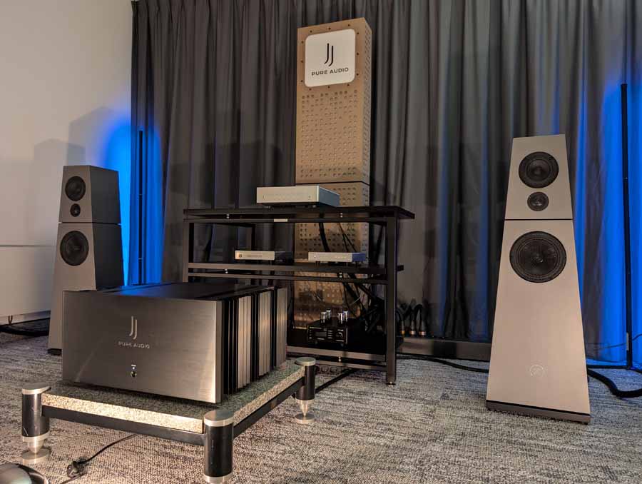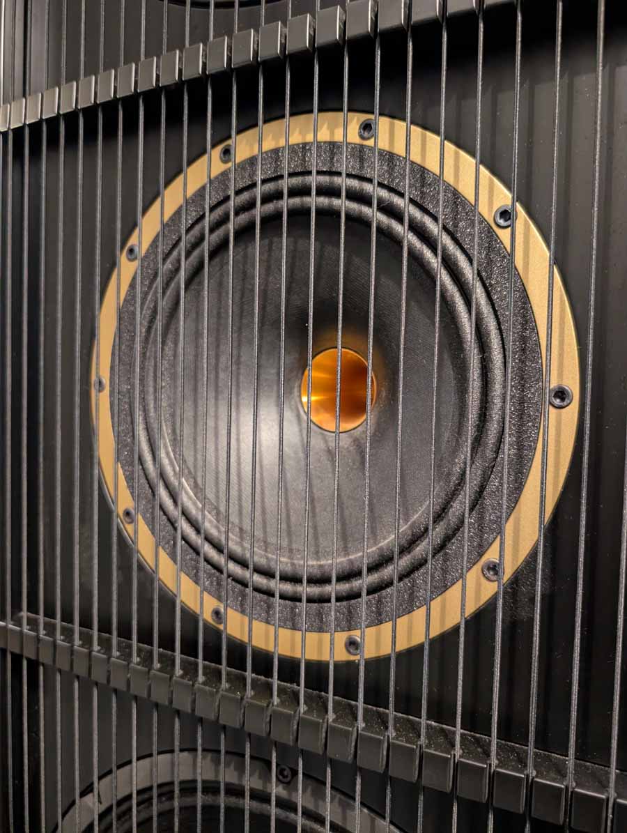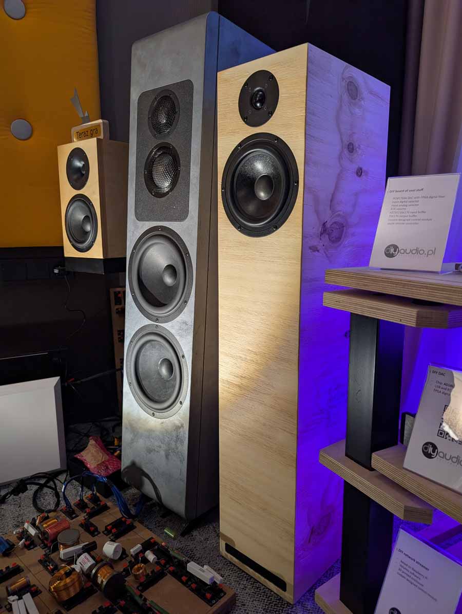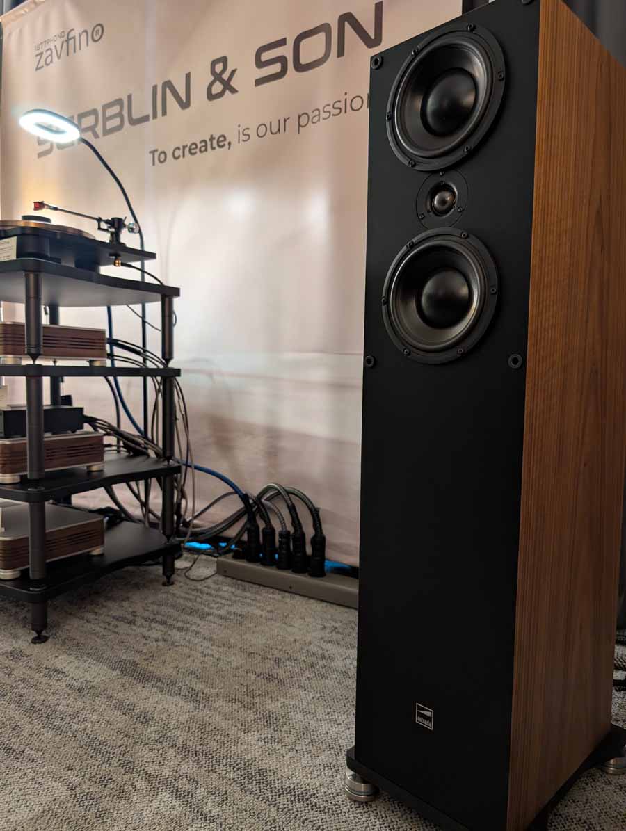 Some interesting speakers here with an 18” woofer, dedicated midrange, and tweeter in an open baffle design. They were being run off a 17w valve amplifier, as the speakers are quite high sensitivity. These excel with vocal-centric music yet can deliver impact and depth when called for. They had a Rockna DAC in the system and a Technics turntable with custom plinth.