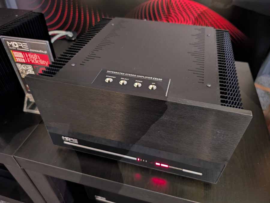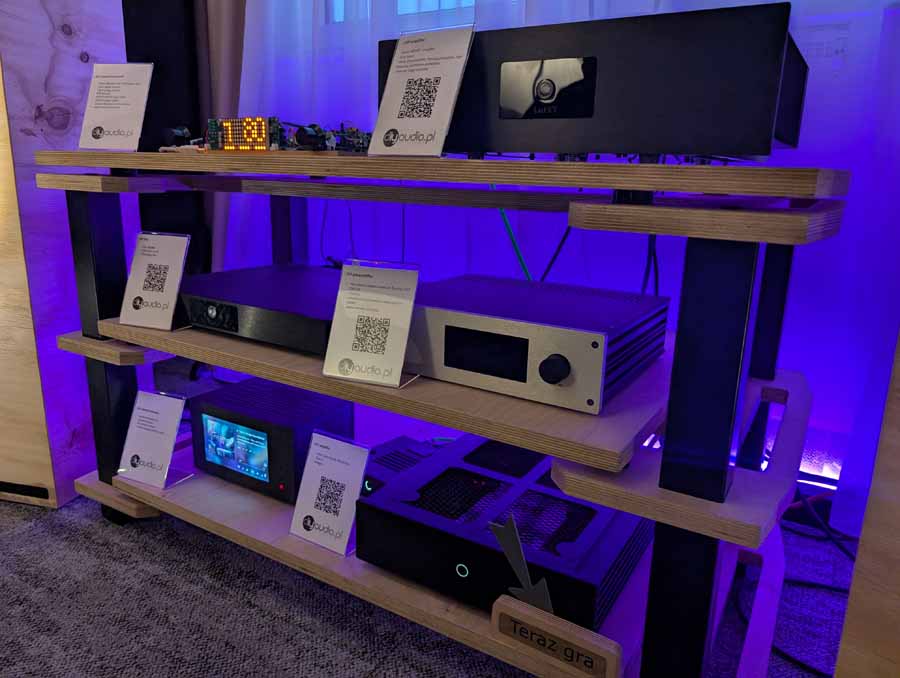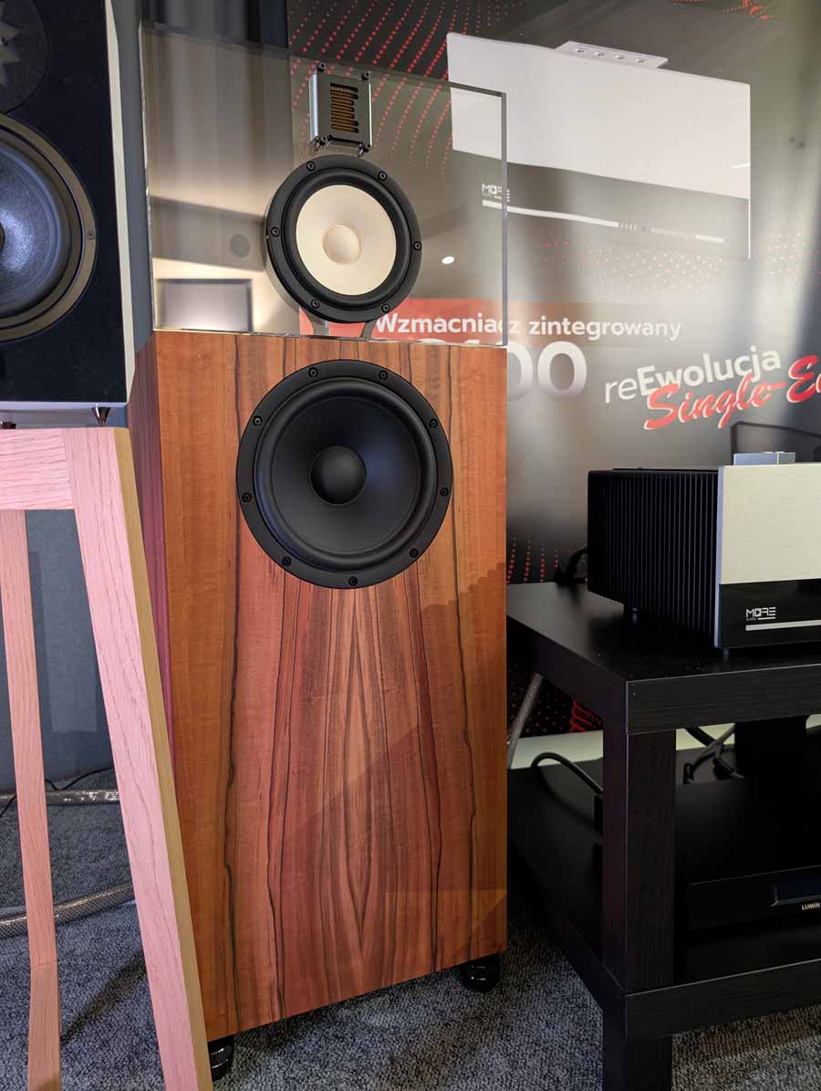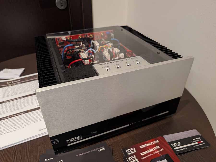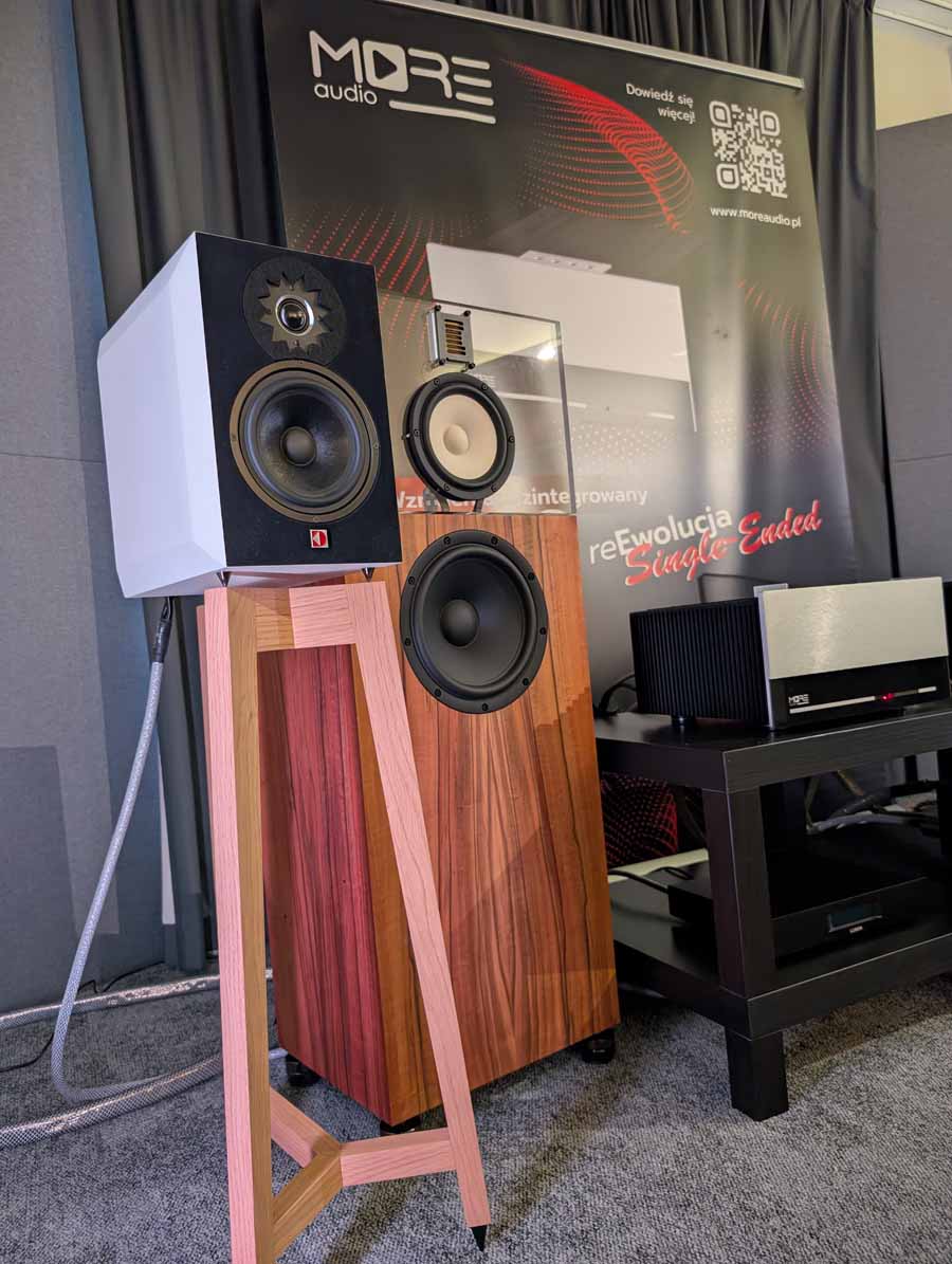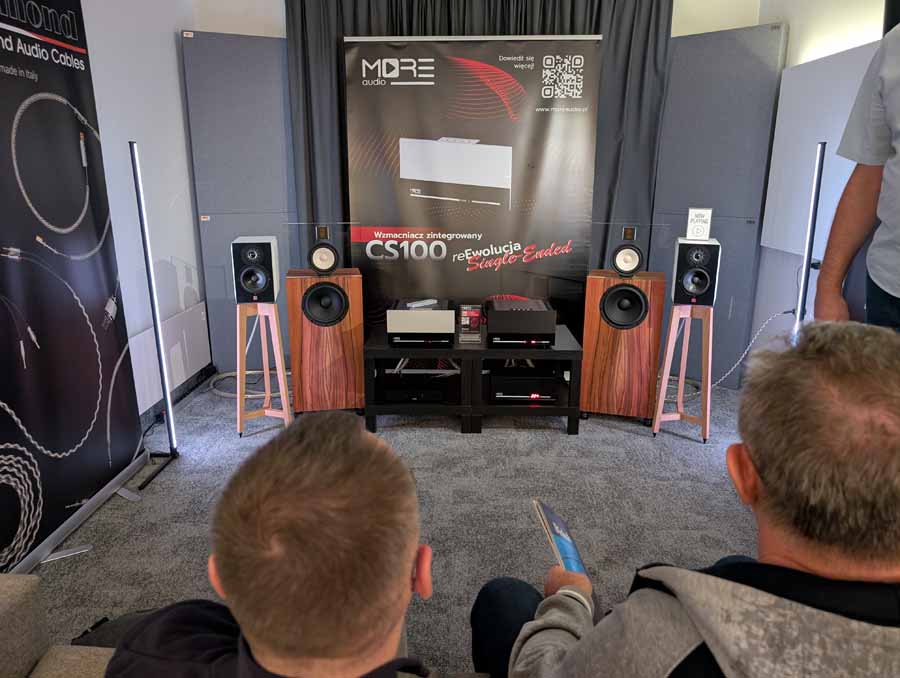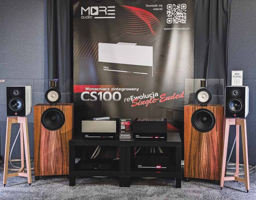 In here we had the MORE Audio CS100 amplifier, now featuring a black front panel. They were pairing their amp with a pair of Qualio IQ Ultra speakers and the Kultura Dźwięku Scratch speakers (which were playing when we visited the room). The small speakers had good range and filled this room nicely.