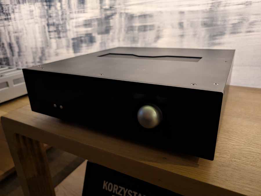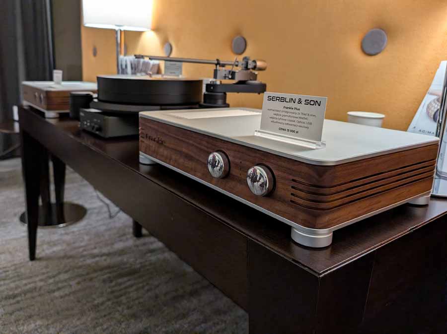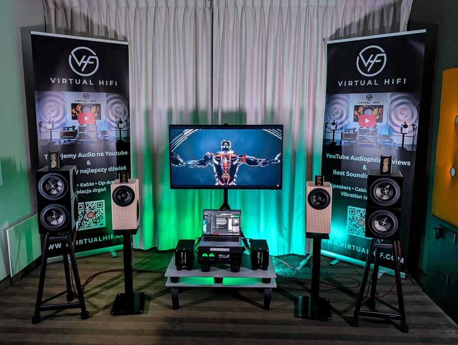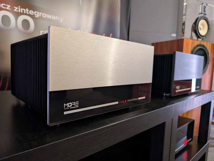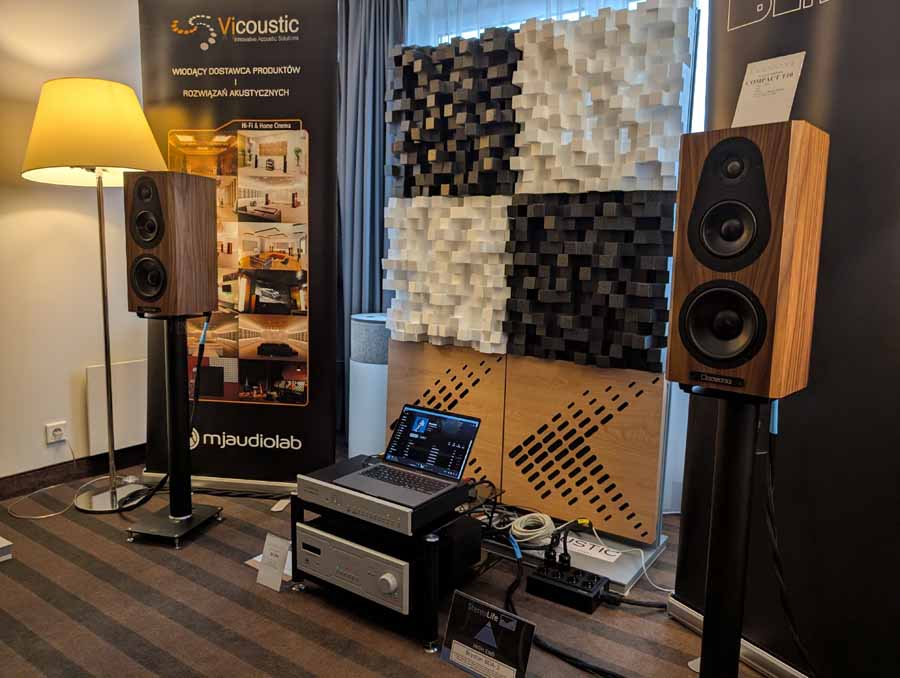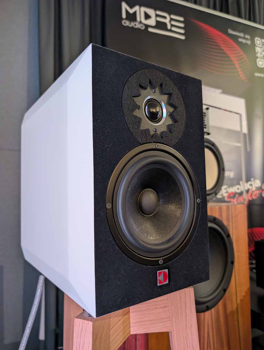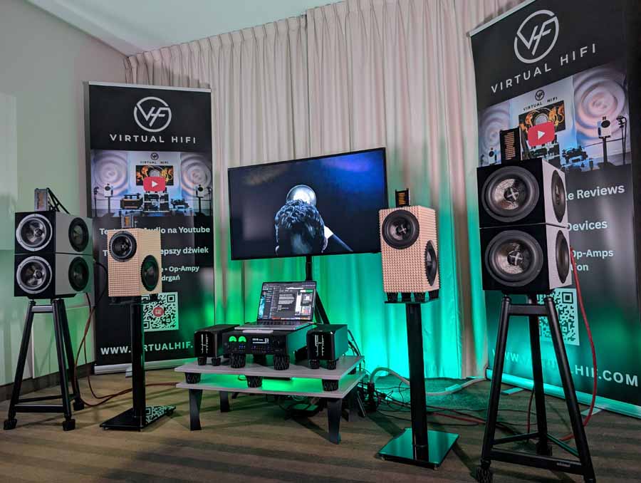 In here we had the MORE Audio CS100 amplifier, now featuring a black front panel. They were pairing their amp with a pair of Qualio IQ Ultra speakers and the Kultura Dźwięku Scratch speakers (which were playing when we visited the room). The small speakers had good range and filled this room nicely.