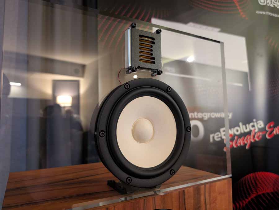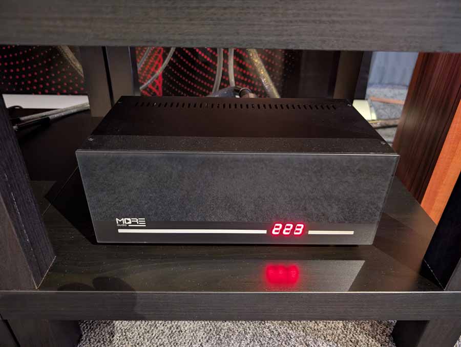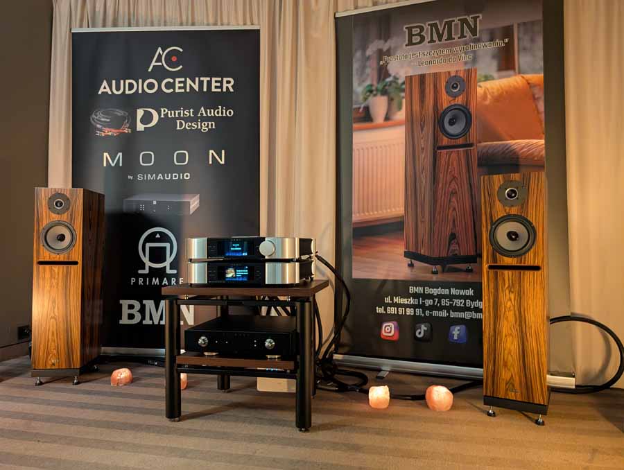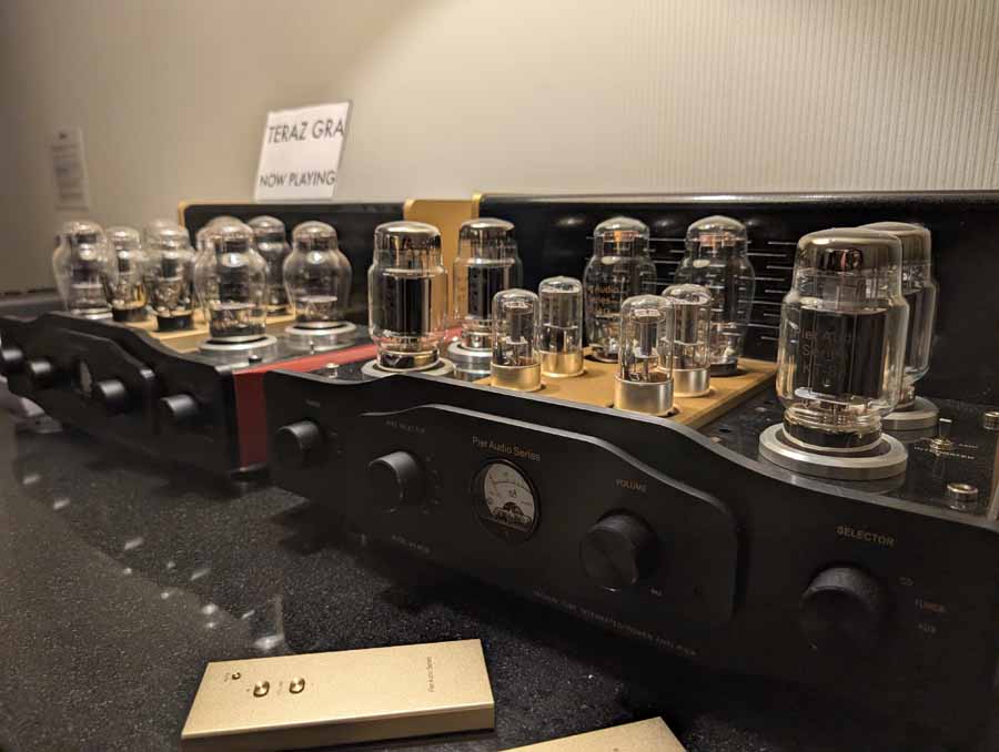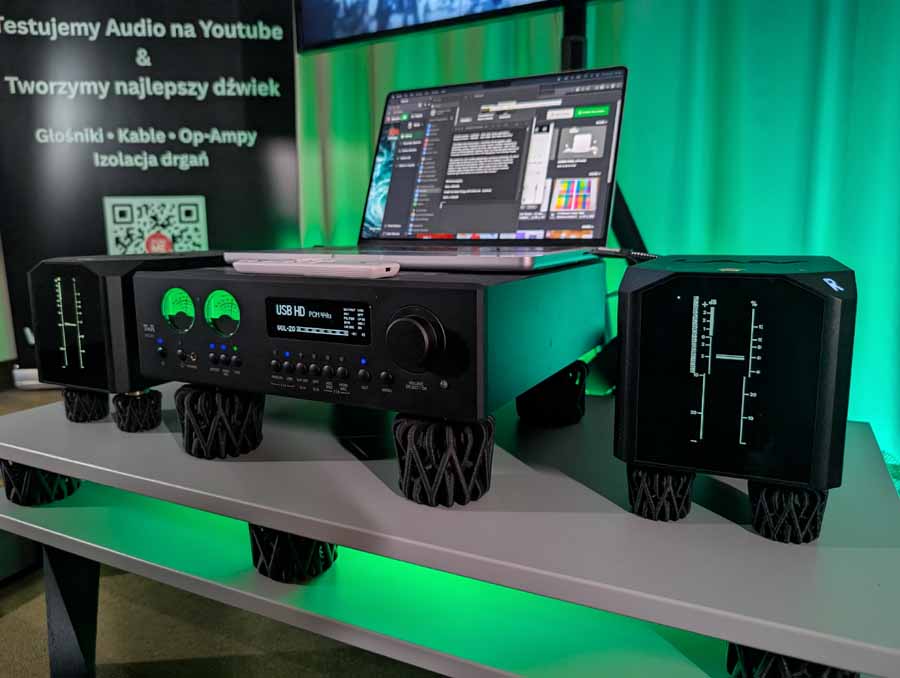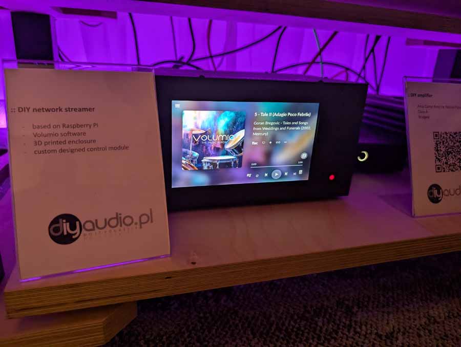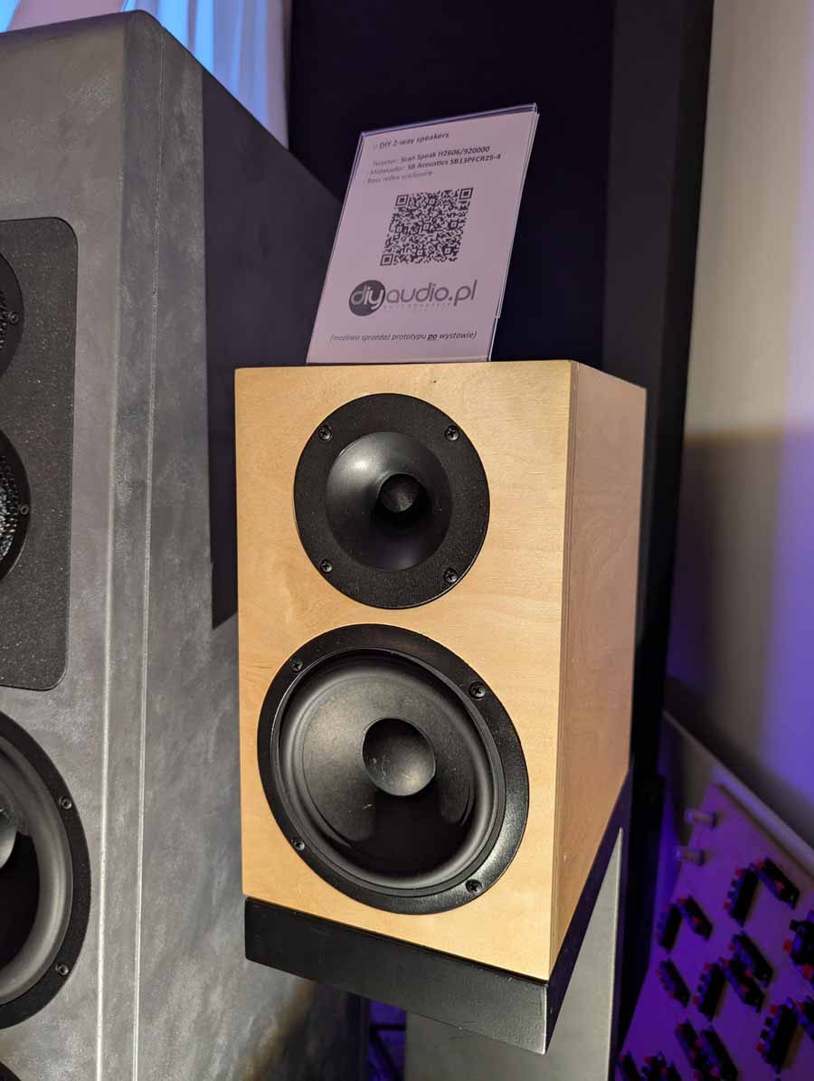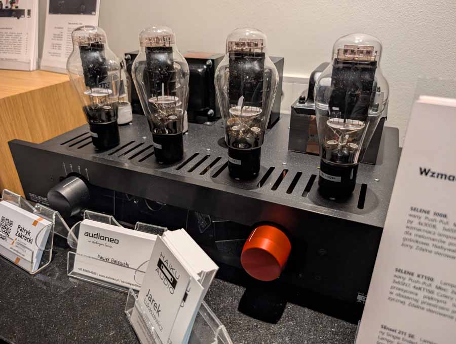 In here we had the MORE Audio CS100 amplifier, now featuring a black front panel. They were pairing their amp with a pair of Qualio IQ Ultra speakers and the Kultura Dźwięku Scratch speakers (which were playing when we visited the room). The small speakers had good range and filled this room nicely.