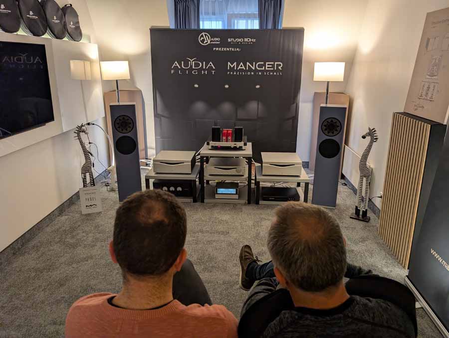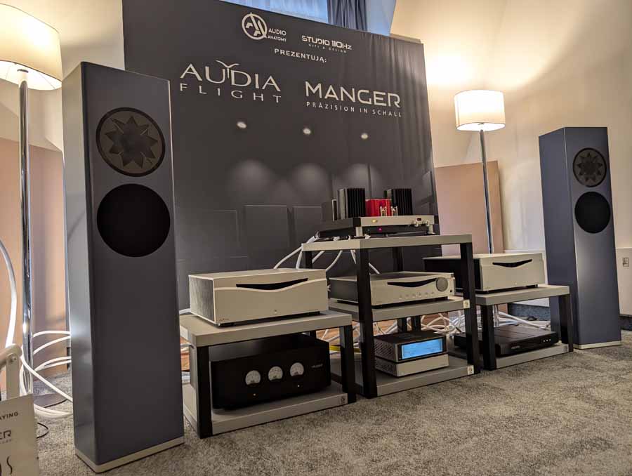 In the first Audio Anatomy room we had a pair of Manger P2 speakers running off a Matrix Audio TT-1 streaming transport, and Pathos TT amp. They also had the Audia Flight FLS8 and other components on display in this system. These Manger speakers have impeccable timing, with great transient response and deep bass when called for and the mid/high driver uses some interesting tech.