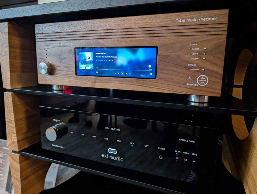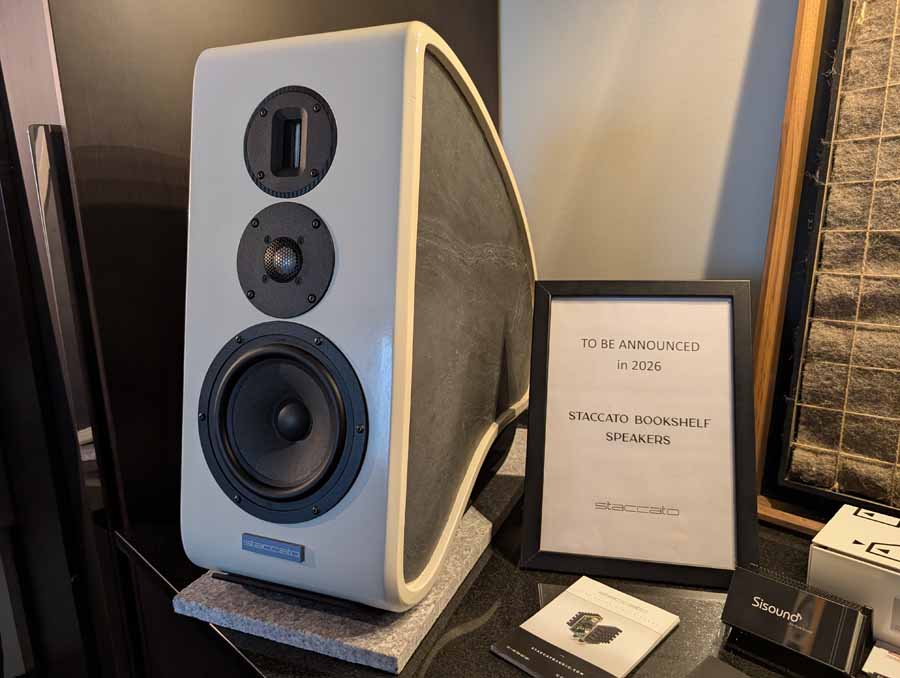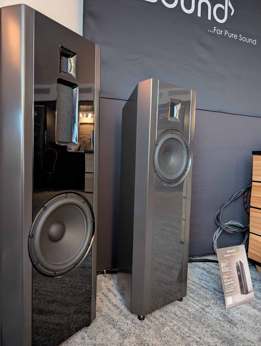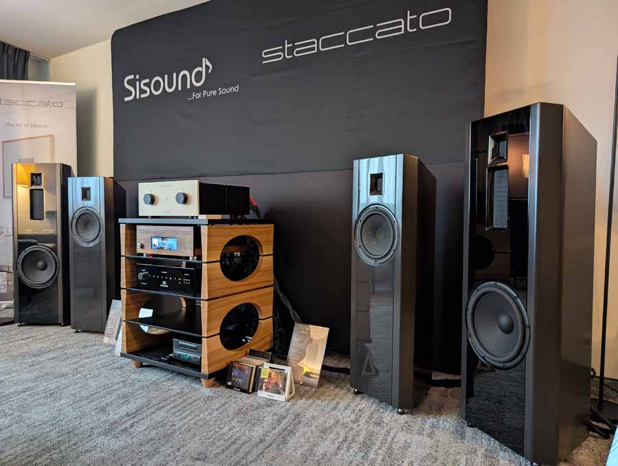 Sisound make a range of audio systems, this year they were debuting their new Solidus X and Solidus M speakers which use planar ribbon drivers in sealed enclosures. They were using their Staccato BU-01 Class-A integrated amplifier to drive them. We heard the Solidus X and these are my kind of sound, controlled, deep, and punchy due to their sealed enclosure. The ribbon tweeters offer up great detail without sounding harsh, and these seemed to handle any kind of music thrown at them – a highlight of the show for me sound wise.