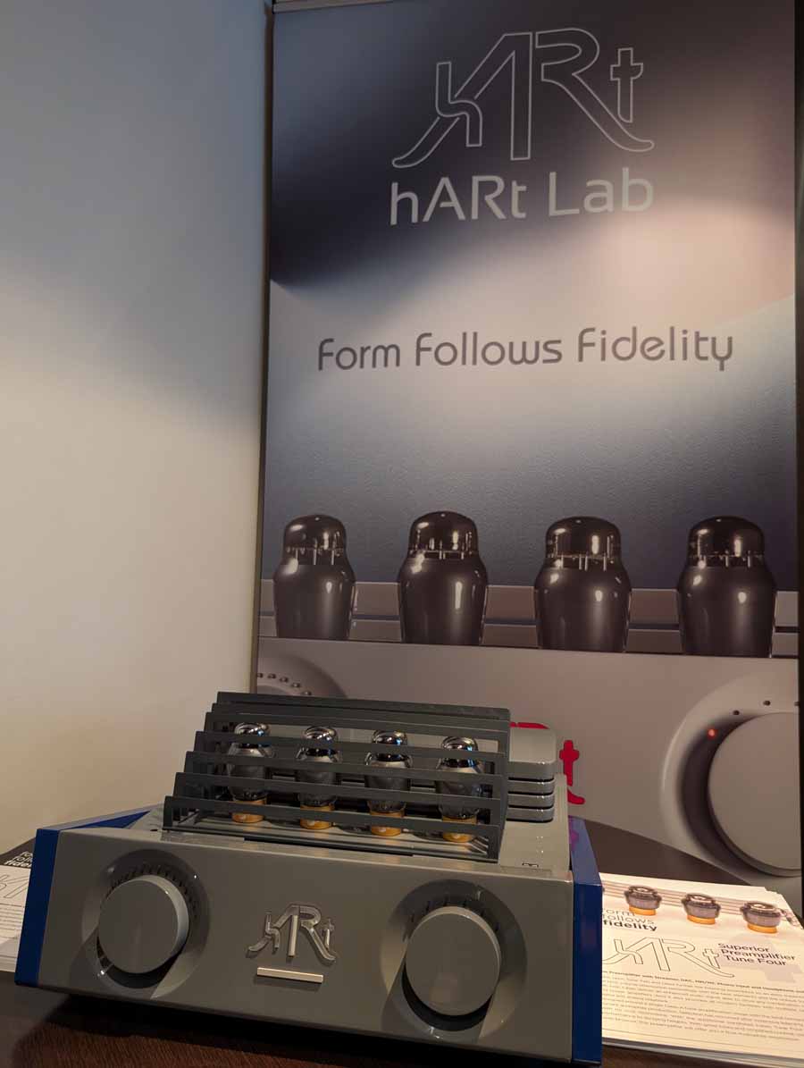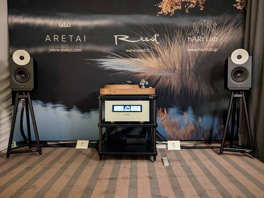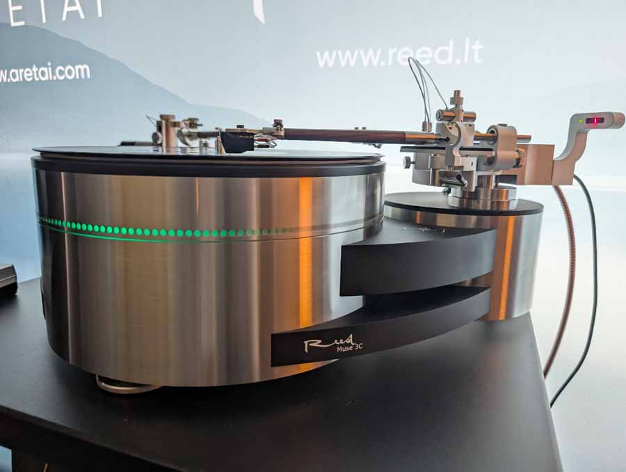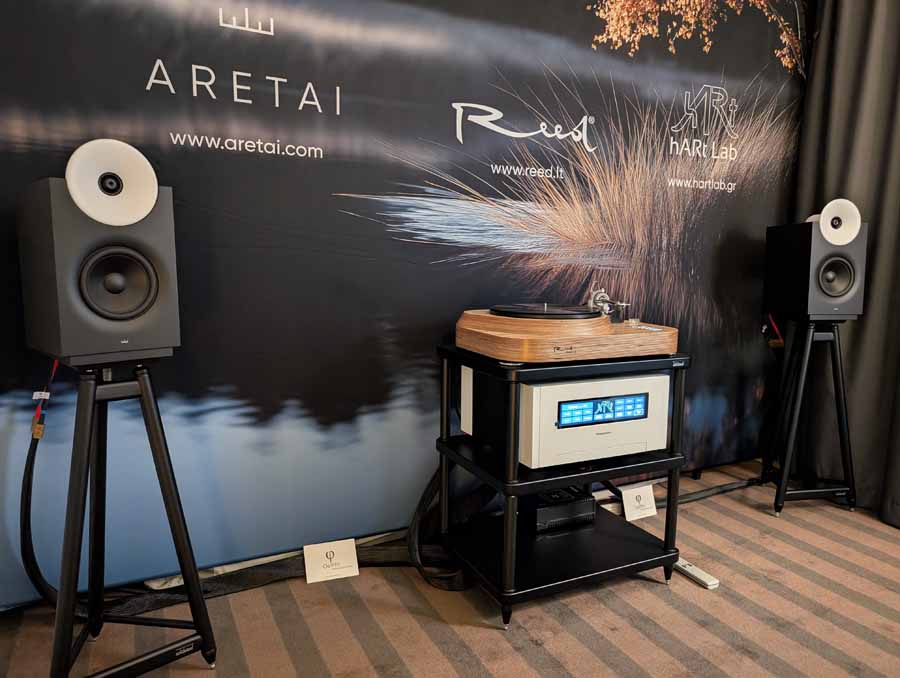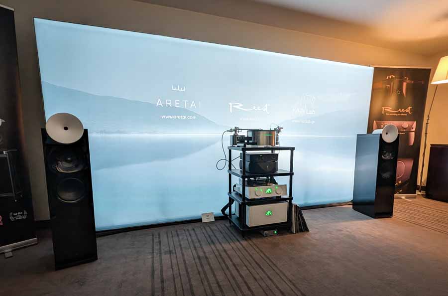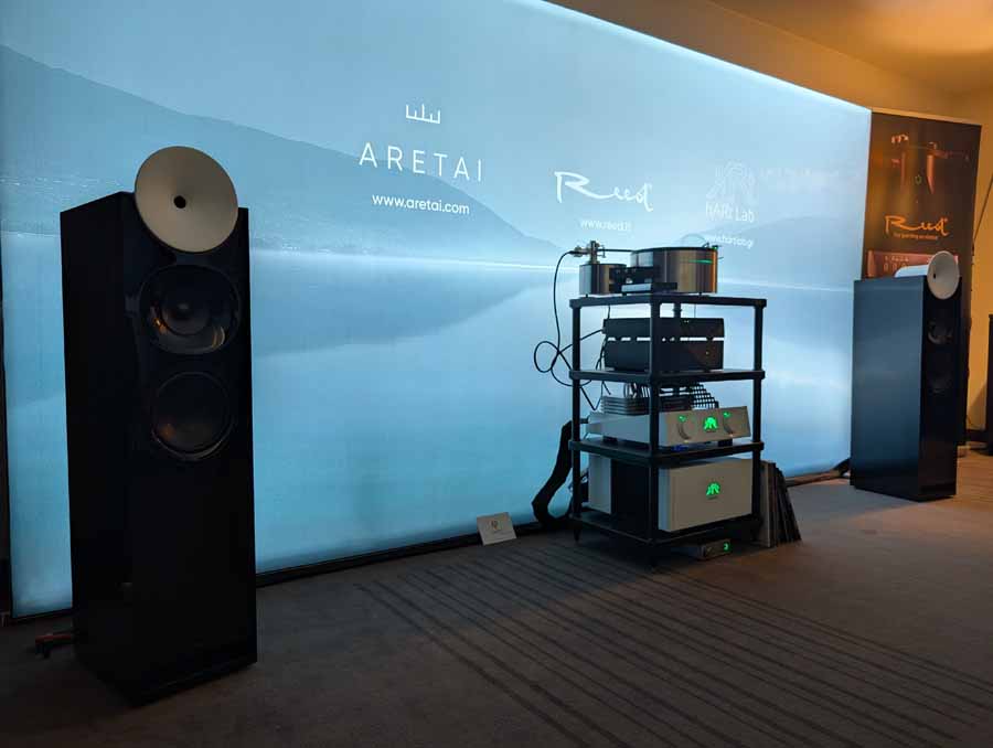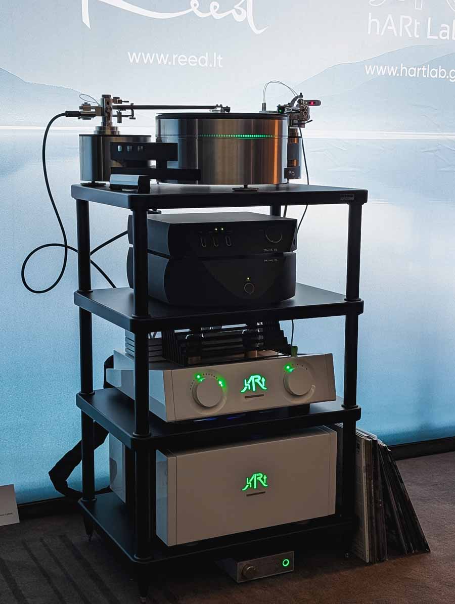 Latvia’s Aretai speakers, Reed turntable, hARt labs electronics. This system was big, bold, and slightly sharp in the treble at times – I feel they need a little more space to really breathe. They had a Reed Muse 3C turntable, Reed EQ, Reed PS, and OePhi cabling throughout.