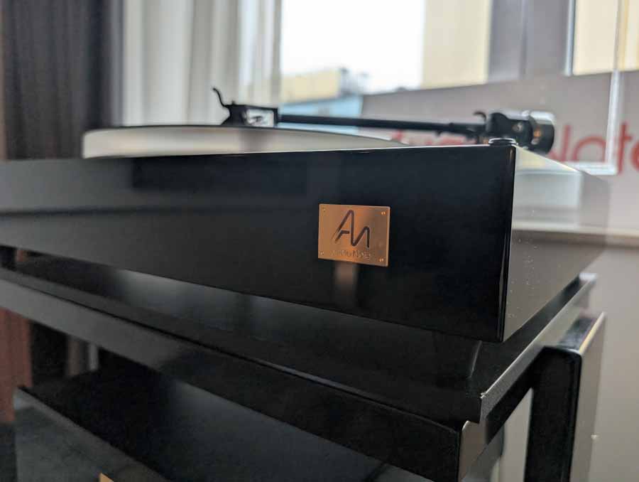 Room 402 had kit from Grandinote, including the Solo integrated amplifier, Volta streamer, Celio phono stage and Mach 2 Estrema speakers – the analogue front end was supplied by J.Sikora, in the form of an Aspire turntable with Marasakino Sumile MC cartridge. Another fairly easy-going room, the J.Sikora Apire is a lovely looking turntable and the Sumile cartridge seemed to be a great pairing.
