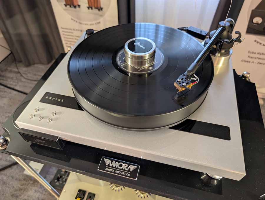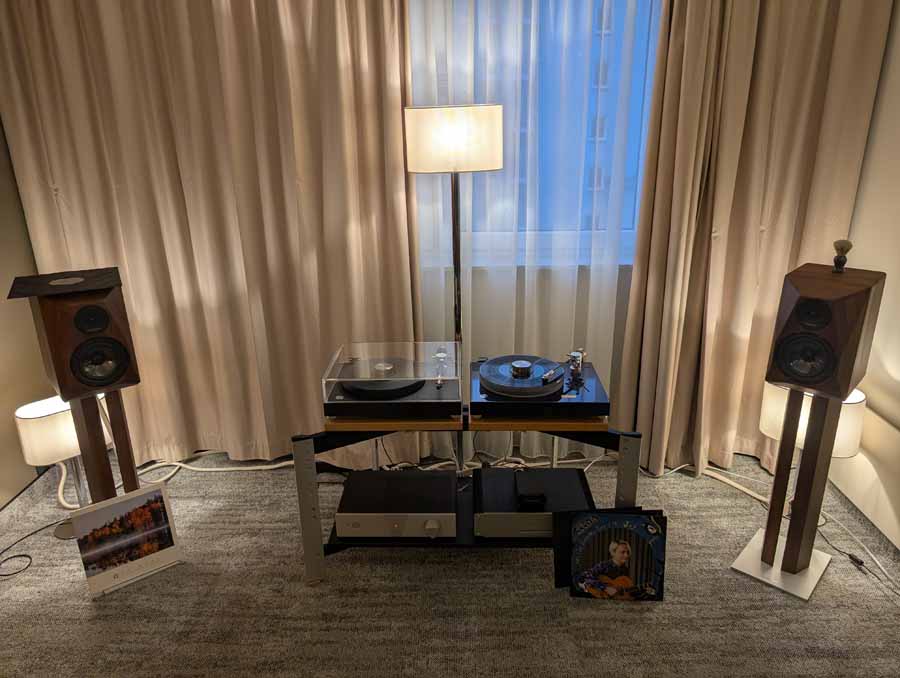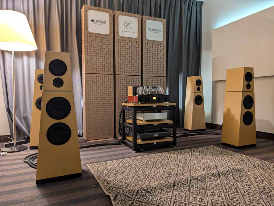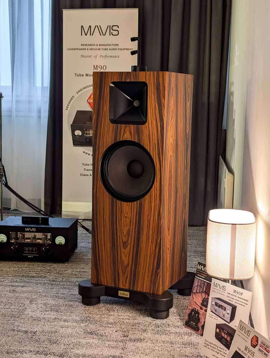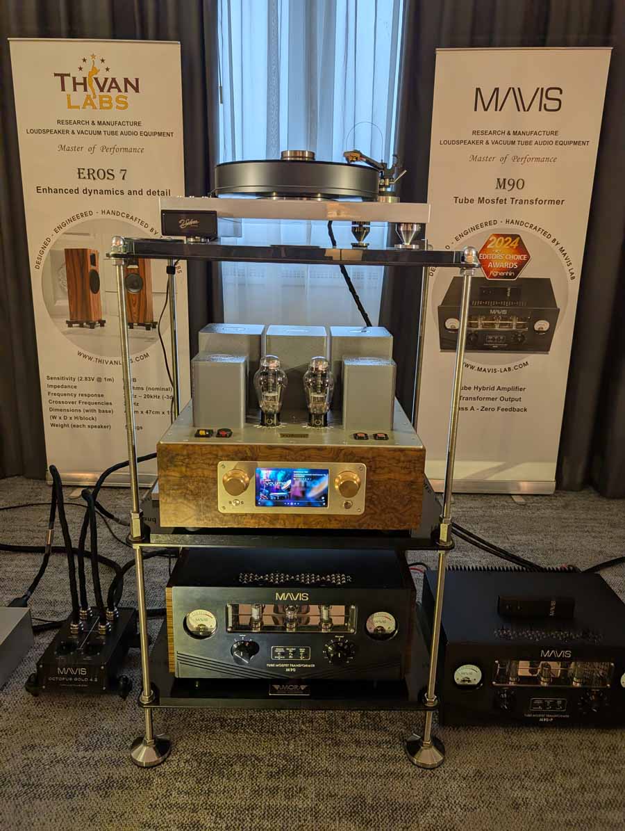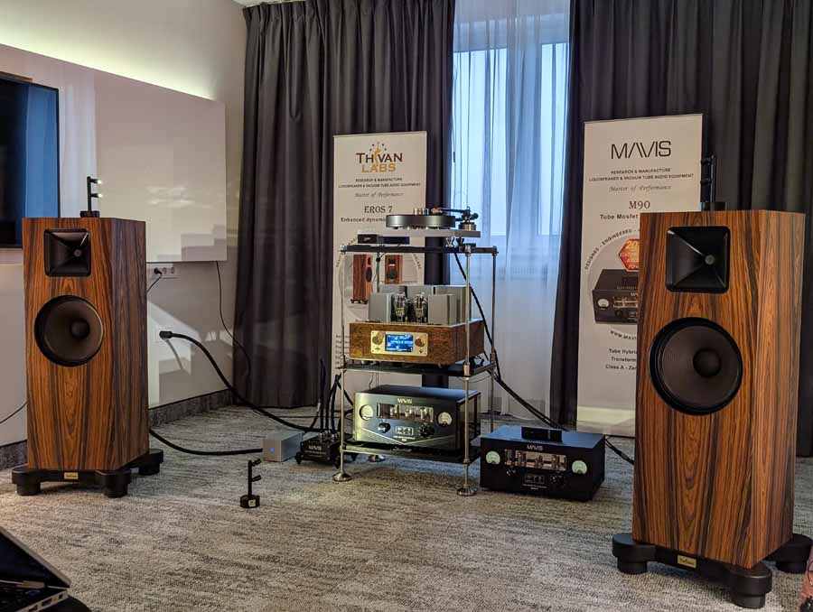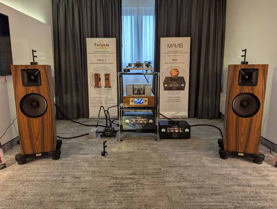 ThivanLabs are a Vietnamese company, this year they had their Eros 7 speakers being driven by a Mavis M90S tube hybrid integrated amplifier, ThivanLabs TMS9 Premium 300b pre-amp with MM/MC phono stage and headphone output, J.Sikora Aspire turntable and AIDAS cartridge. As you’d expect from a horn loaded speaker like this, they are quite lively, yet balanced, and controlled with huge scale.