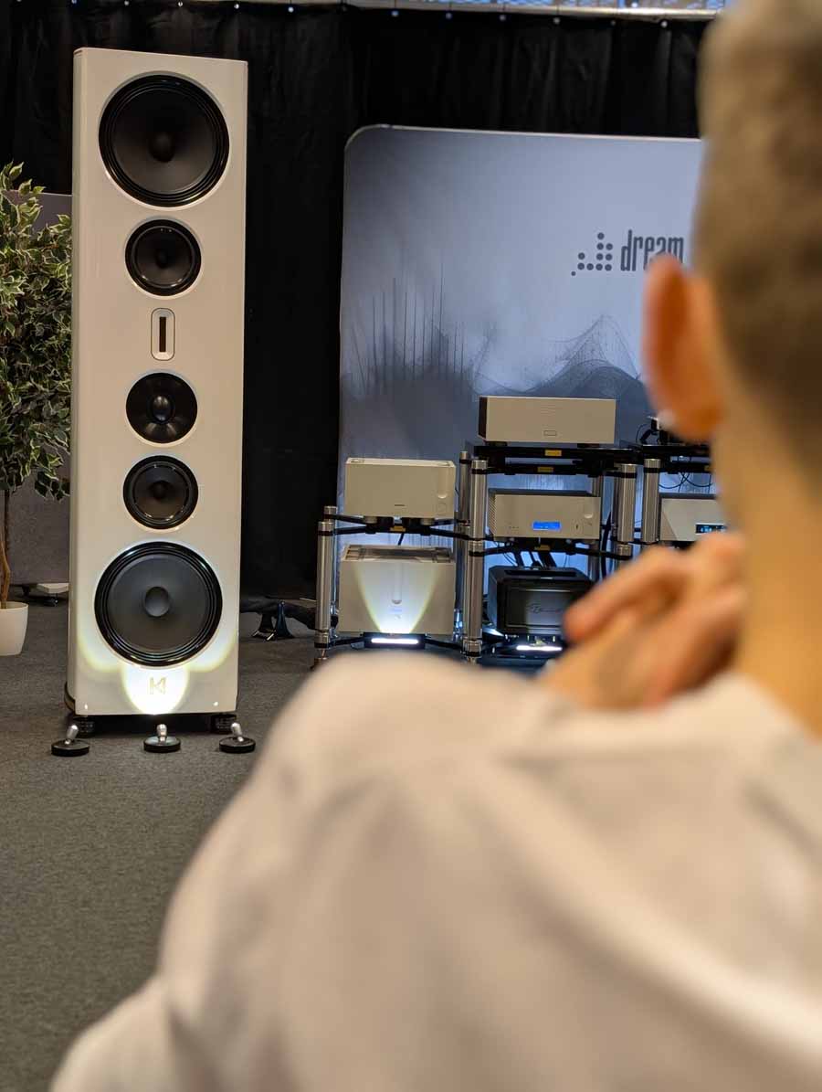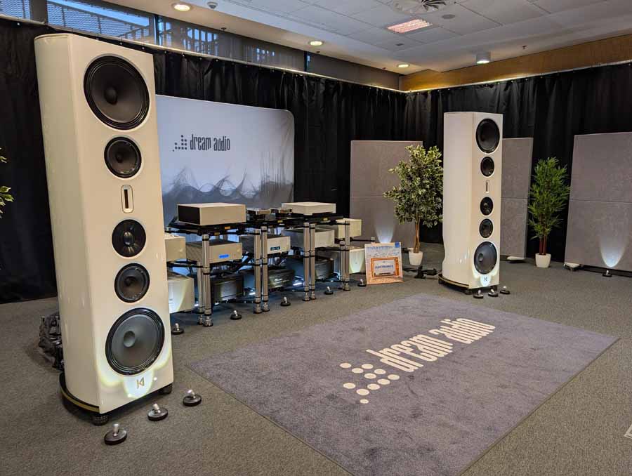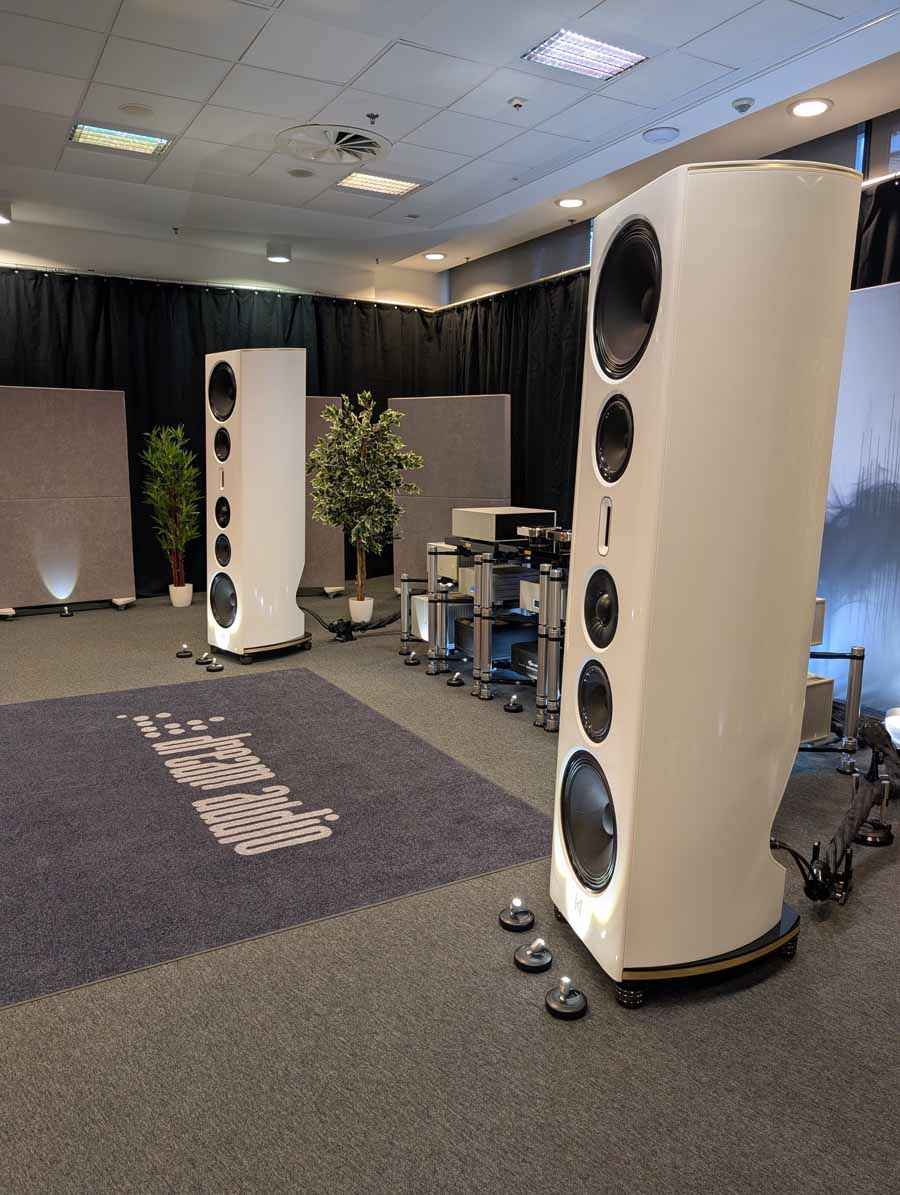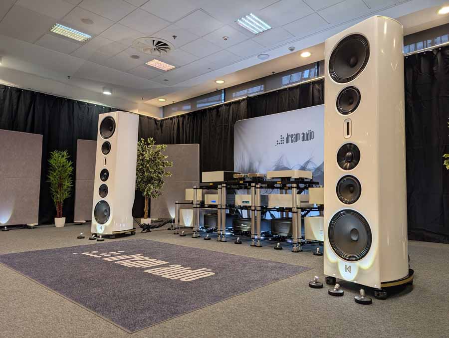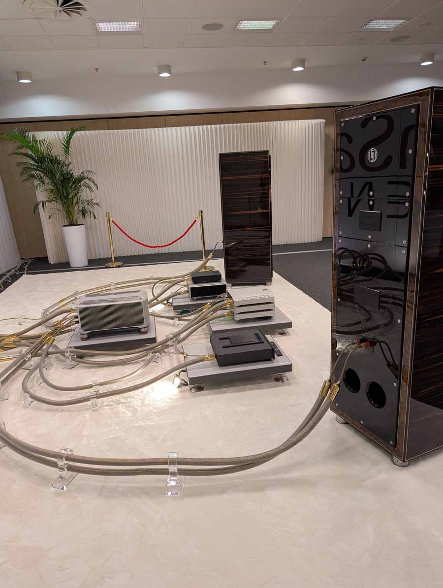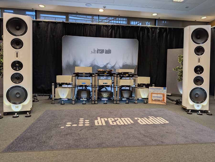 DreamAudio is a distributor focused on complete systems. At the show the company presented the world premiere of the Kroma Atelier Maribel loudspeakers, driven by Ypsilon Electronics Silver Edition 4 monoblocks and a matching preamplifier. The setup included the Taiko Olympus server, Stage III Concepts cabling, Carbide Audio isolators, HiFi Stay racks, and Telos power distribution and grounding. The Maribel stands over two metres tall and is priced at about €425,000.
