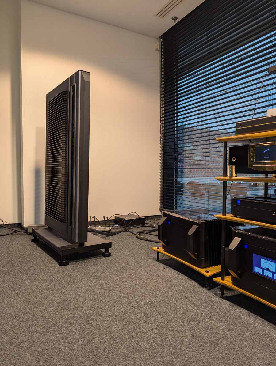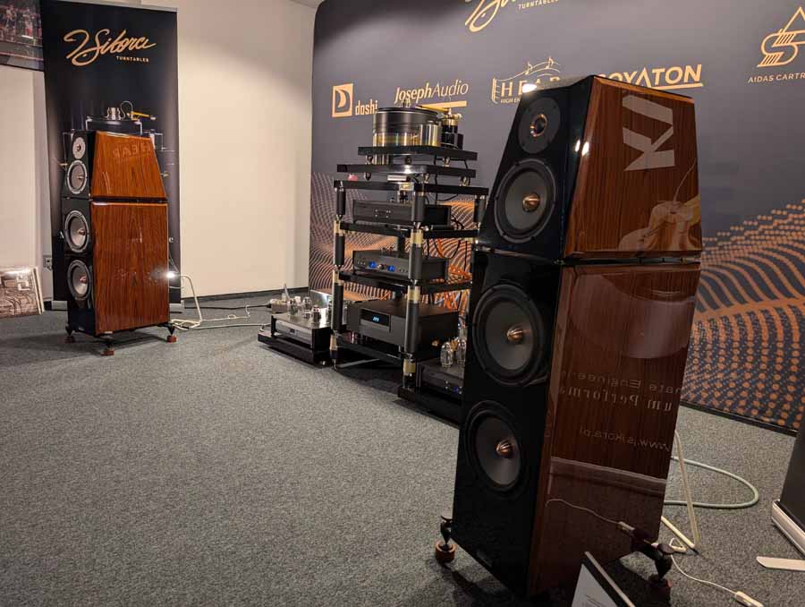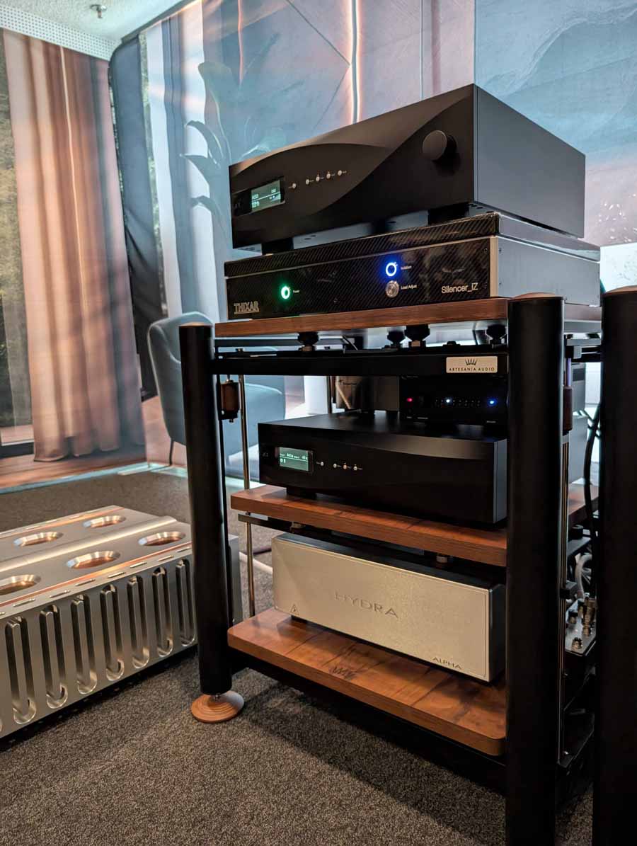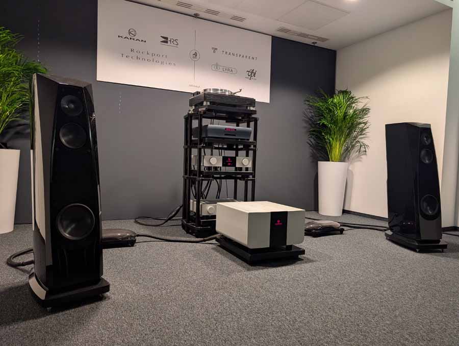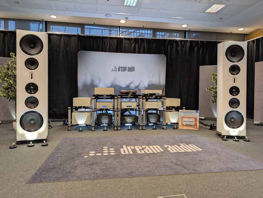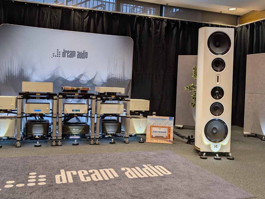 DreamAudio is a distributor focused on complete systems. At the show the company presented the world premiere of the Kroma Atelier Maribel loudspeakers, driven by Ypsilon Electronics Silver Edition 4 monoblocks and a matching preamplifier. The setup included the Taiko Olympus server, Stage III Concepts cabling, Carbide Audio isolators, HiFi Stay racks, and Telos power distribution and grounding. The Maribel stands over two metres tall and is priced at about €425,000.