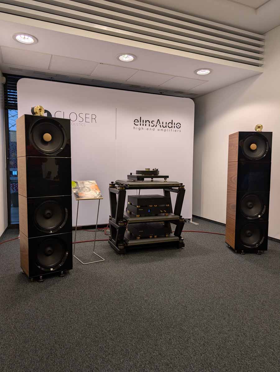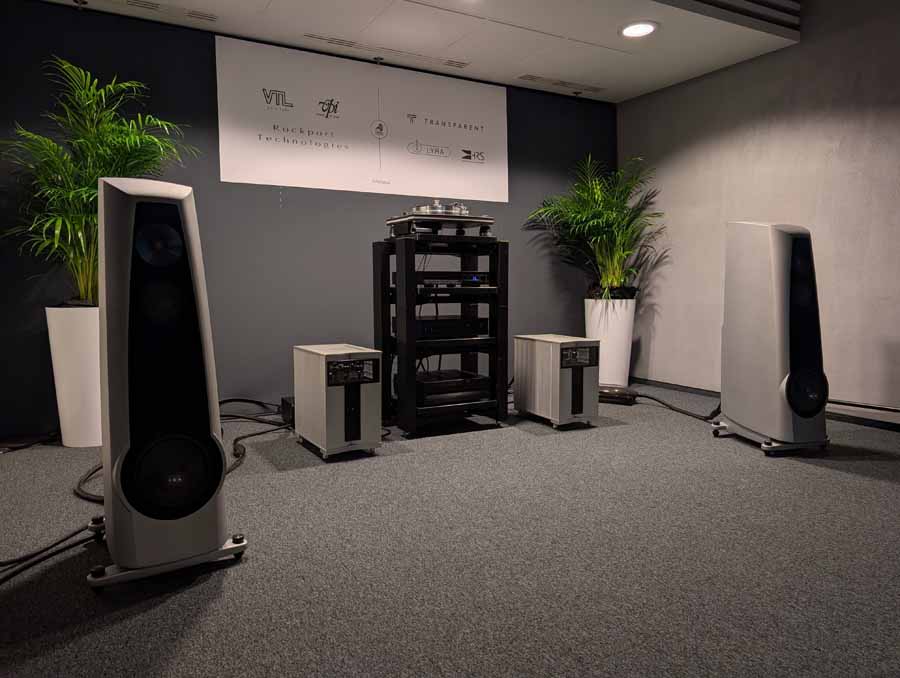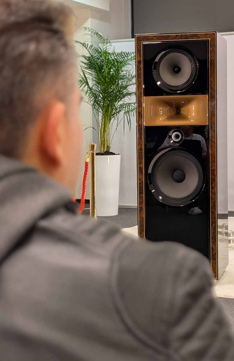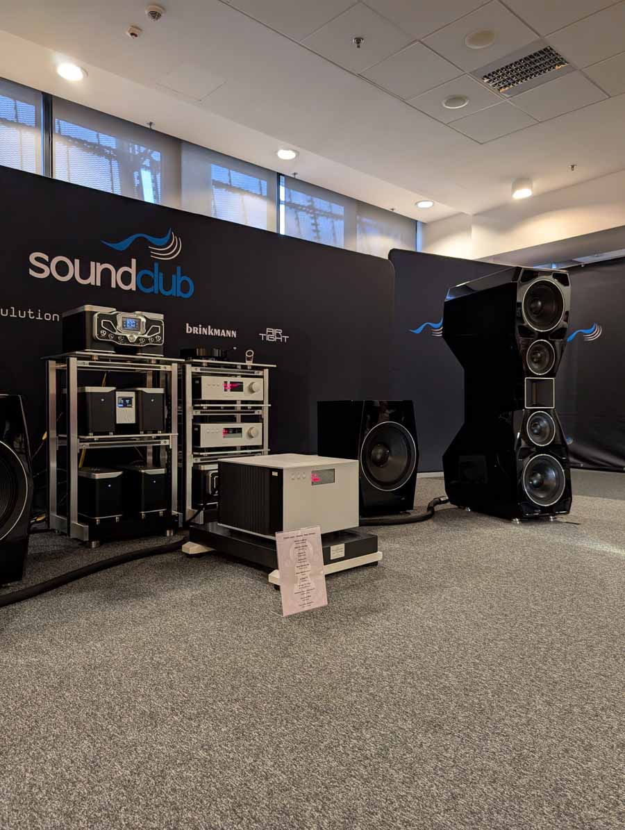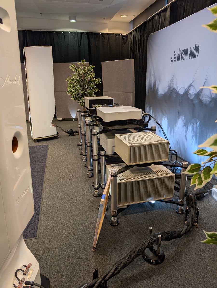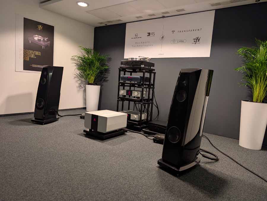 DreamAudio is a distributor focused on complete systems. At the show the company presented the world premiere of the Kroma Atelier Maribel loudspeakers, driven by Ypsilon Electronics Silver Edition 4 monoblocks and a matching preamplifier. The setup included the Taiko Olympus server, Stage III Concepts cabling, Carbide Audio isolators, HiFi Stay racks, and Telos power distribution and grounding. The Maribel stands over two metres tall and is priced at about €425,000.
