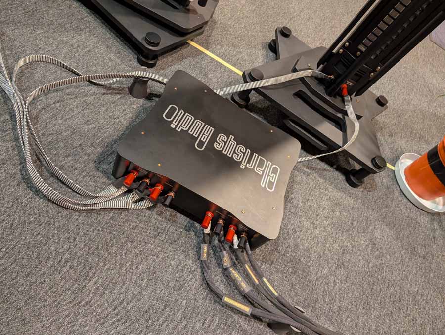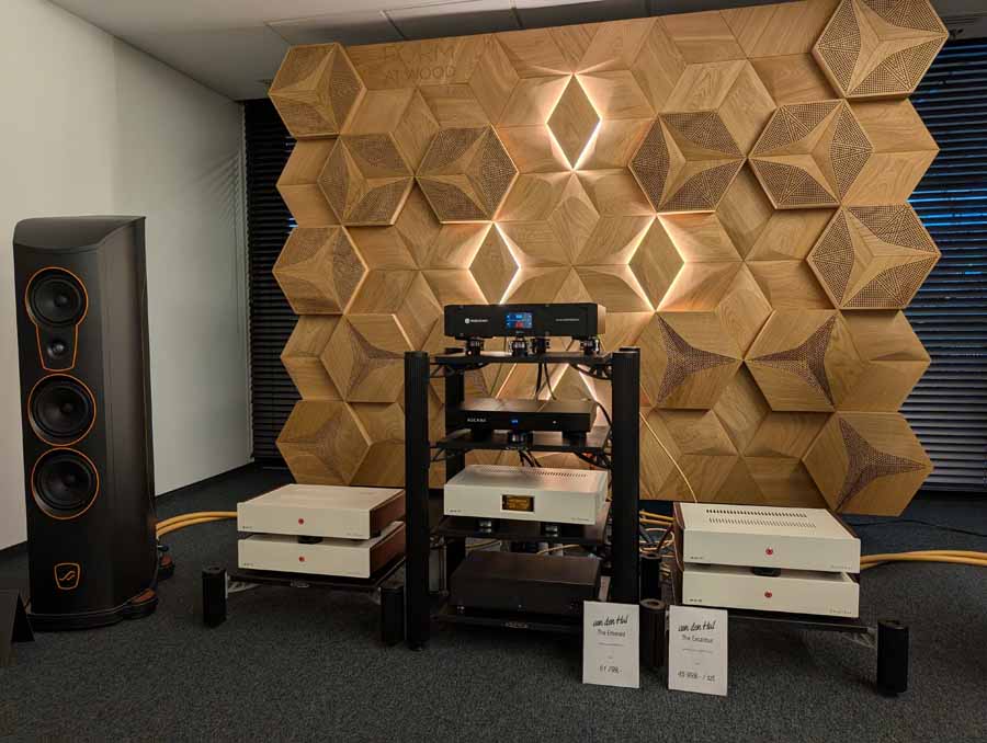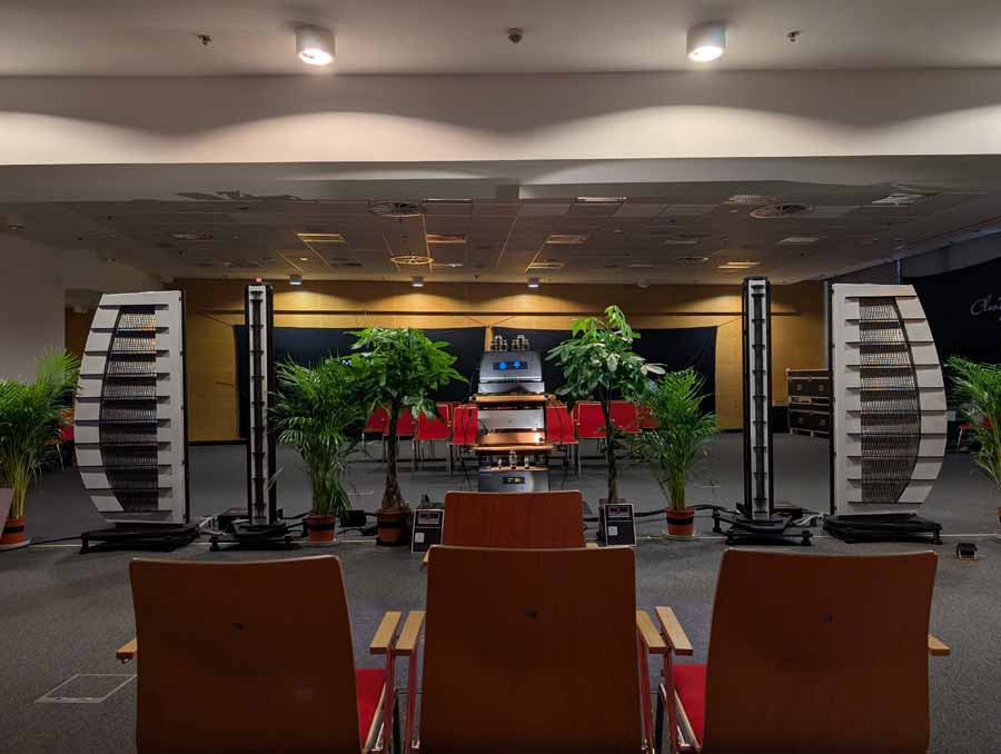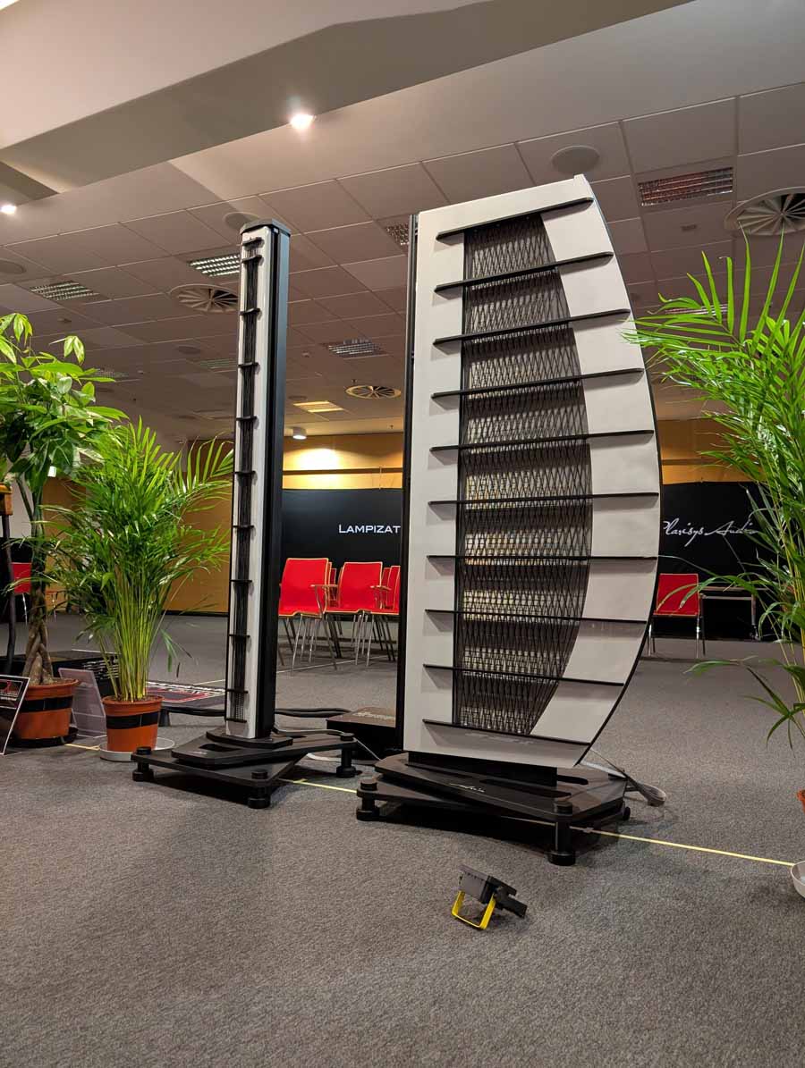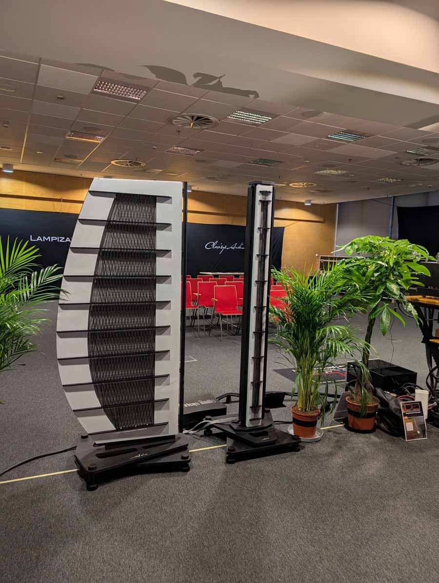 Clarisys Audio presented the 143,000€ Aria in this room. It is a four panel dipole planar magnetic ribbon loudspeaker. The construction focused on low colouration and seamless integration across the range.