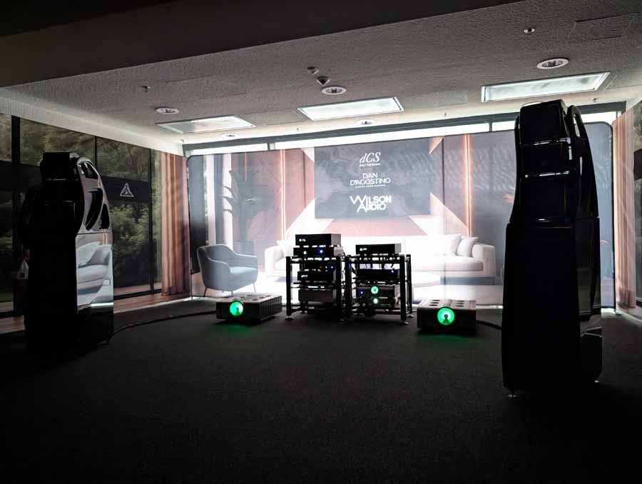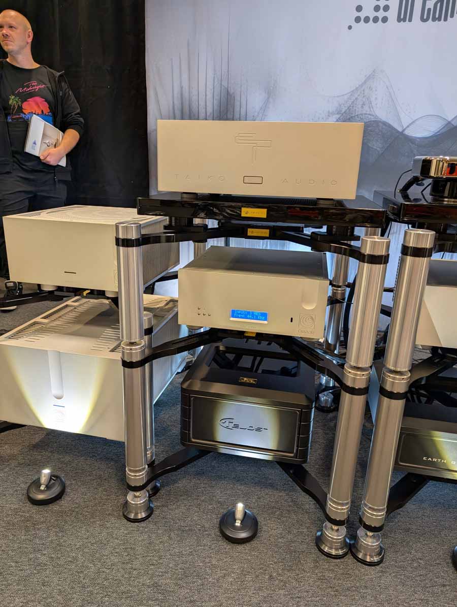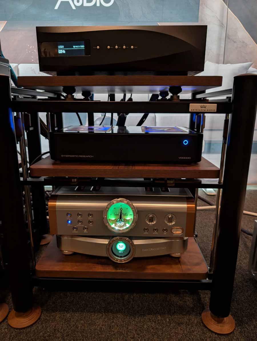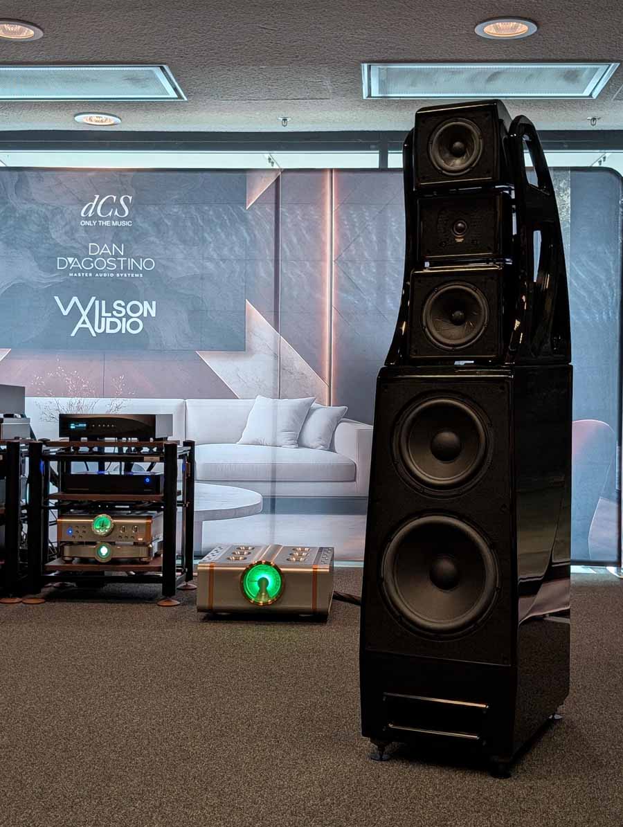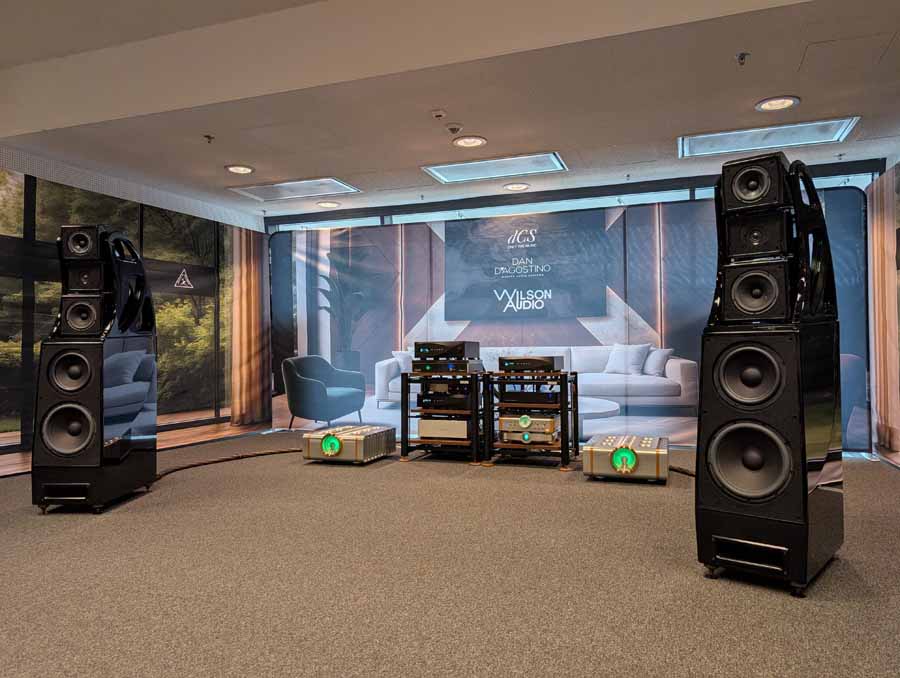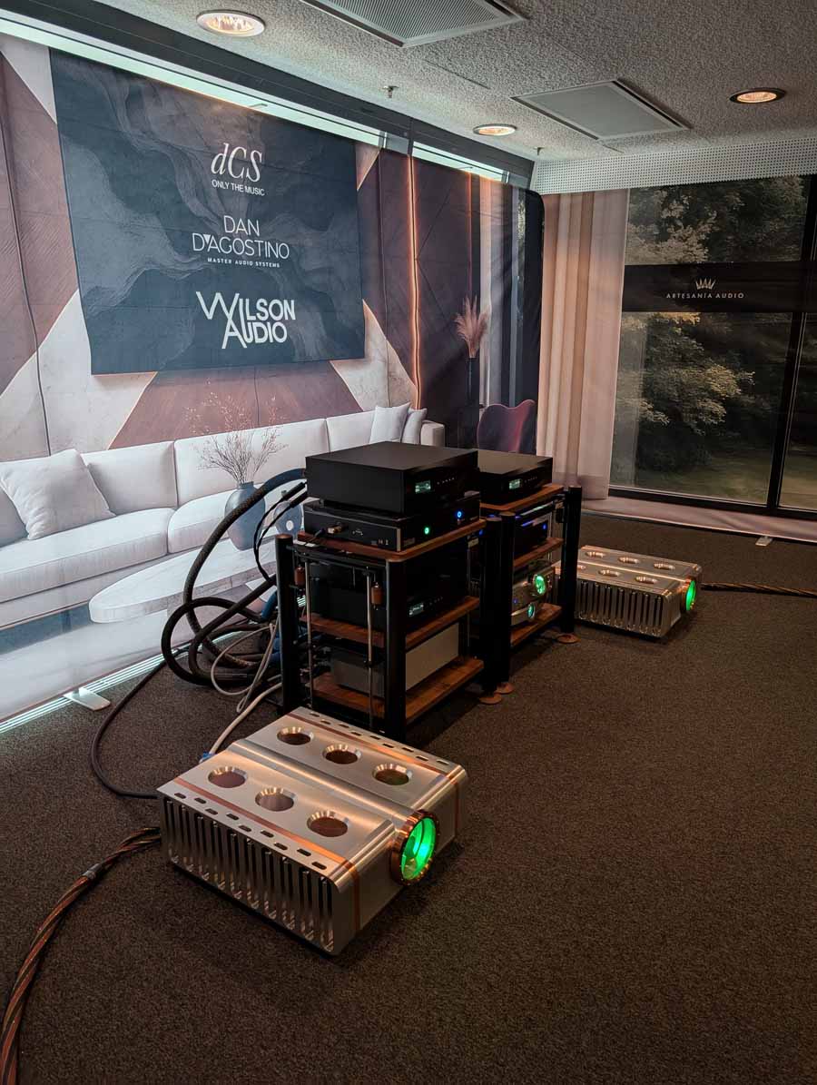 TV Studio 2, another hectic room that we had to fight to get into, featured an ultra high end setup centred on Wilson Audio Alexx VFx loudspeakers and Dan D’Agostino Relentless 800 monoblocks, paired with the new Momentum C2 preamplifier. The digital source was a full dCS Vivaldi Apex system with upsampler, master clock, and a Synergistic Research Voodoo server. Additional components included Shunyata Research Altaira X grounding, Artesania Audio racks, and cables from Stealth Audio, Shunyata Research, and Synergistic Research.