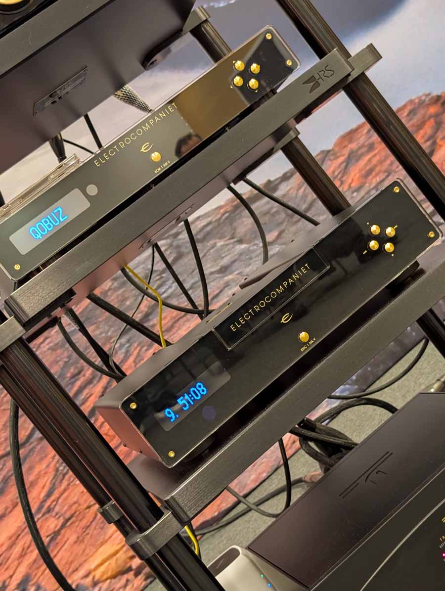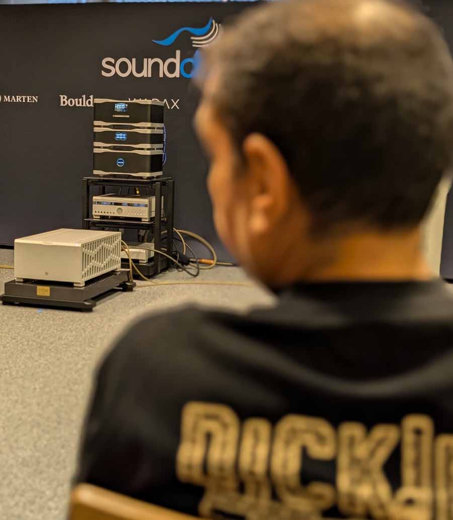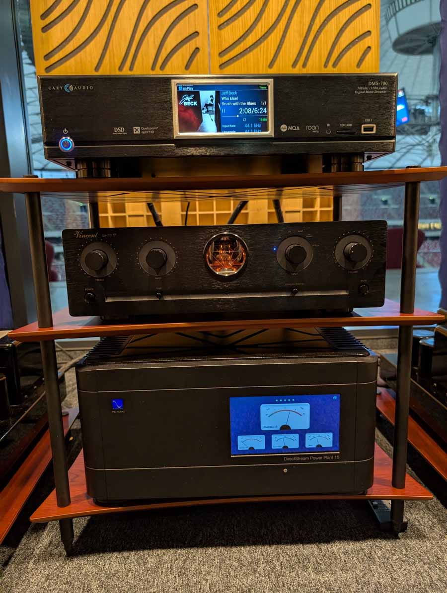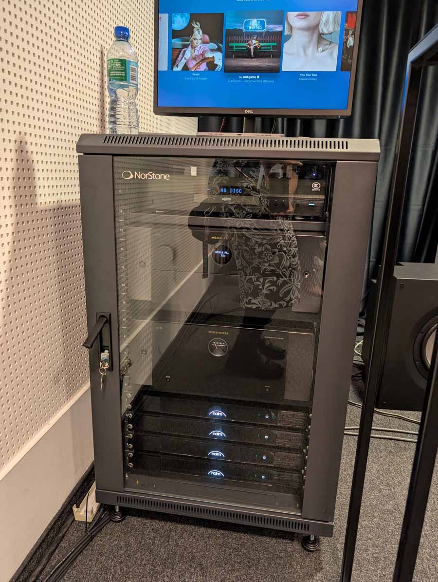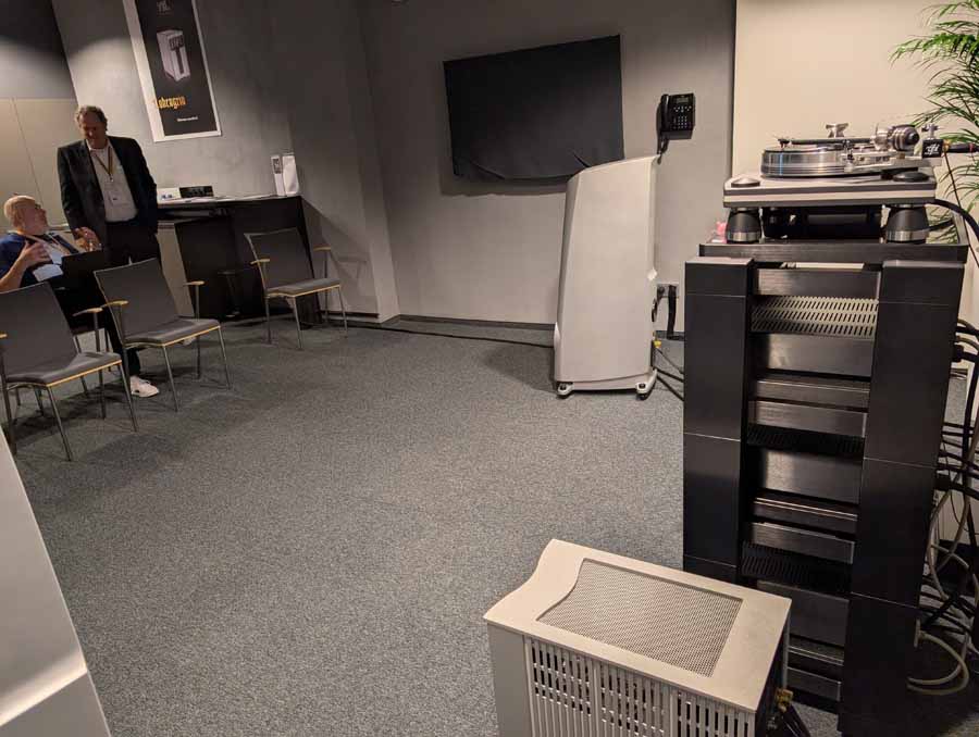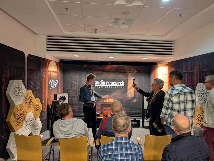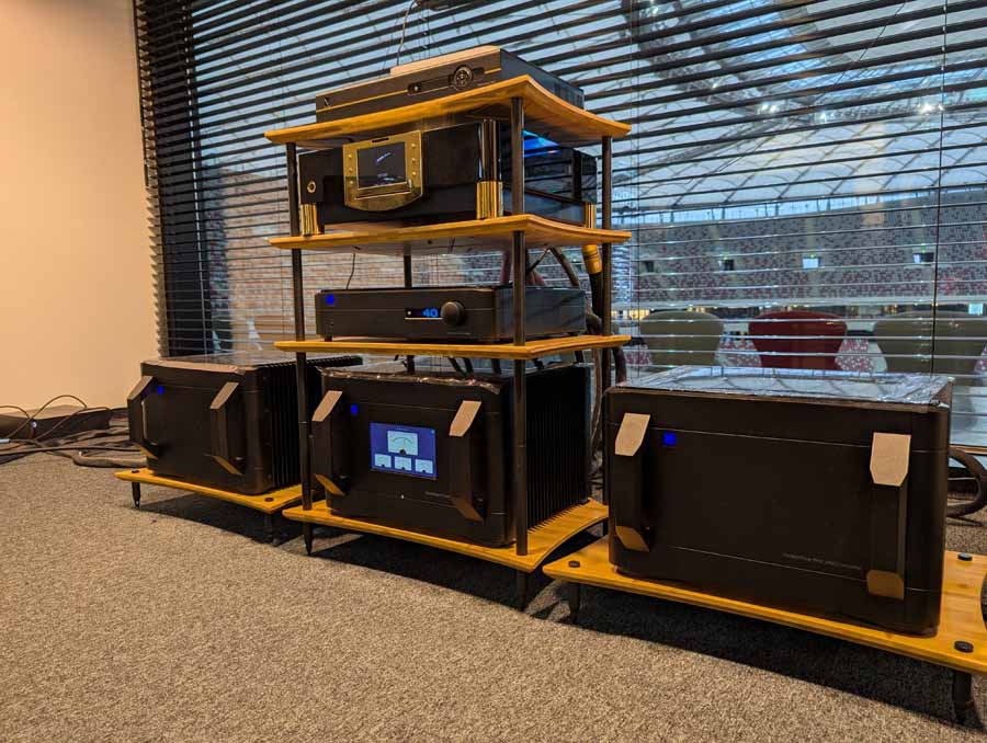 TV Studio 2, another hectic room that we had to fight to get into, featured an ultra high end setup centred on Wilson Audio Alexx VFx loudspeakers and Dan D’Agostino Relentless 800 monoblocks, paired with the new Momentum C2 preamplifier. The digital source was a full dCS Vivaldi Apex system with upsampler, master clock, and a Synergistic Research Voodoo server. Additional components included Shunyata Research Altaira X grounding, Artesania Audio racks, and cables from Stealth Audio, Shunyata Research, and Synergistic Research.