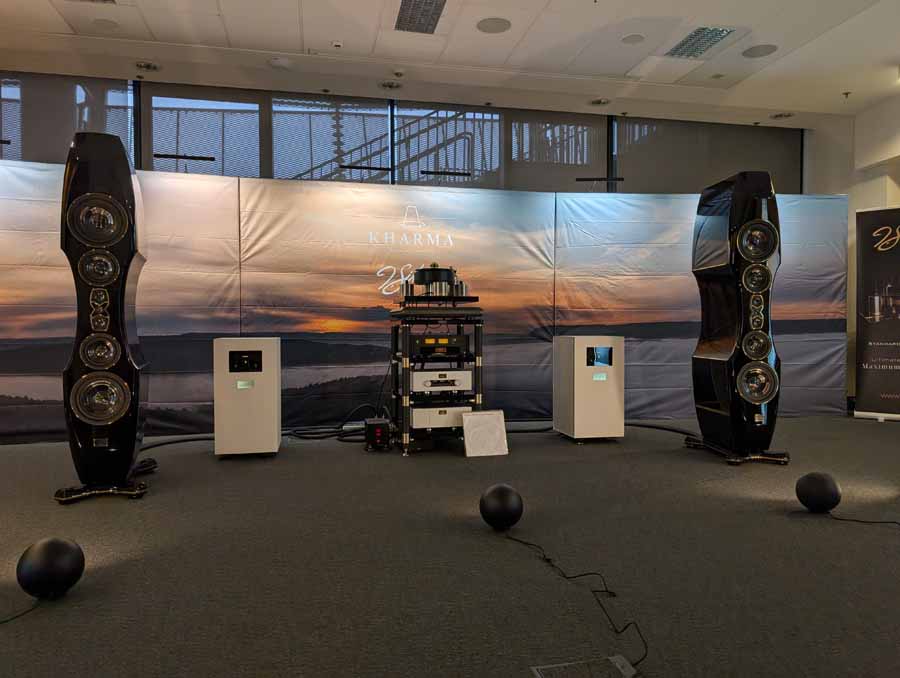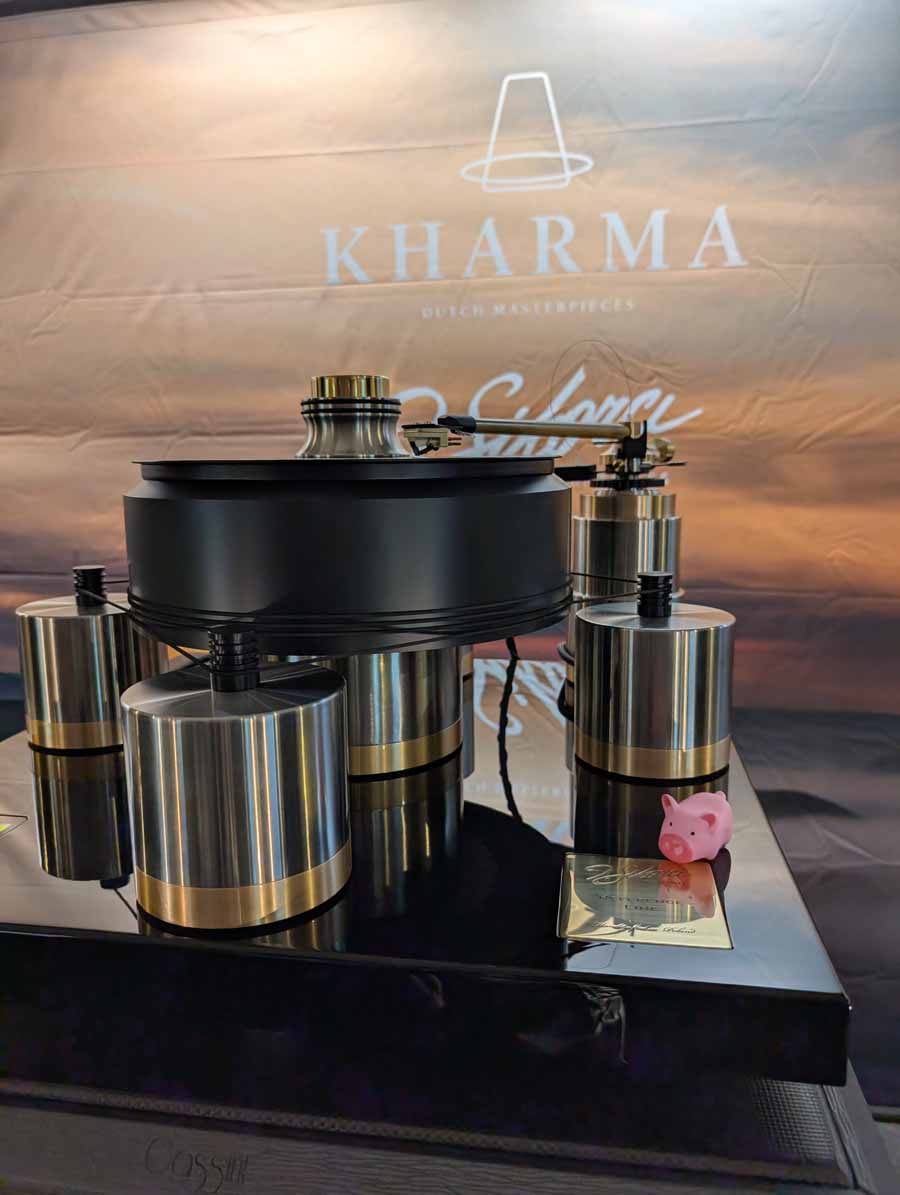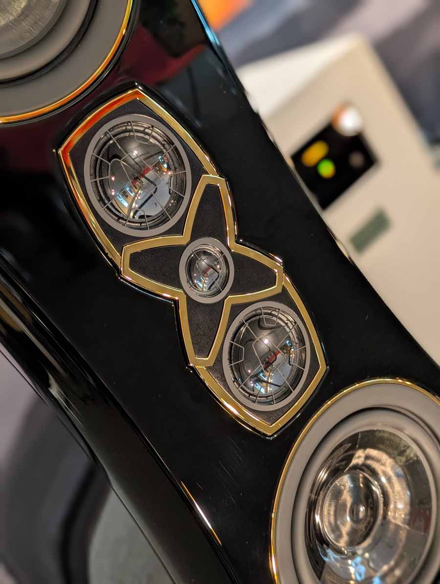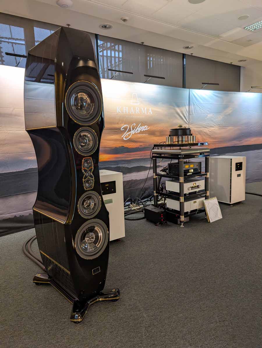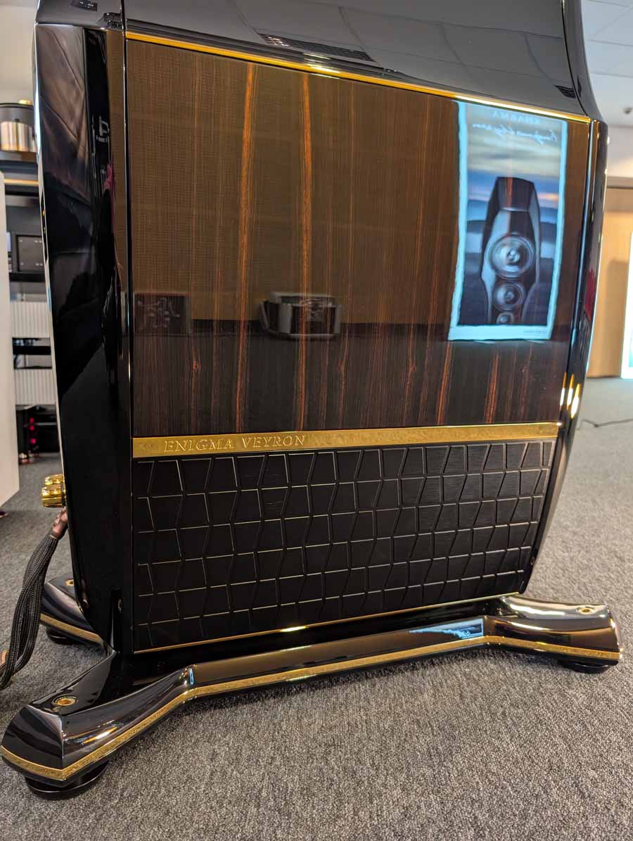 Kharma showed the Enigma Veyron 2D loudspeakers at about €475,000. The EV 2D uses a larger cabinet in the range and makes extensive use of diamond tweeters, with three at the centre of each speaker.