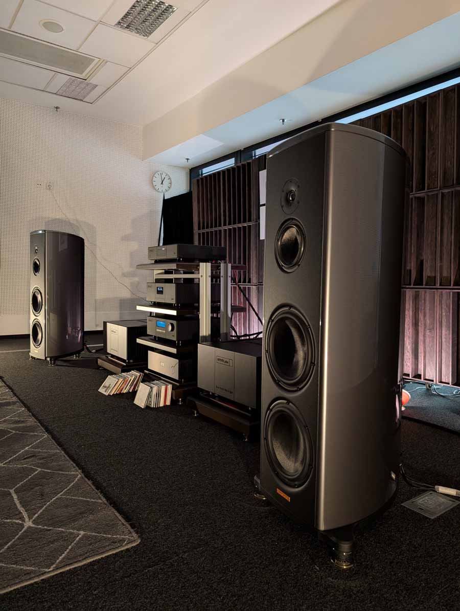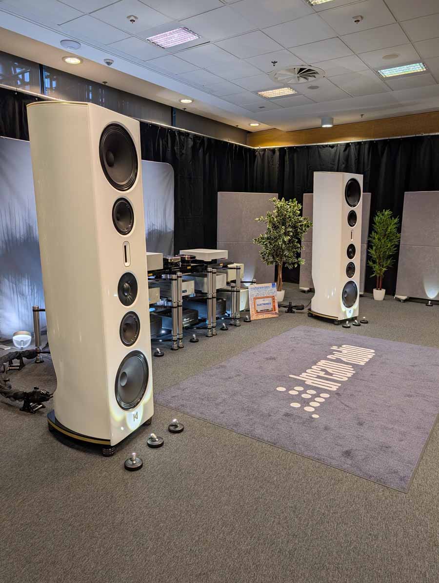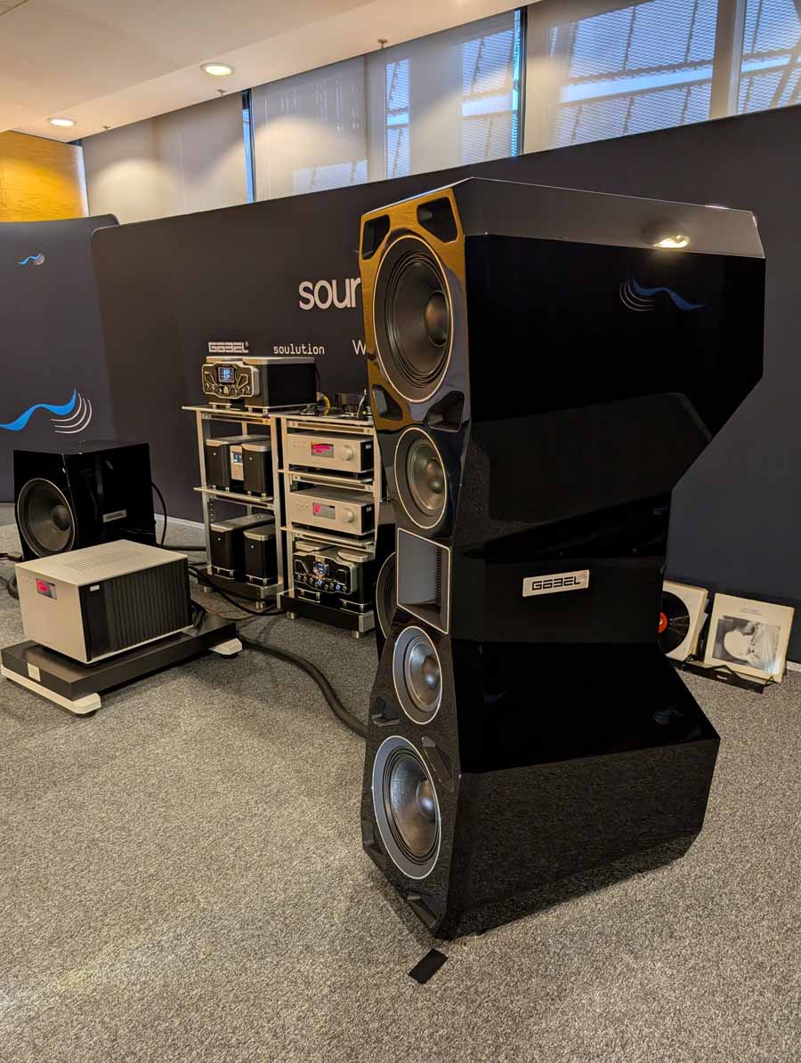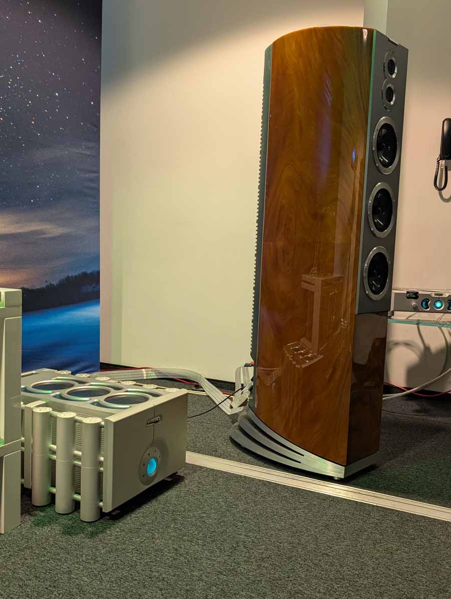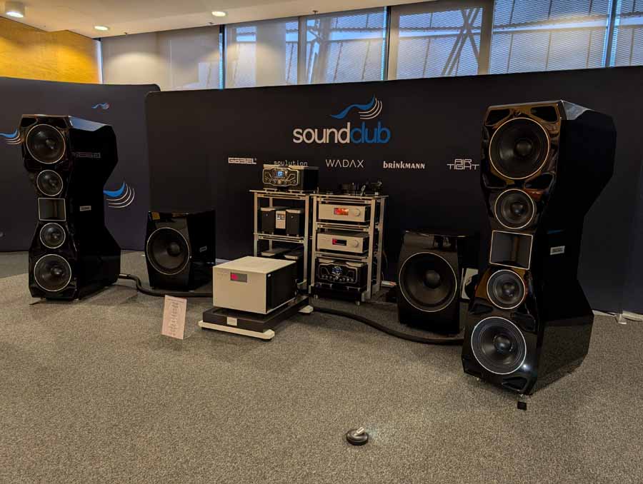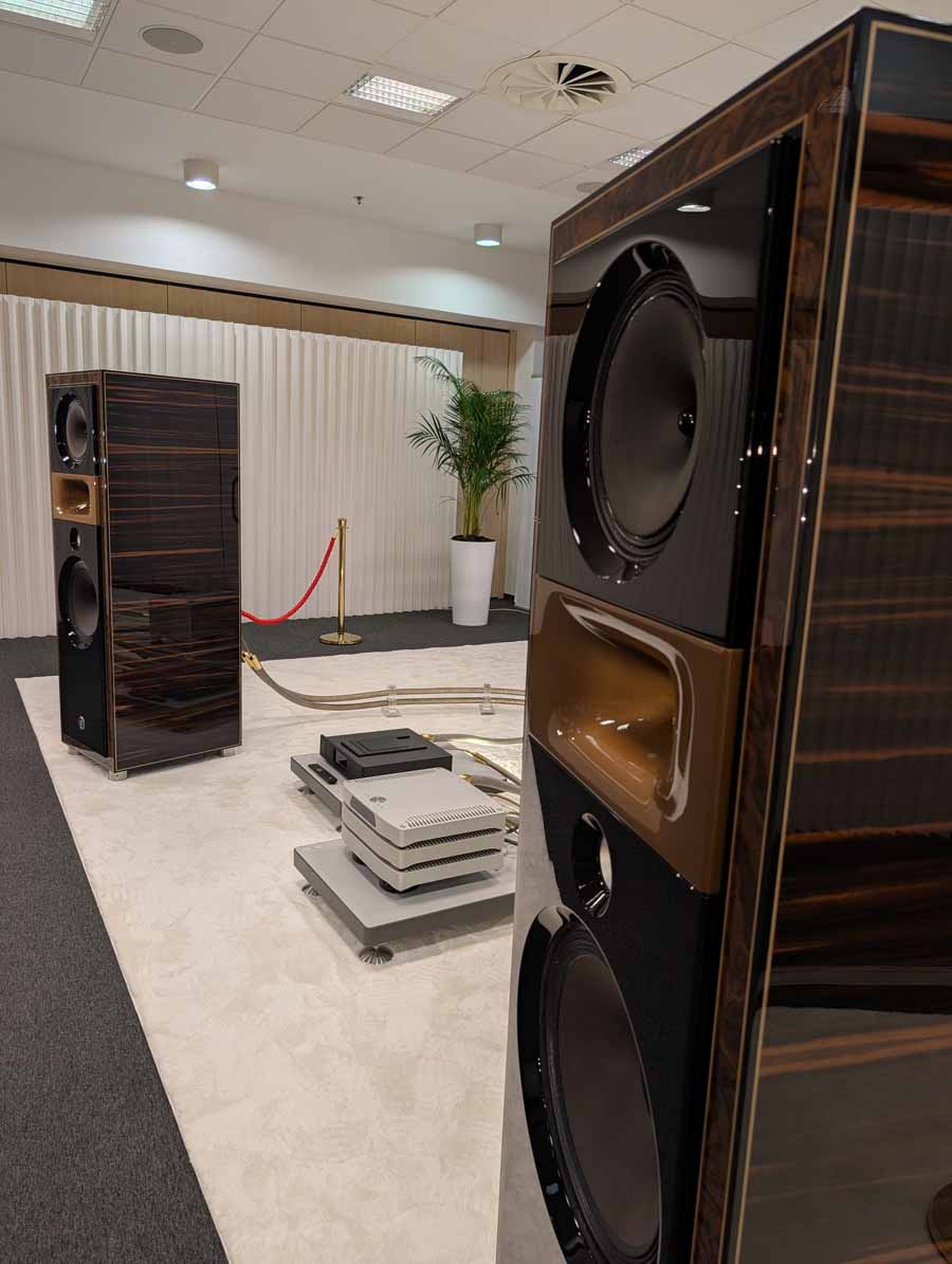 System one centred on Göbel Divin Noblesse with two Divin Sovereign subwoofers. The Noblesse uses AMT ribbon tweeters, large 8 inch midrange drivers, and two 12 inch woofers, with sensitivity up to 95 dB. We didn’t get to hear this system.