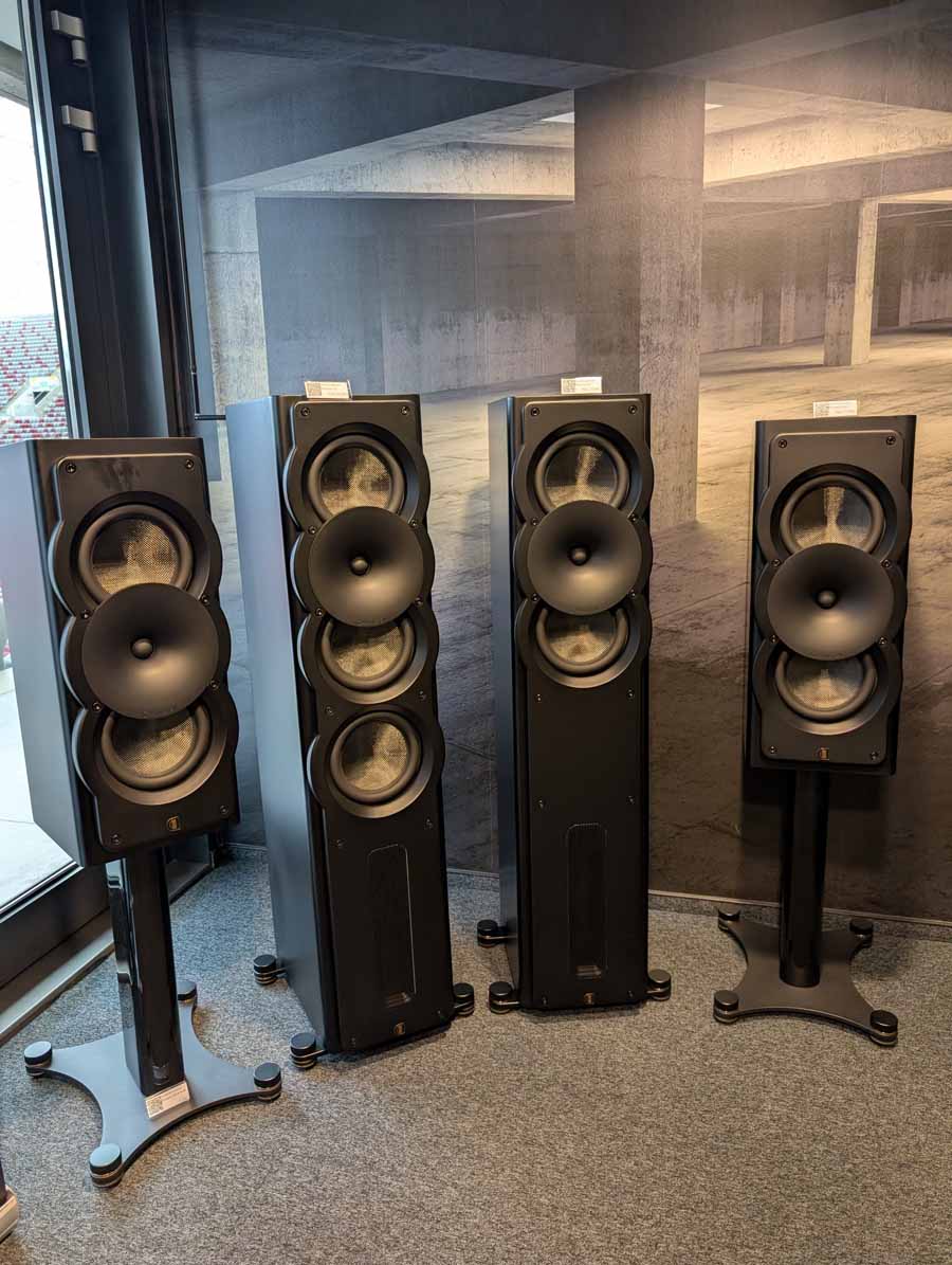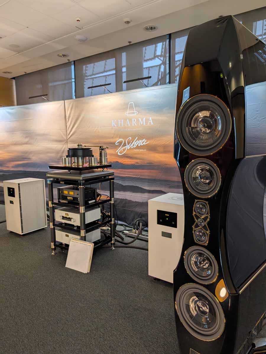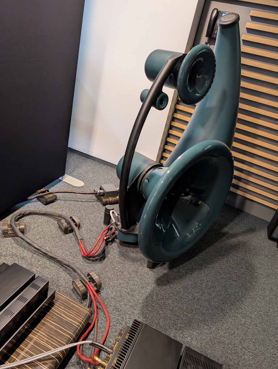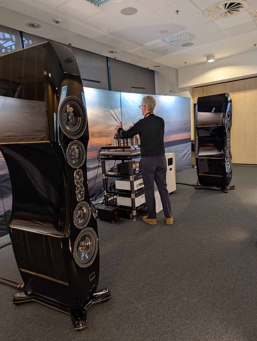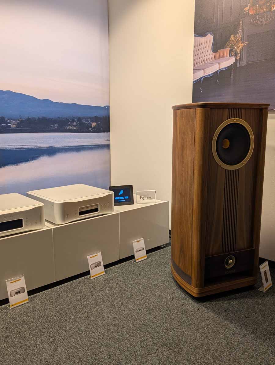 System one centred on Göbel Divin Noblesse with two Divin Sovereign subwoofers. The Noblesse uses AMT ribbon tweeters, large 8 inch midrange drivers, and two 12 inch woofers, with sensitivity up to 95 dB. We didn’t get to hear this system.
