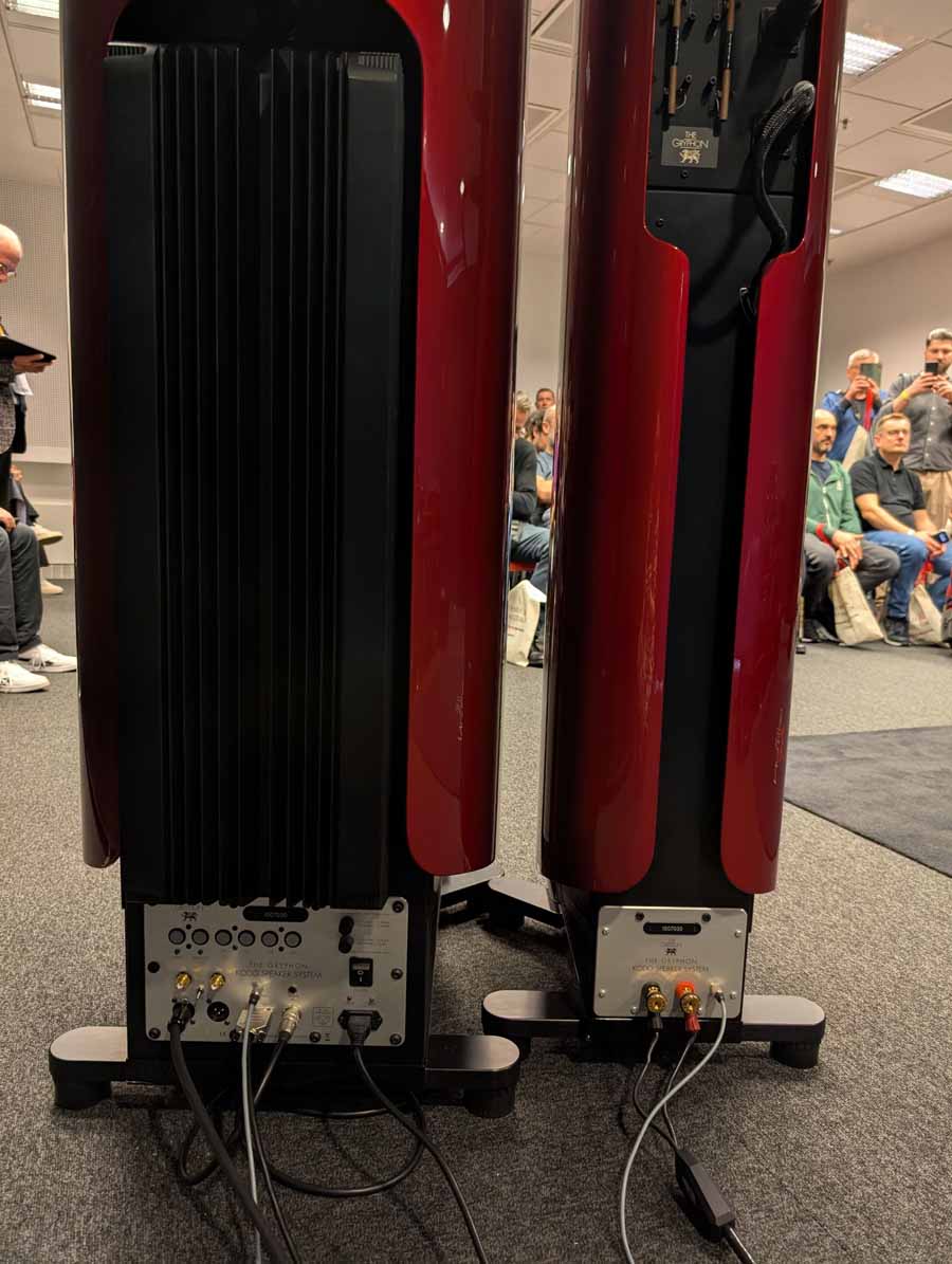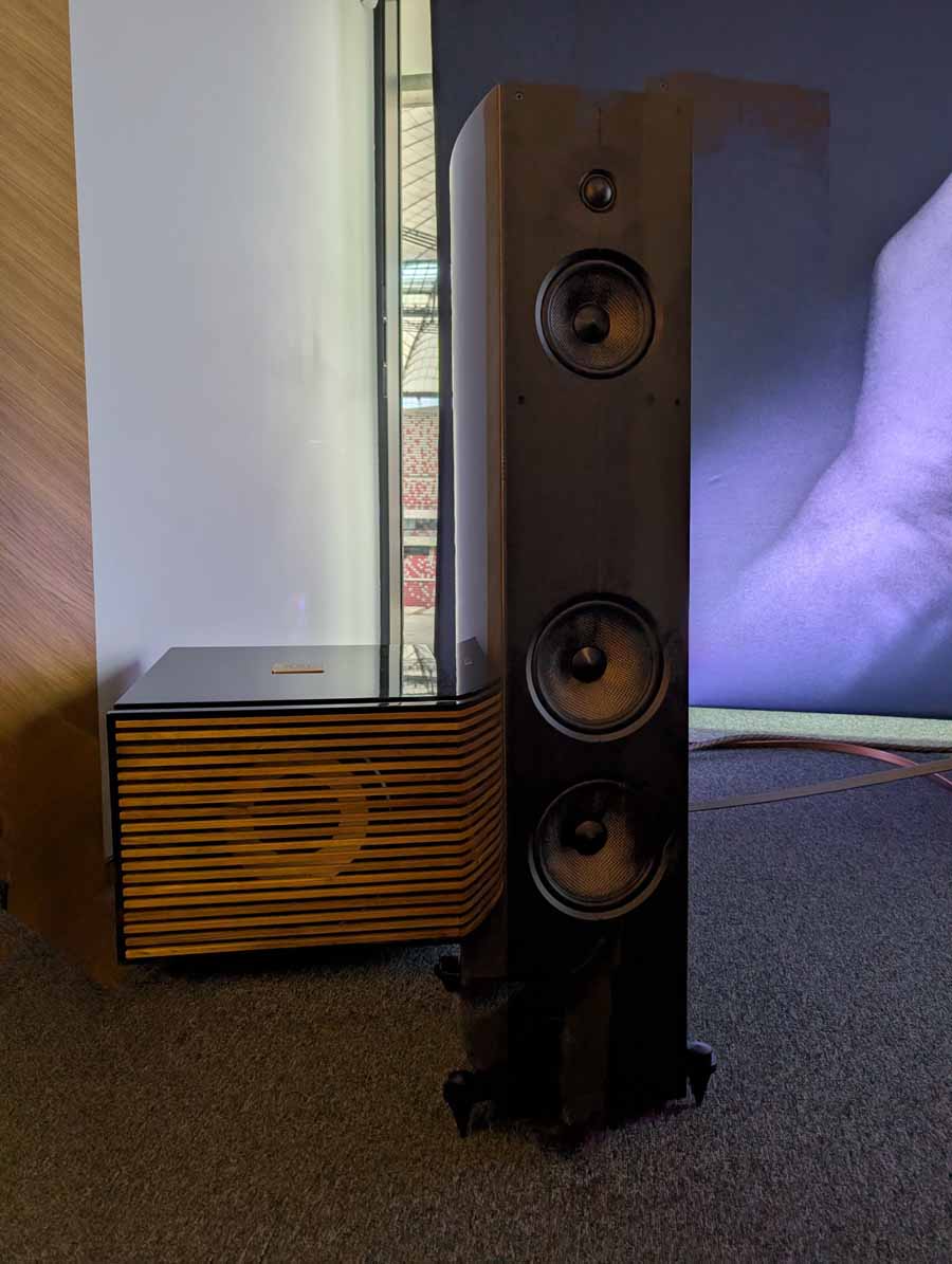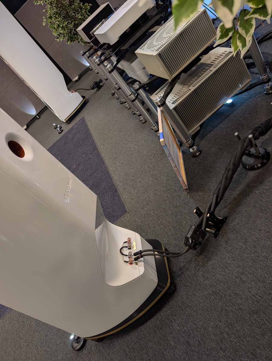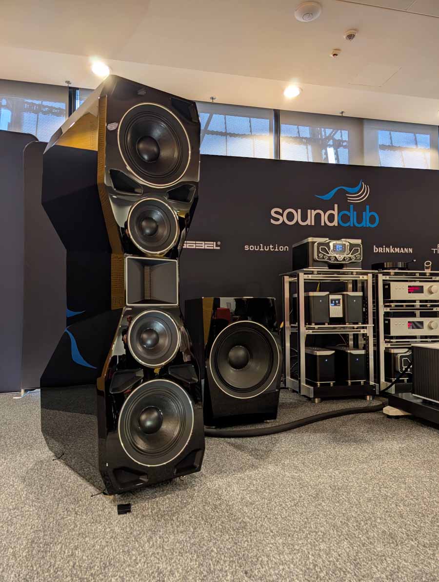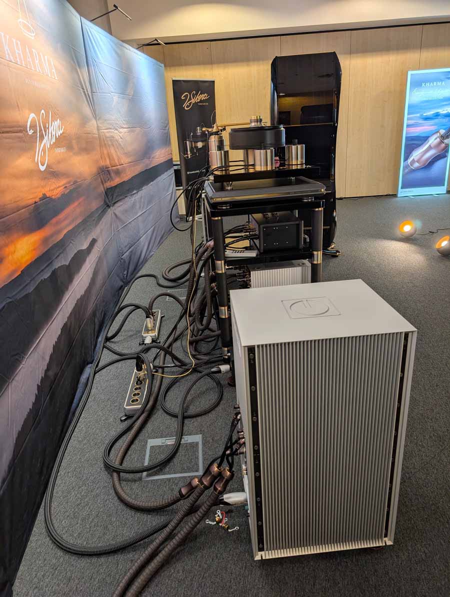System one centred on Göbel Divin Noblesse with two Divin Sovereign subwoofers. The Noblesse uses AMT ribbon tweeters, large 8 inch midrange drivers, and two 12 inch woofers, with sensitivity up to 95 dB. We didn’t get to hear this system.