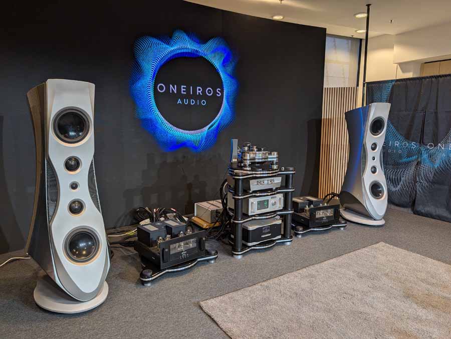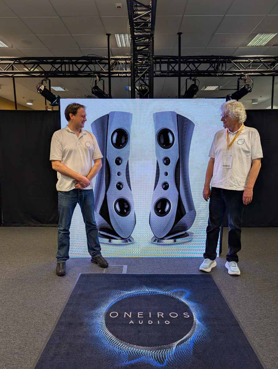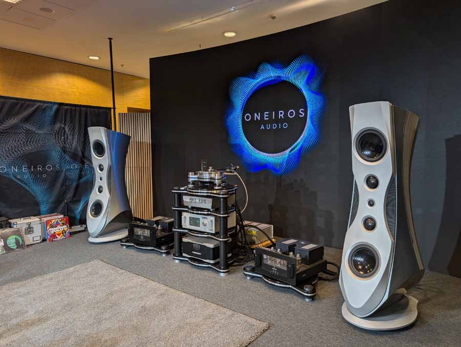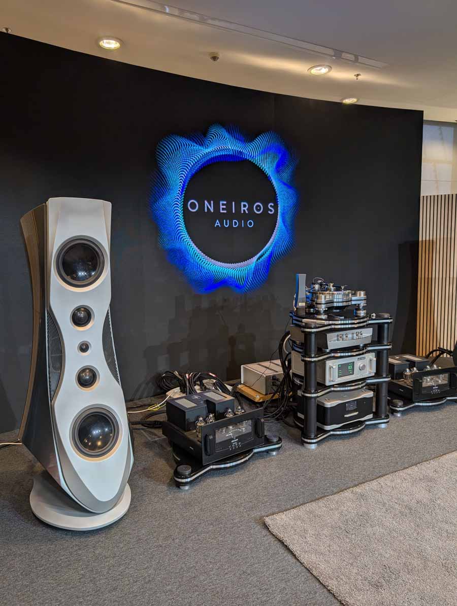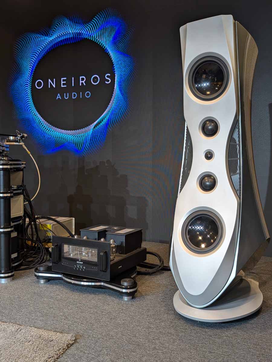 Falcon Acoustics from Oxford gave the European debut of their high end brand Oneiros, with their first loudspeakers at about £499,500. The design is a bit of a departure from the Falcon BBC style monitors while drawing on nearly sixty years of know how. Cabinets use advanced carbon composite sandwich panels. Each stands 160 cm tall and weighs120 kg. The system used Audio Research amplification, VPI turntables with DS Audio cartridges, AudioQuest cables, and GIK room treatment.