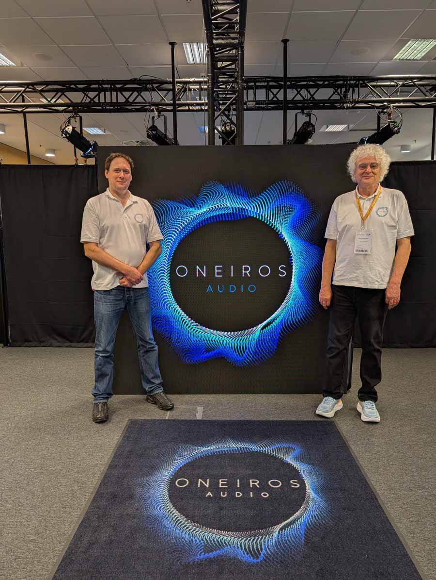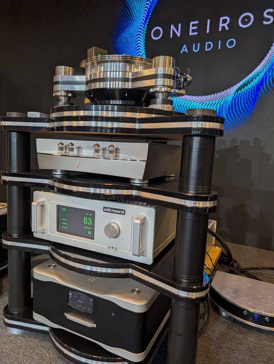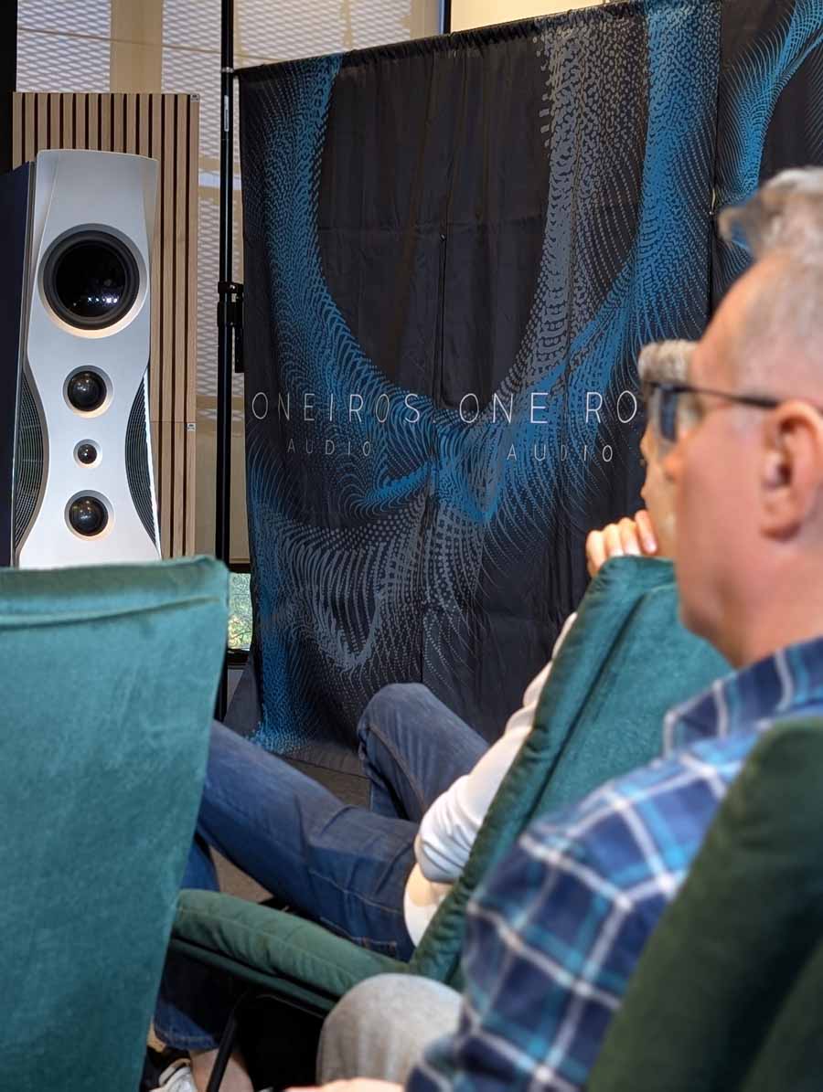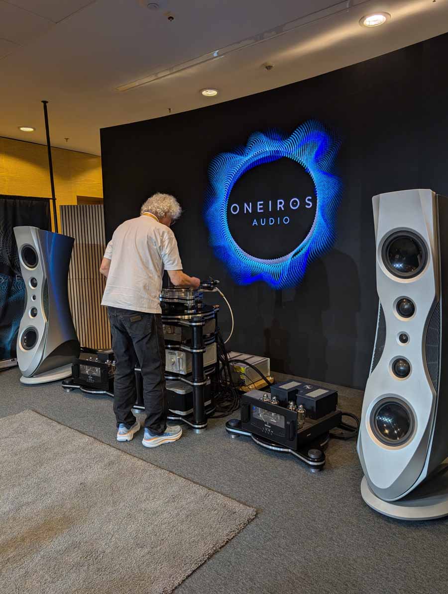 Falcon Acoustics from Oxford gave the European debut of their high end brand Oneiros, with their first loudspeakers at about £499,500. The design is a bit of a departure from the Falcon BBC style monitors while drawing on nearly sixty years of know how. Cabinets use advanced carbon composite sandwich panels. Each stands 160 cm tall and weighs120 kg. The system used Audio Research amplification, VPI turntables with DS Audio cartridges, AudioQuest cables, and GIK room treatment.