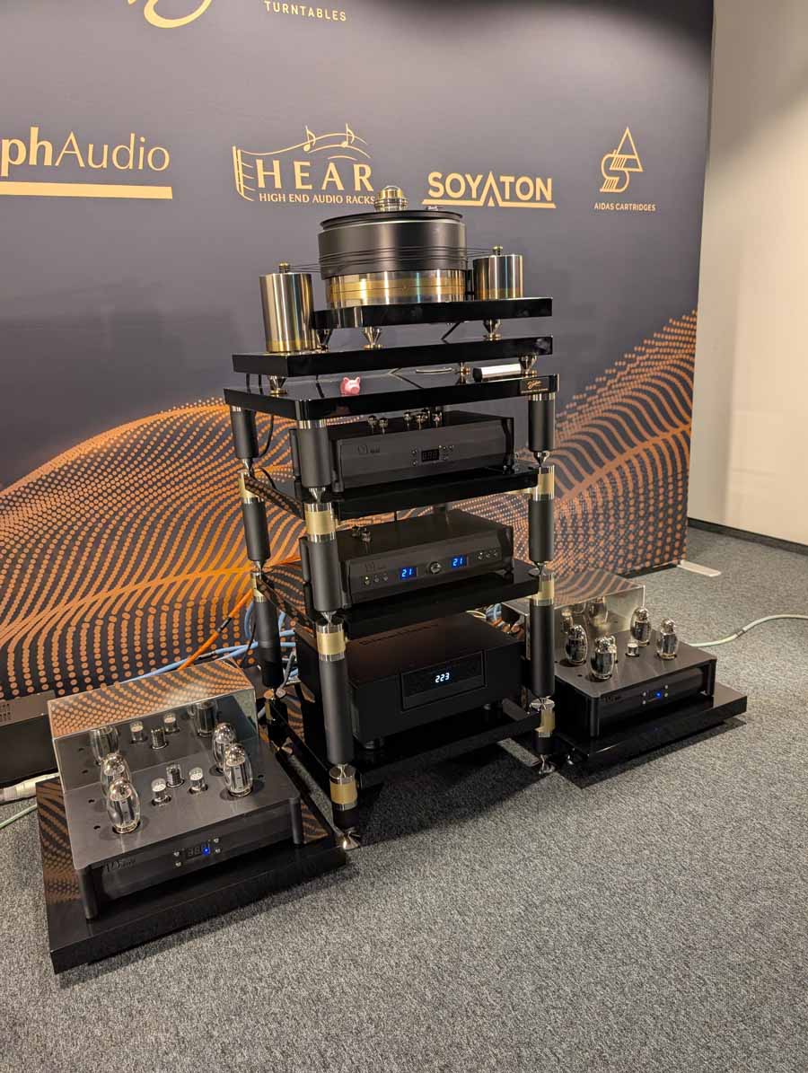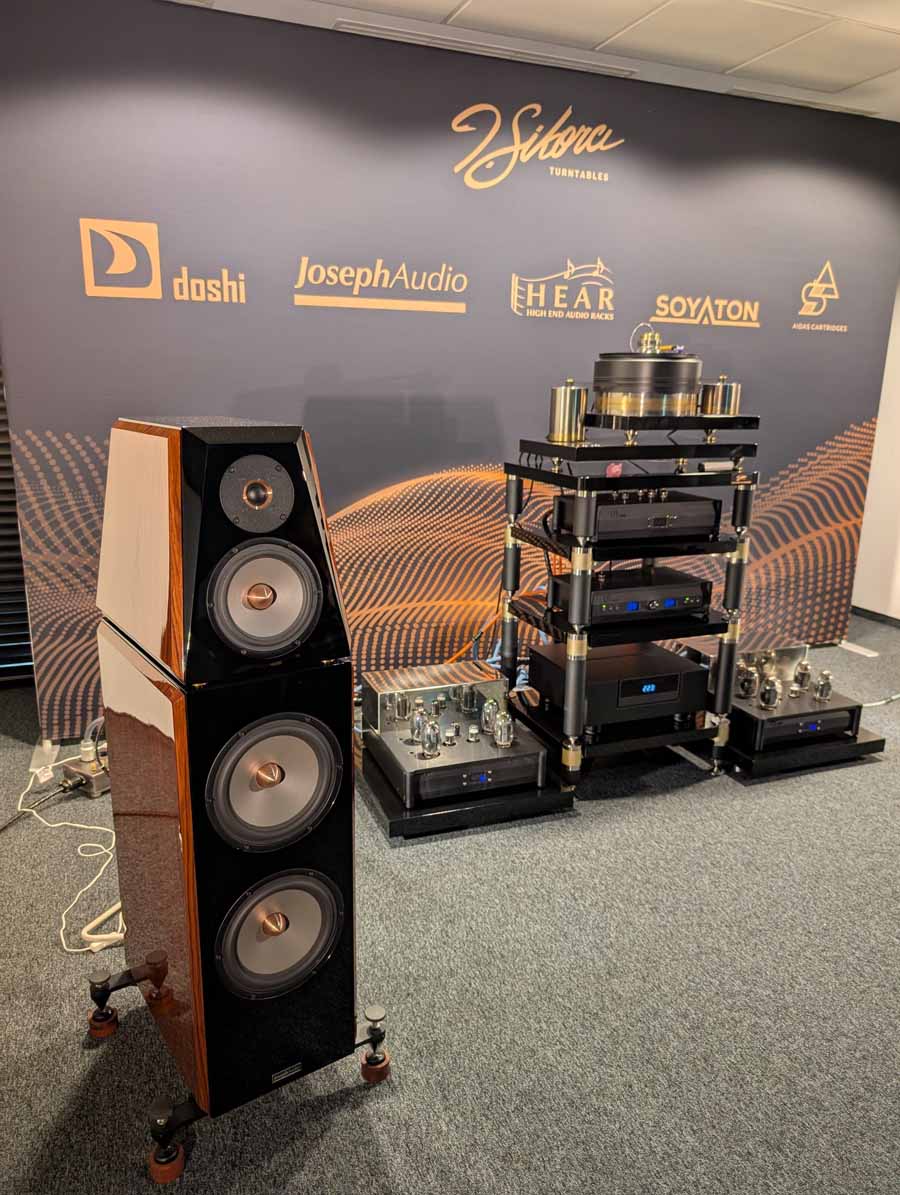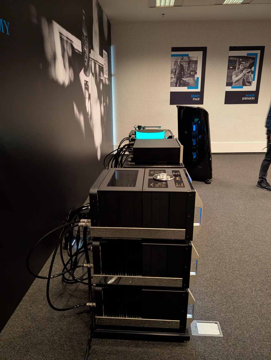 A pair of Point Source v10 floorstanders fronted this system with BAT stereo amplifier providing the juice. A pair of large Synthesis monos were on the floor, but we didn’t get to hear these. The V10 Master Edition were launched earlier this month and were designed by Andrew Jones. The MoFi SourcePoint V10 Master Edition builds upon the core design of the two-way SourcePoint 10, developing it into a full three-way floorstanding loudspeaker. Jones has added twin 10-inch woofers and dual rear-firing 10-inch passive radiators to create a more extended low-frequency performance while retaining the clarity and coherence associated with the original model. As its name suggests, the “V10” configuration refers to the use of five 10-inch elements. This design allows the custom 10-inch concentric driver, combining midrange and high frequencies, to operate within an optimised bandwidth, while the additional woofers handle bass duties. The result is intended to provide detailed and balanced performance across a wide frequency range, quoted as 27 Hz to 30 kHz.