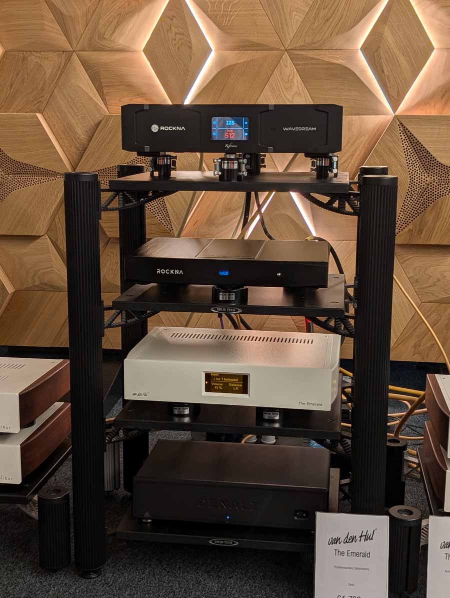 A rather gorgeous pair of Audio Solutions Vantage M floor standers in matt black with orange details fronted this system that was powered by Van den Hul The Excalibur power amps and The Emerald preamplifier. A Rokna Wavestream dealt with the digital front end. All cabling was (needless to say) by Van den Hul.
