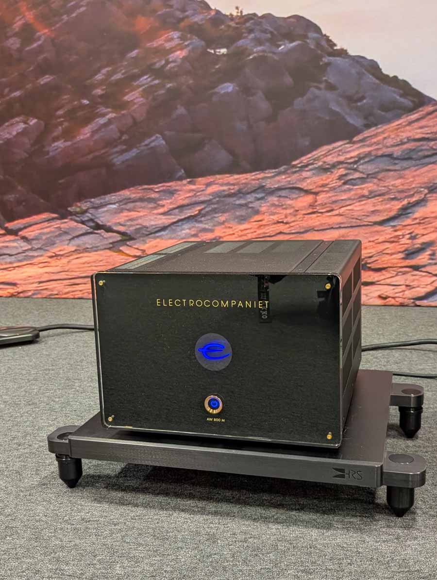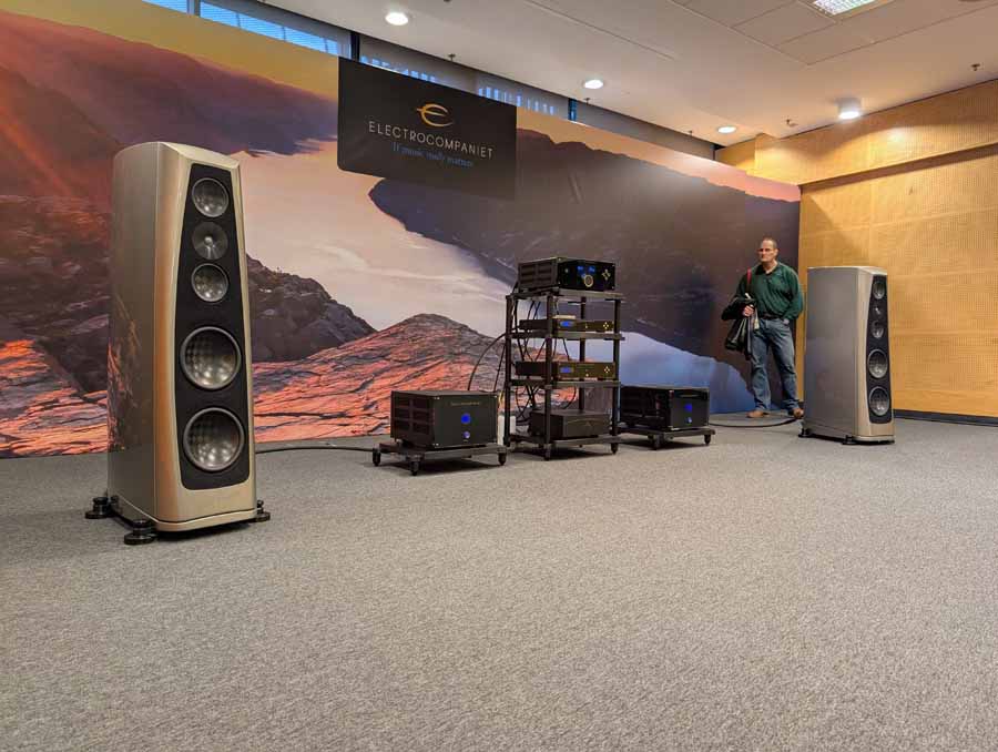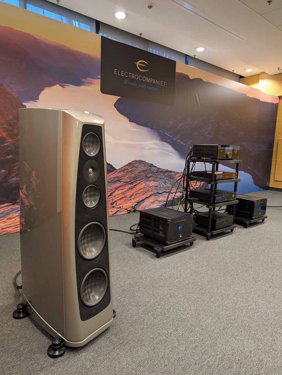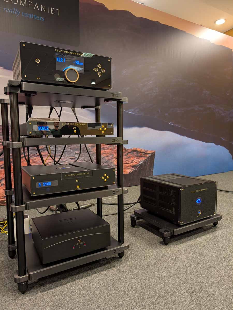 HiFi Club had a number of systems and rooms at the show, but in this one was a system featured Electrocompaniet AW 800 monoblocs, EC 5 Reference preamplifier, ECM 1 MkII streamer, and EMC 1 MkV CD player with Rockport Technologies Lyra loudspeakers.