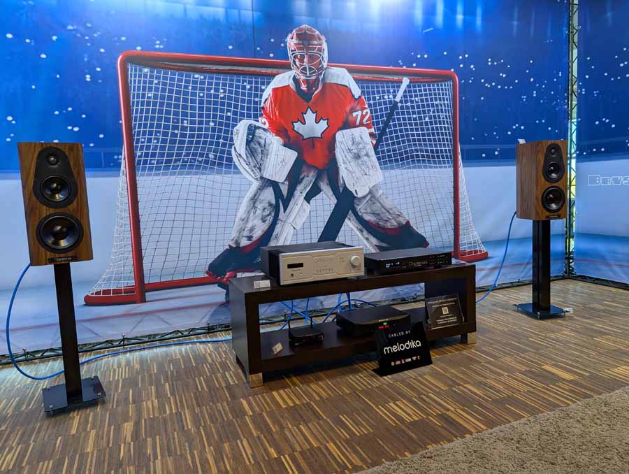 A slightly odd set up (but very effective) housed the Canadian brand Bryston who had a system playing that was fronted by their T10 loudspeakers. I say this was an odd set up because it wasn’t really a room, but an open area that had been cordoned off to make a room. Cabling was all by Melodika who were showing off their HiFi PiG award for the Sky Blue cables.